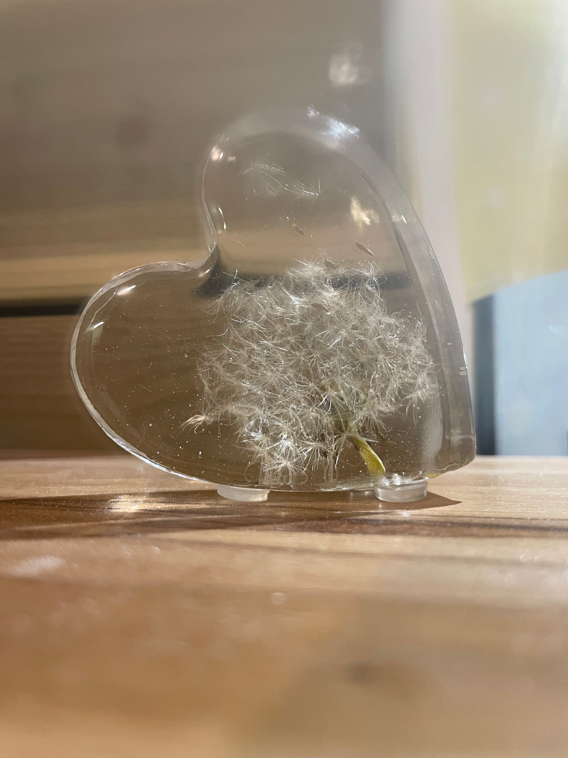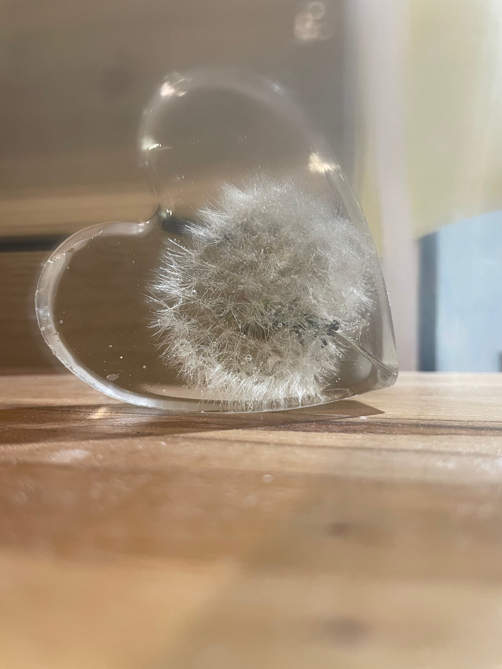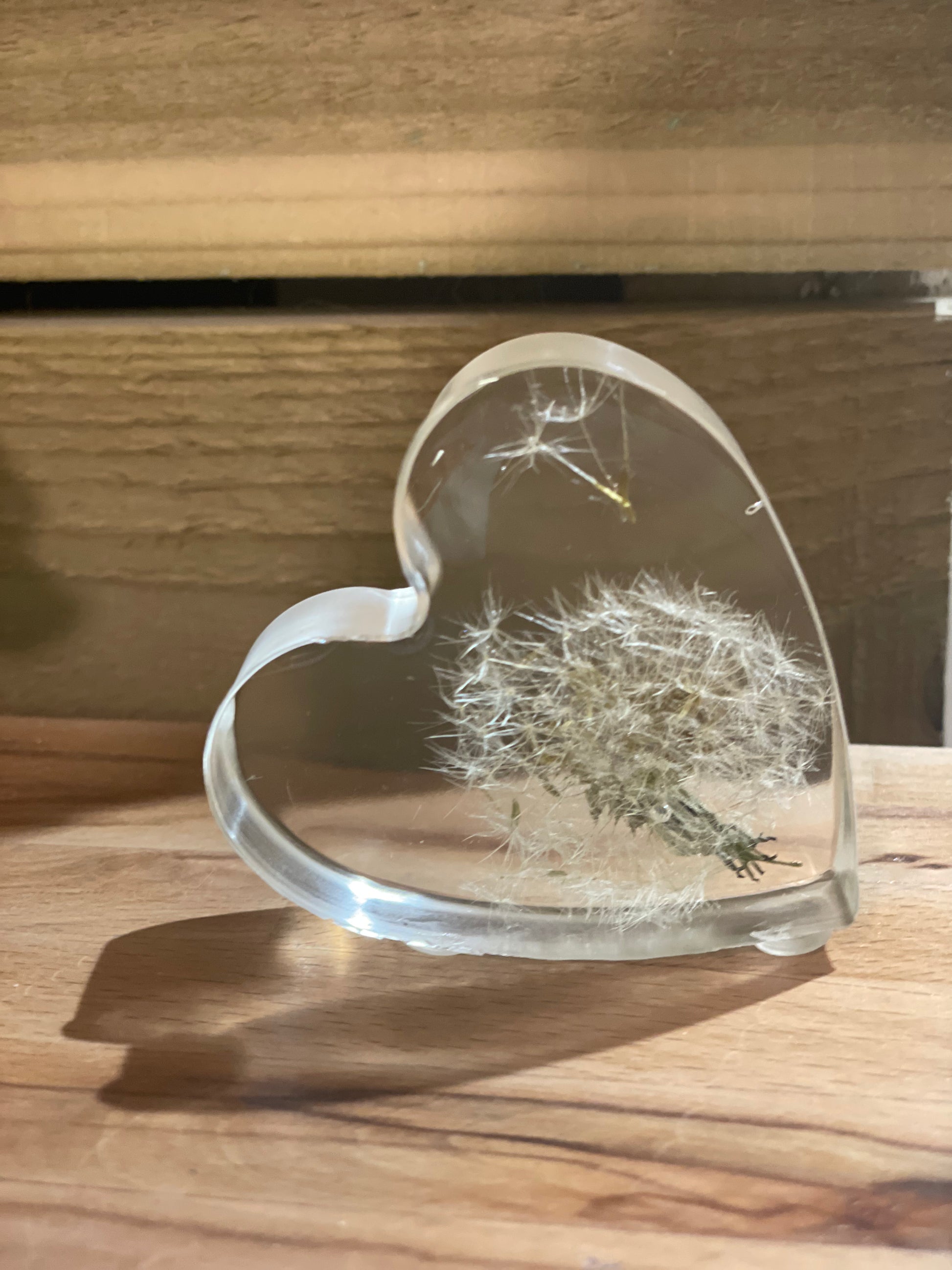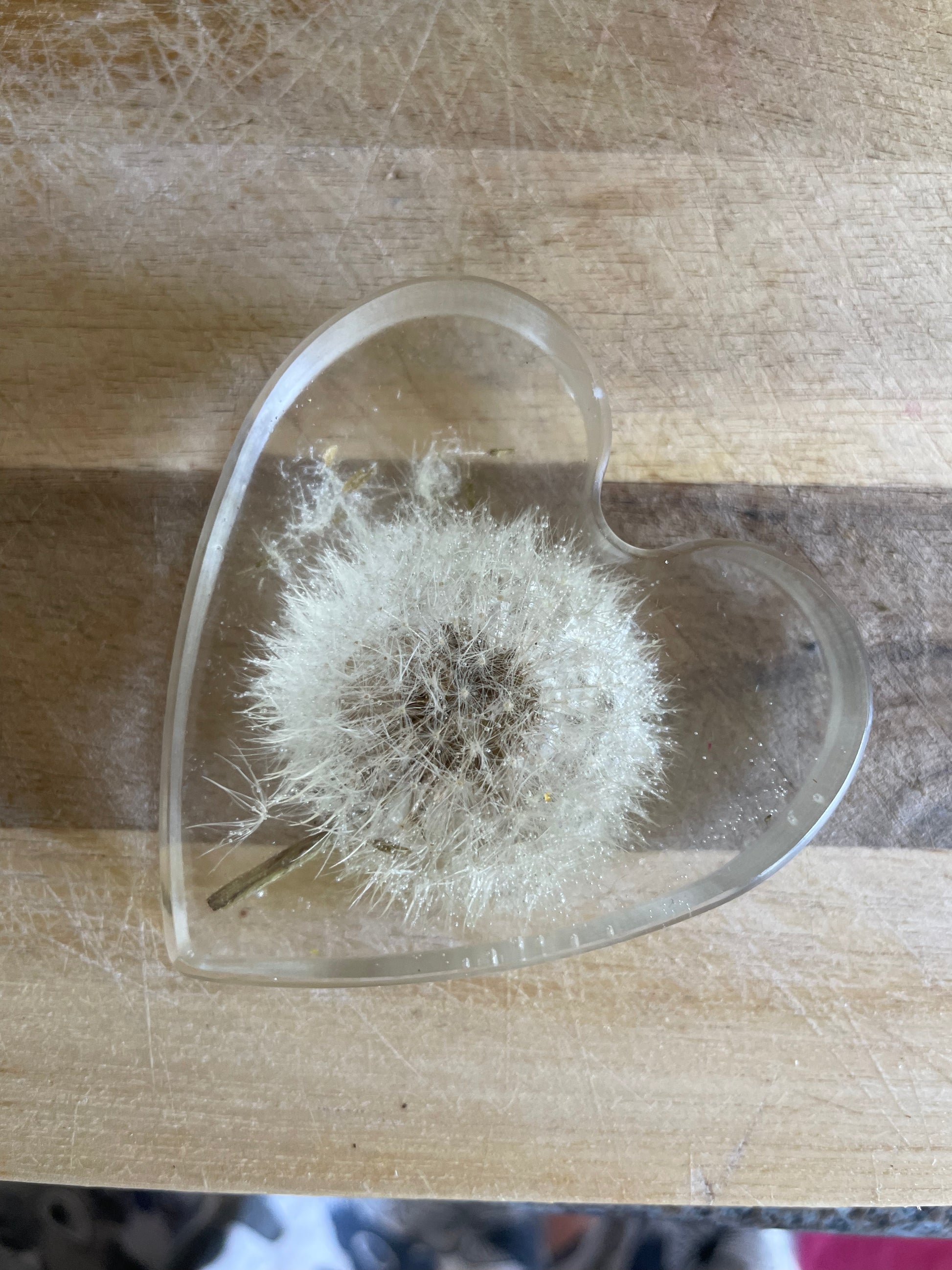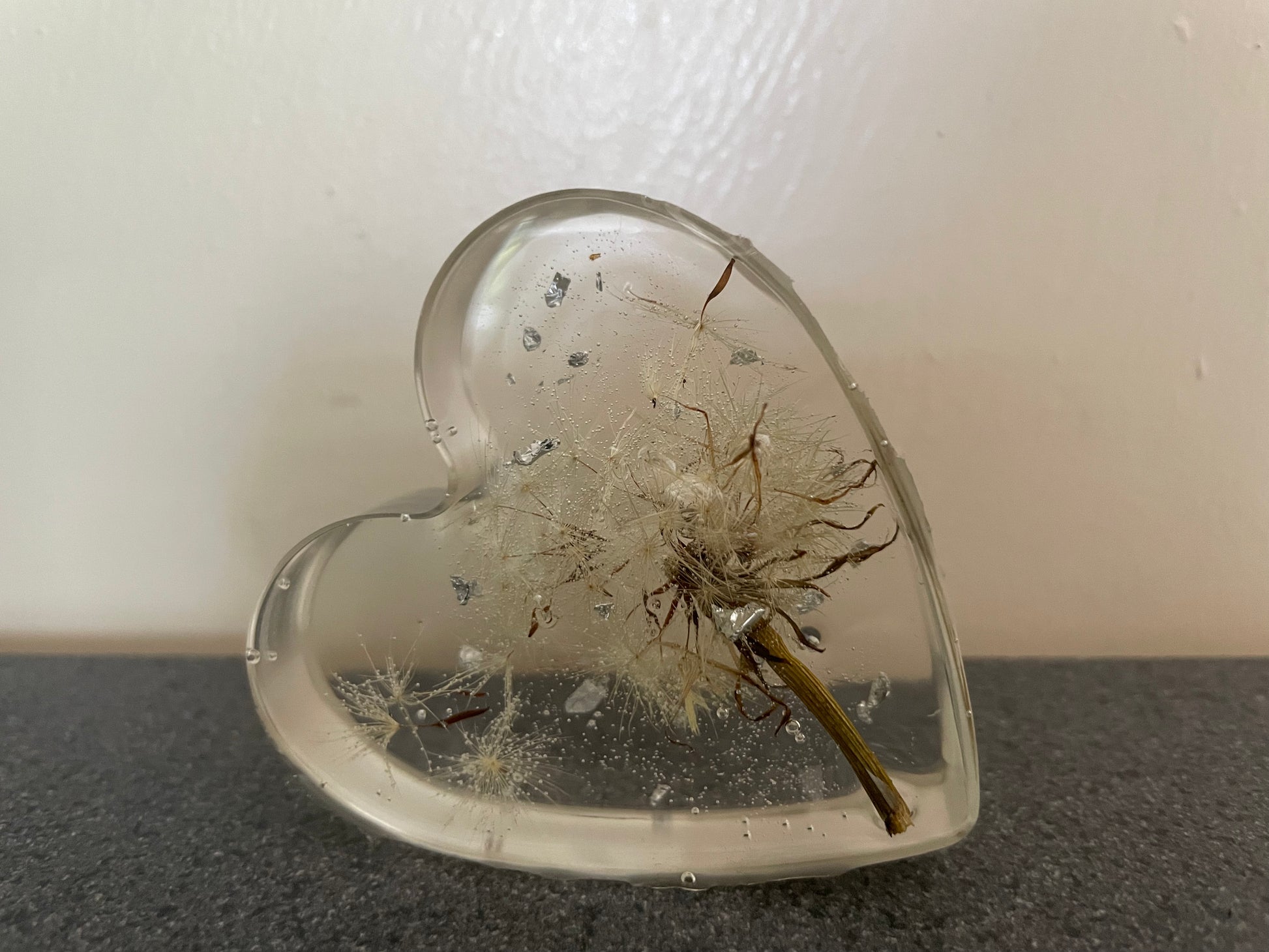 A beautiful free standing resin heart full of dandelion wishes and silver foil flecks for a touch of sparkle.