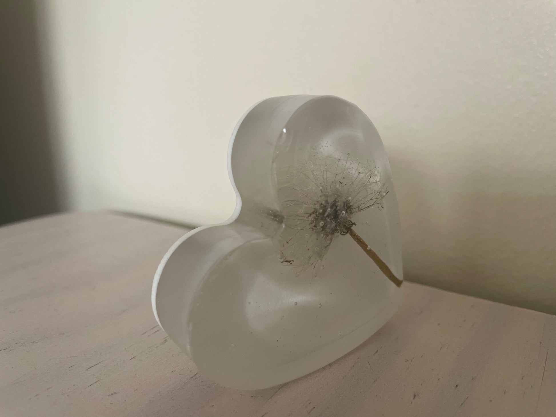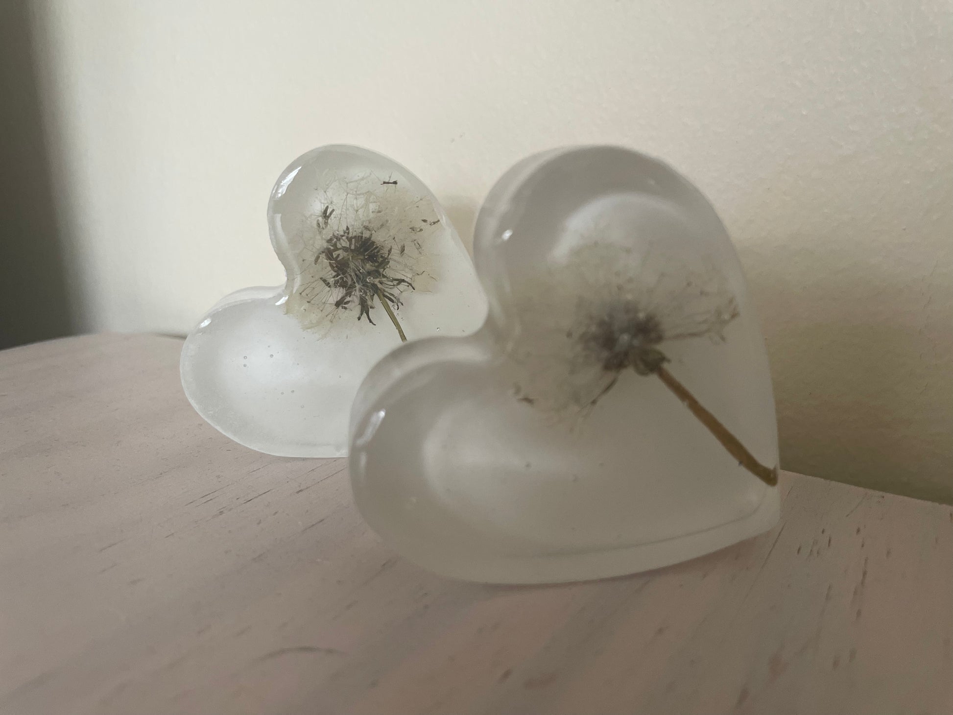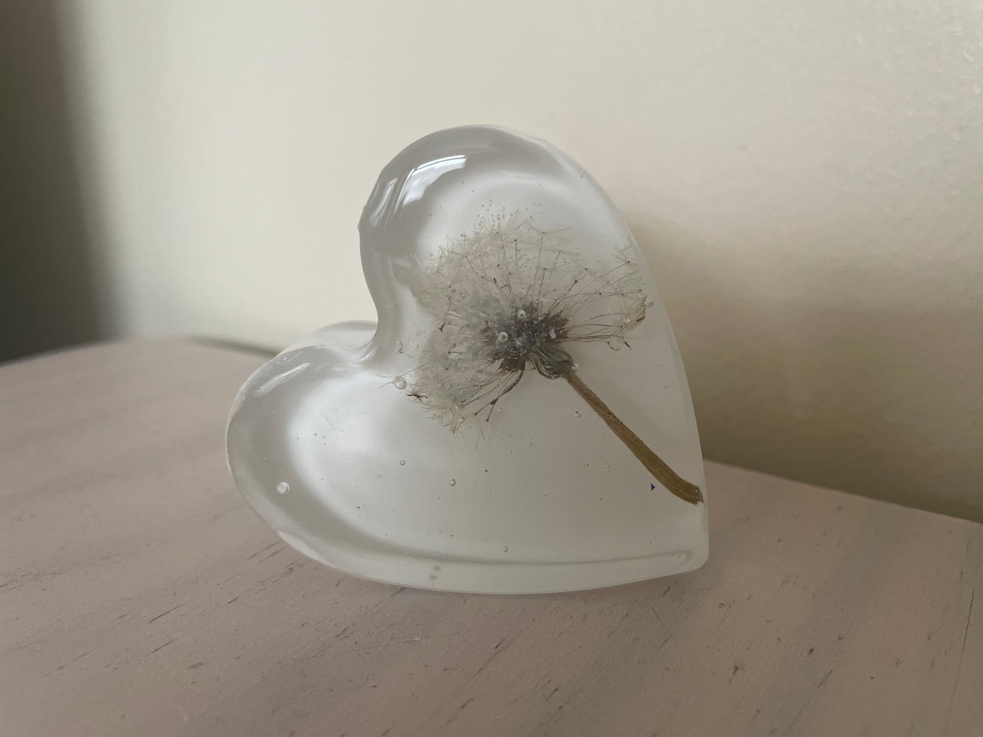 A beautiful free standing resin heart full of dandelion wishes set with a white background and choose either silver, gold or rose gold flecks for a touch of sparkle.