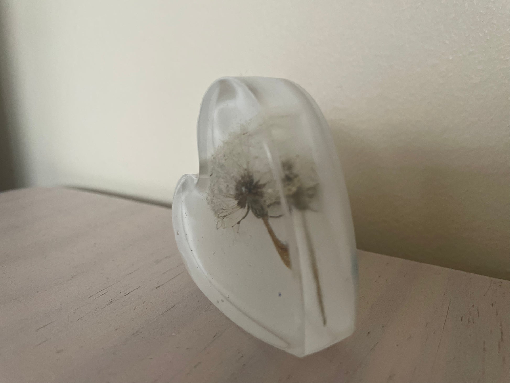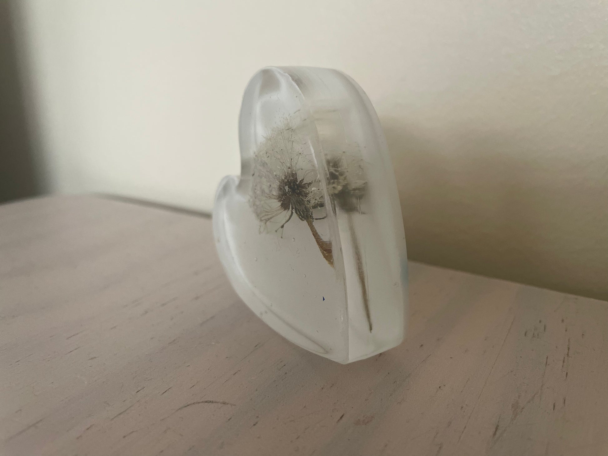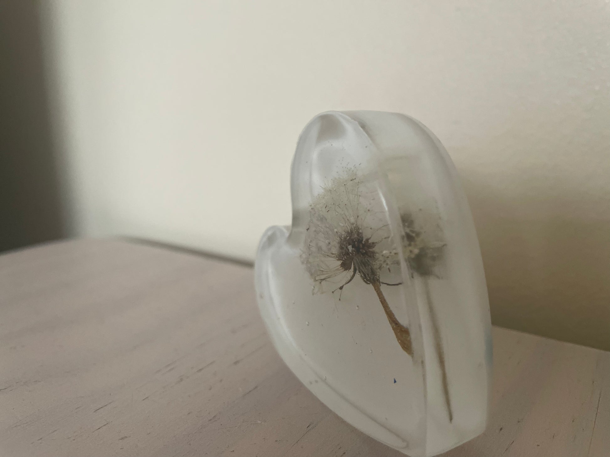A beautiful free standing resin heart full of dandelion wishes set with a white background and choose either silver, gold or rose gold flecks for a touch of sparkle.
