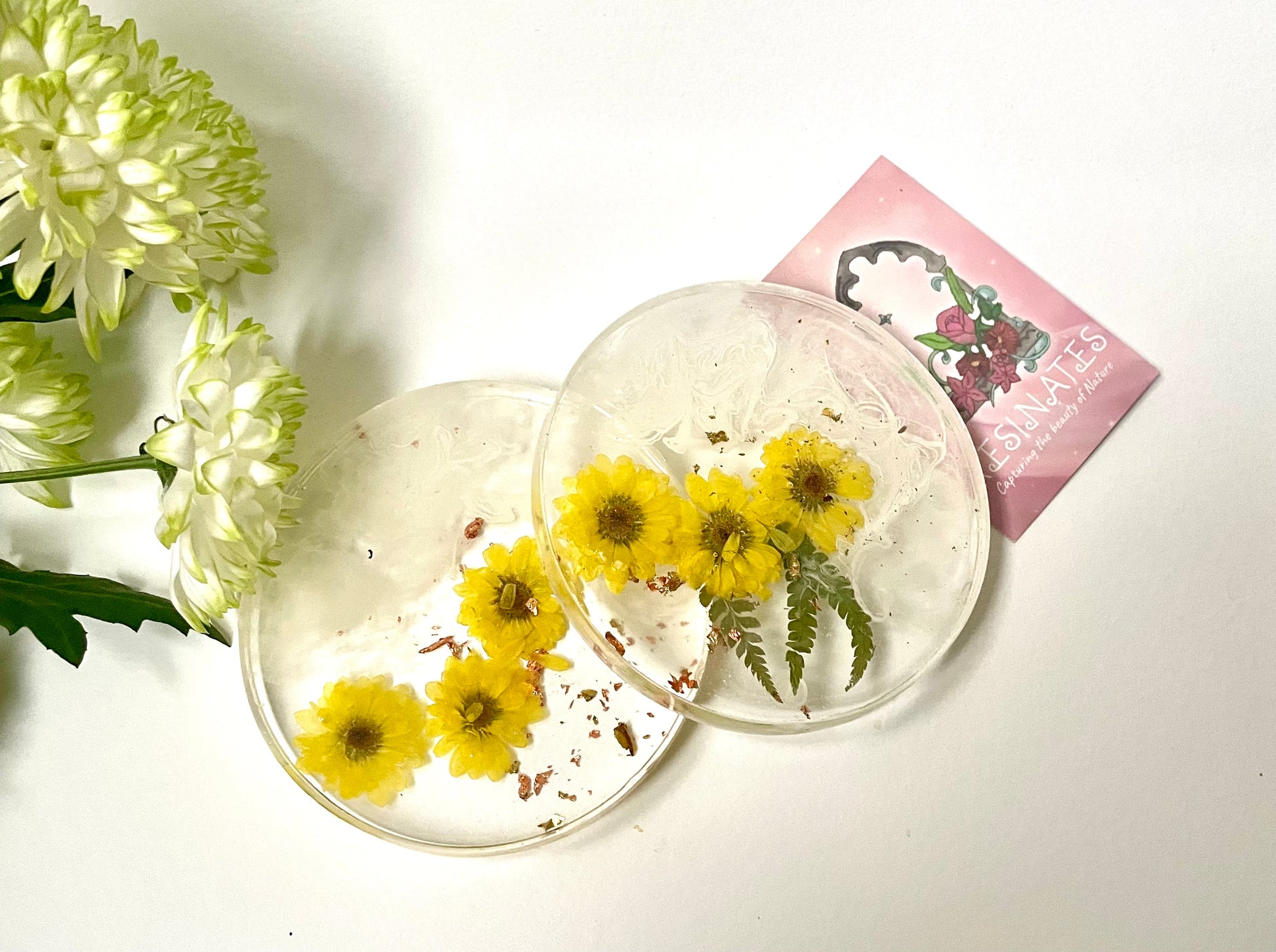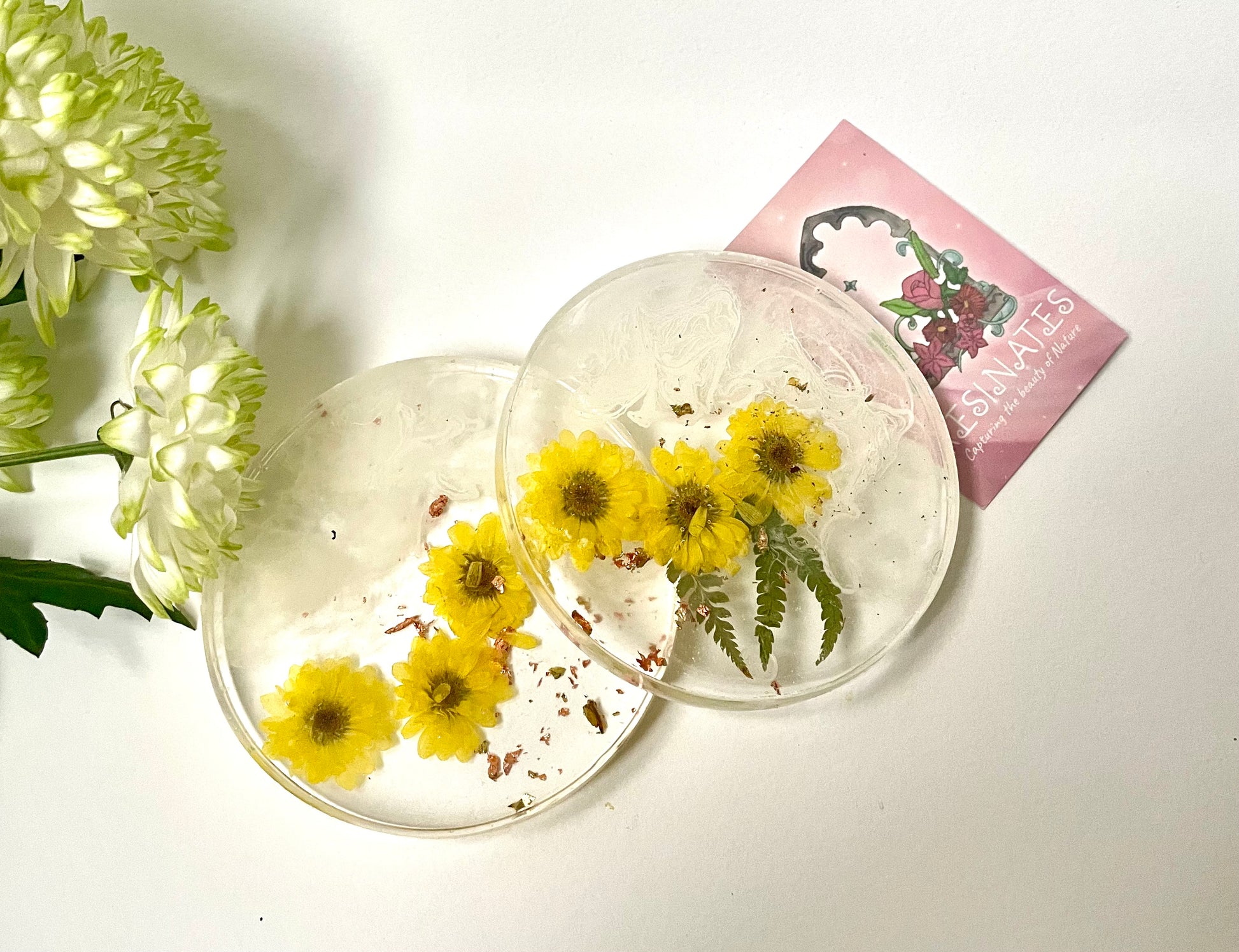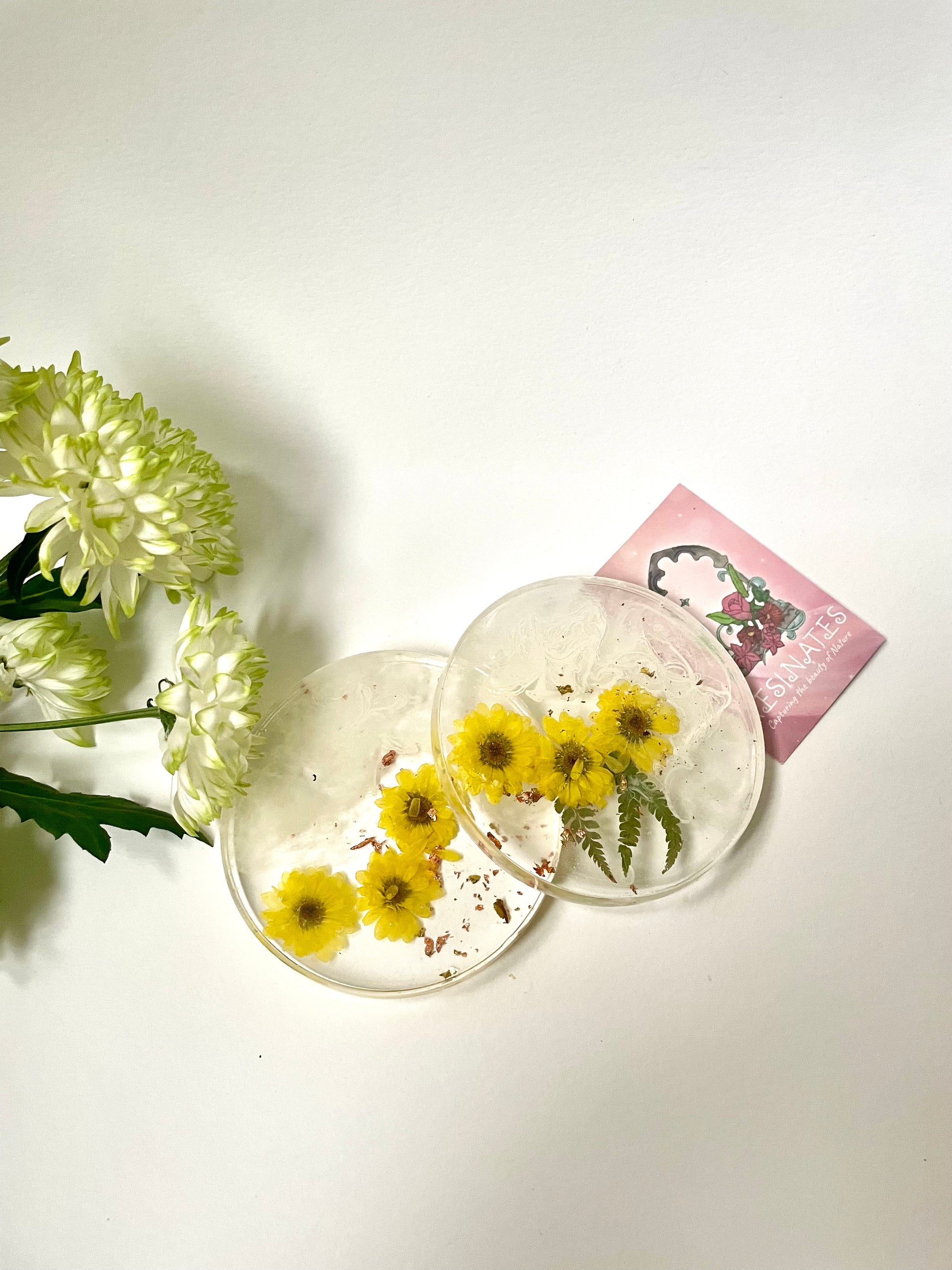 A beautiful set of two resin coasters full of real dried flowers