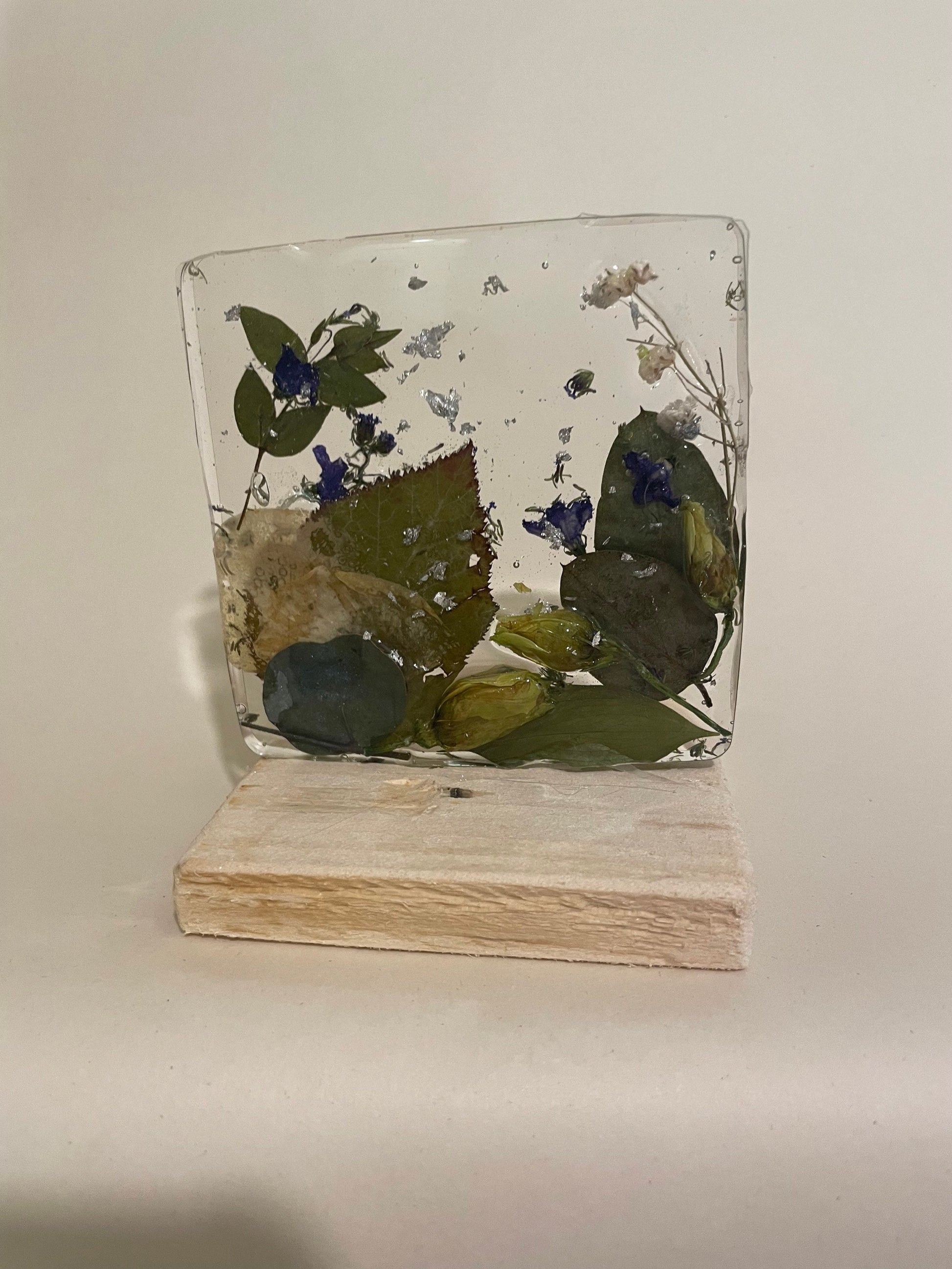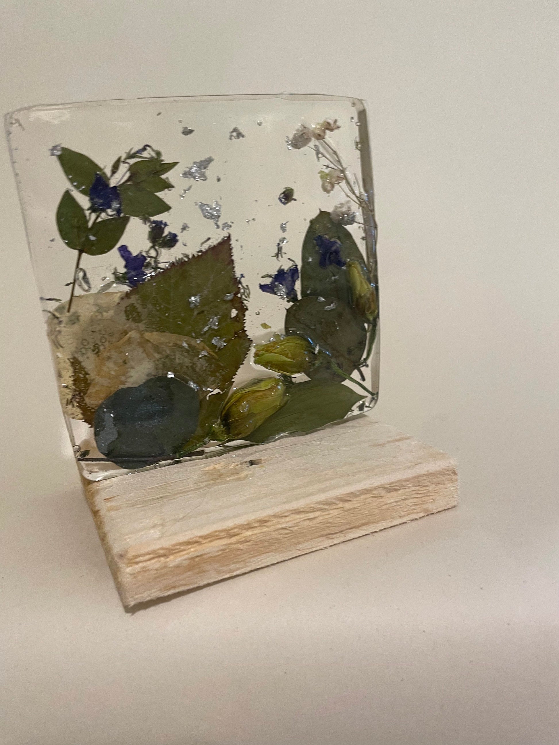 These beautiful flower scenes are made from real flowers, leaves and foliage, set in resin and displayed on a wooden stand. These are handmade to order so each is unique.