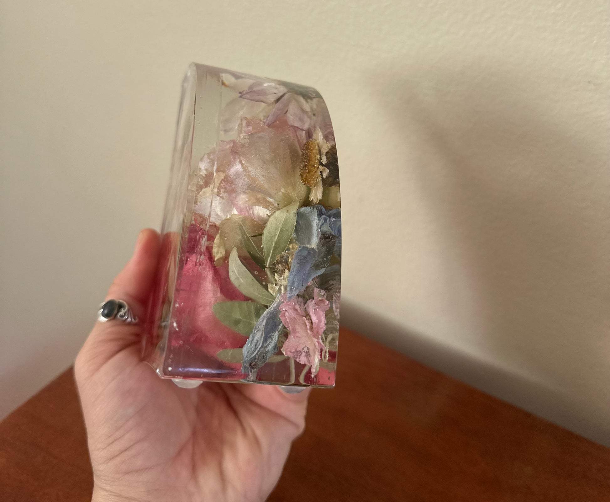 Your flowers preserved and set in high quality, non toxic, uv resistant resin.