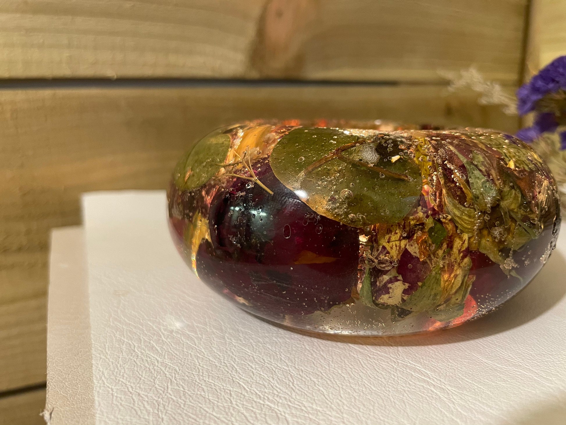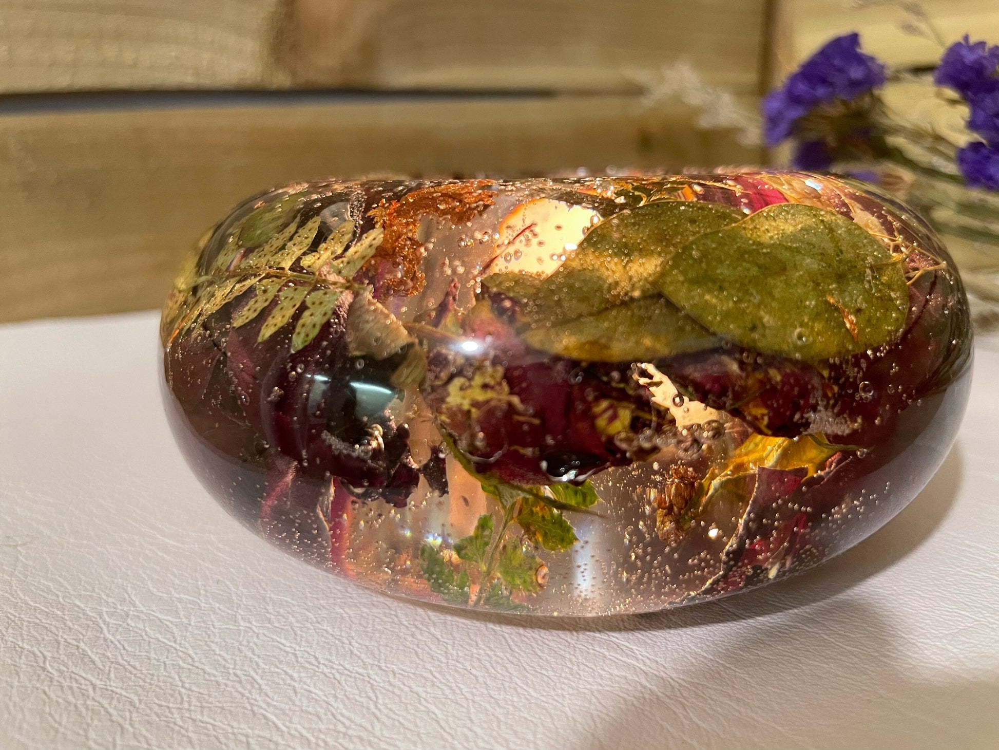 Please be aware that because this item is handmade, each disc will vary in design. There may be minor air bubbles, however, we will try my best to limit these imperfections. Not all flowers preserve their natural color, most flowers dry darker than their original color and some will dry translucent.