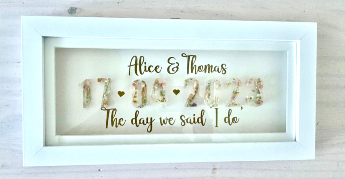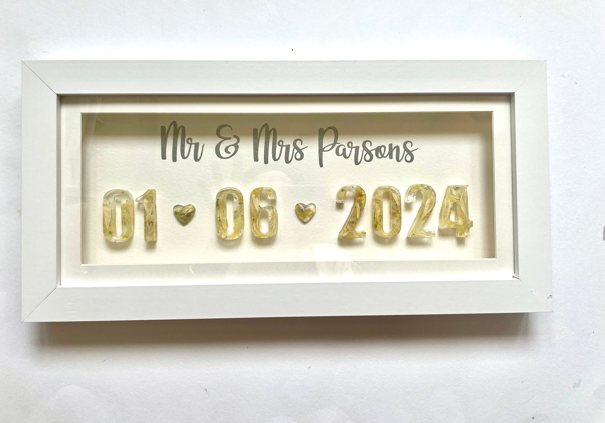 A classic white frame with resin numbers to make a beautiful gift to remember your special day