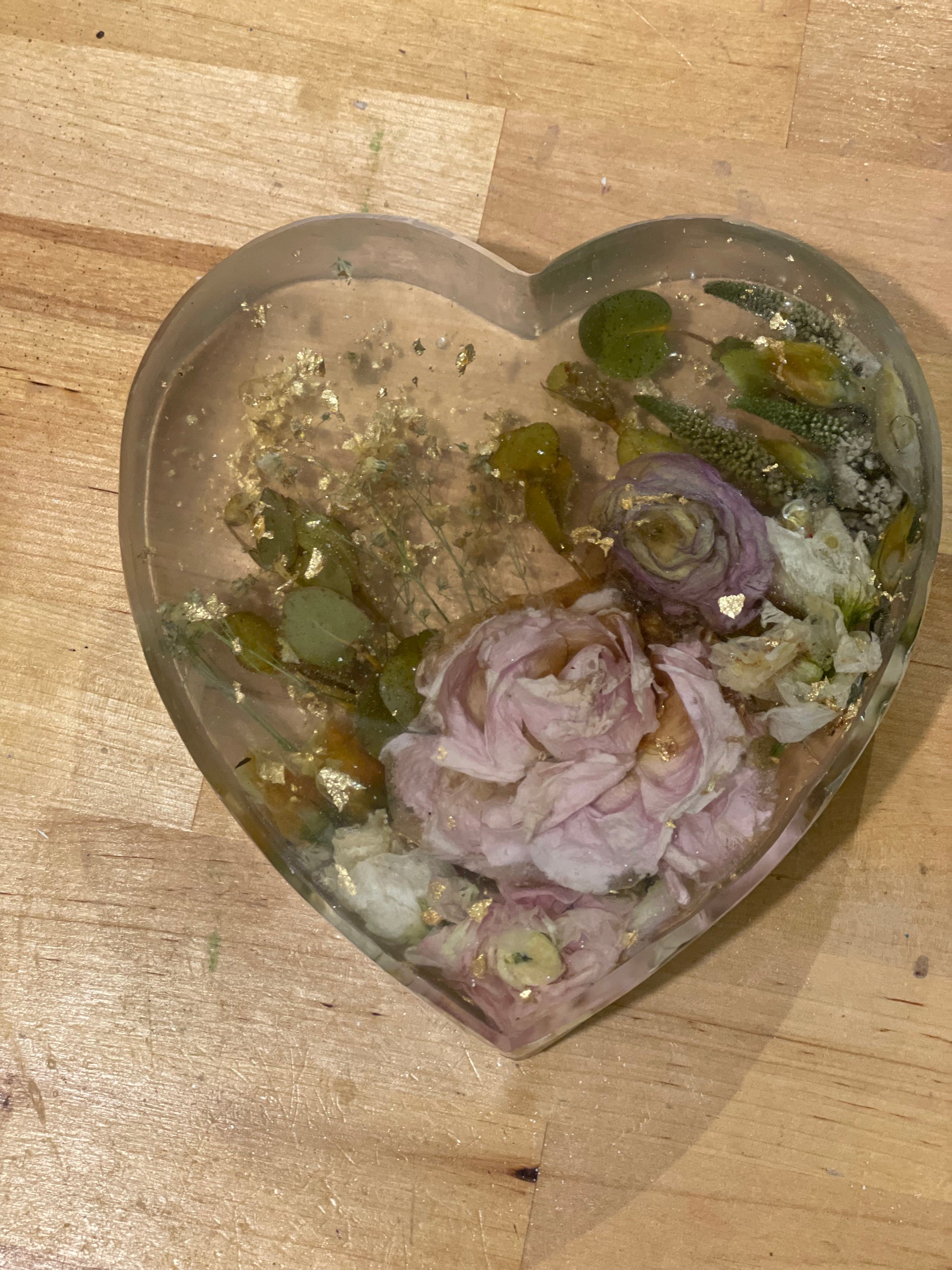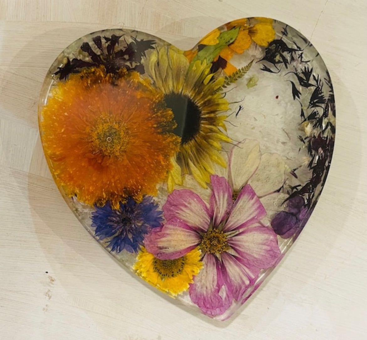 Please be aware that because this item is handmade, each heart will vary in design. There may be minor air bubbles, however, we will try my best to limit these imperfections. Not all flowers preserve their natural color, most flowers dry darker than their original color and some will dry translucent.