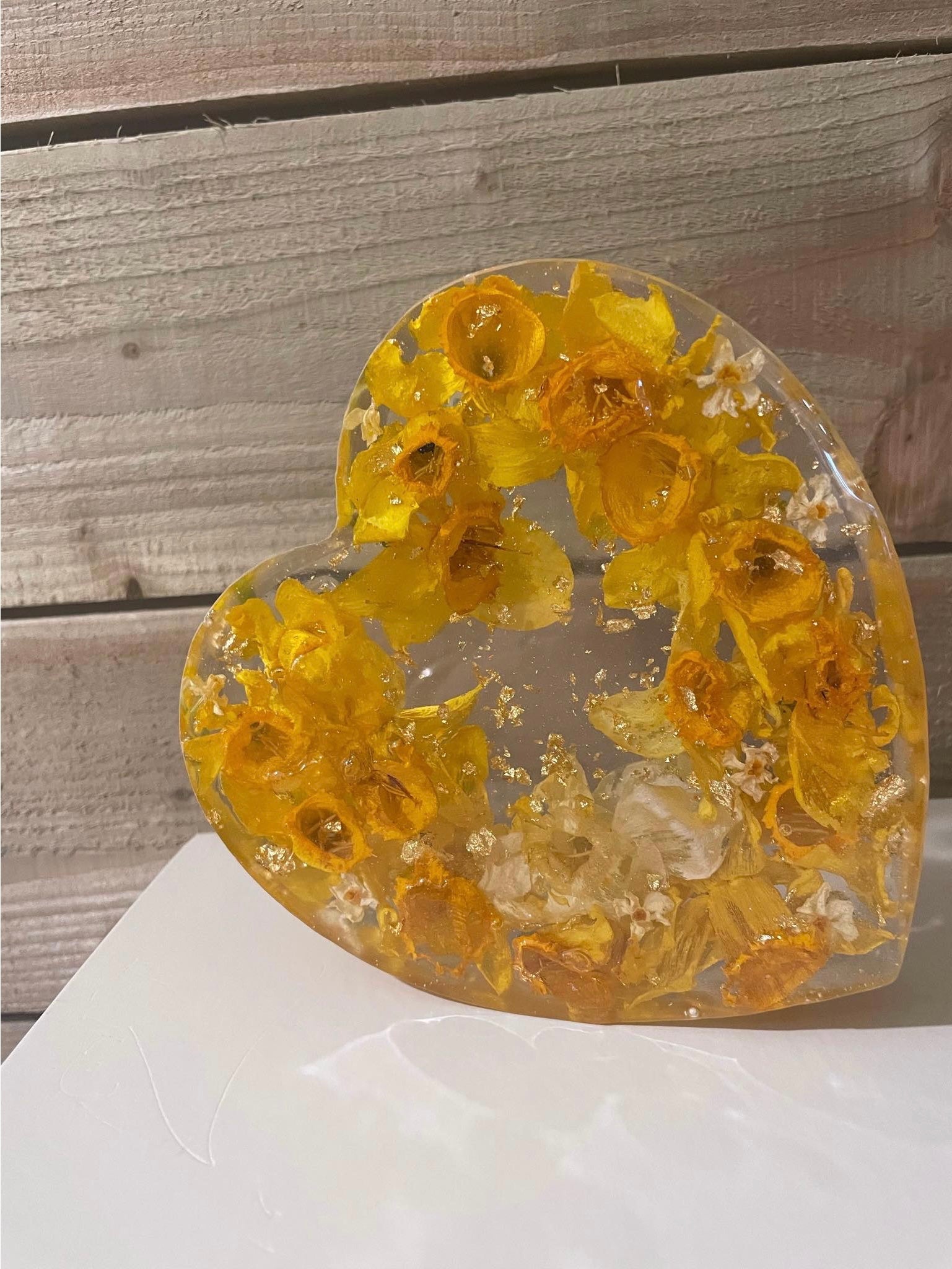 Please avoid bright windows and direct sunlight on your resin heart . Although UV resistant resin is used, this can still fade/ discolour over time.