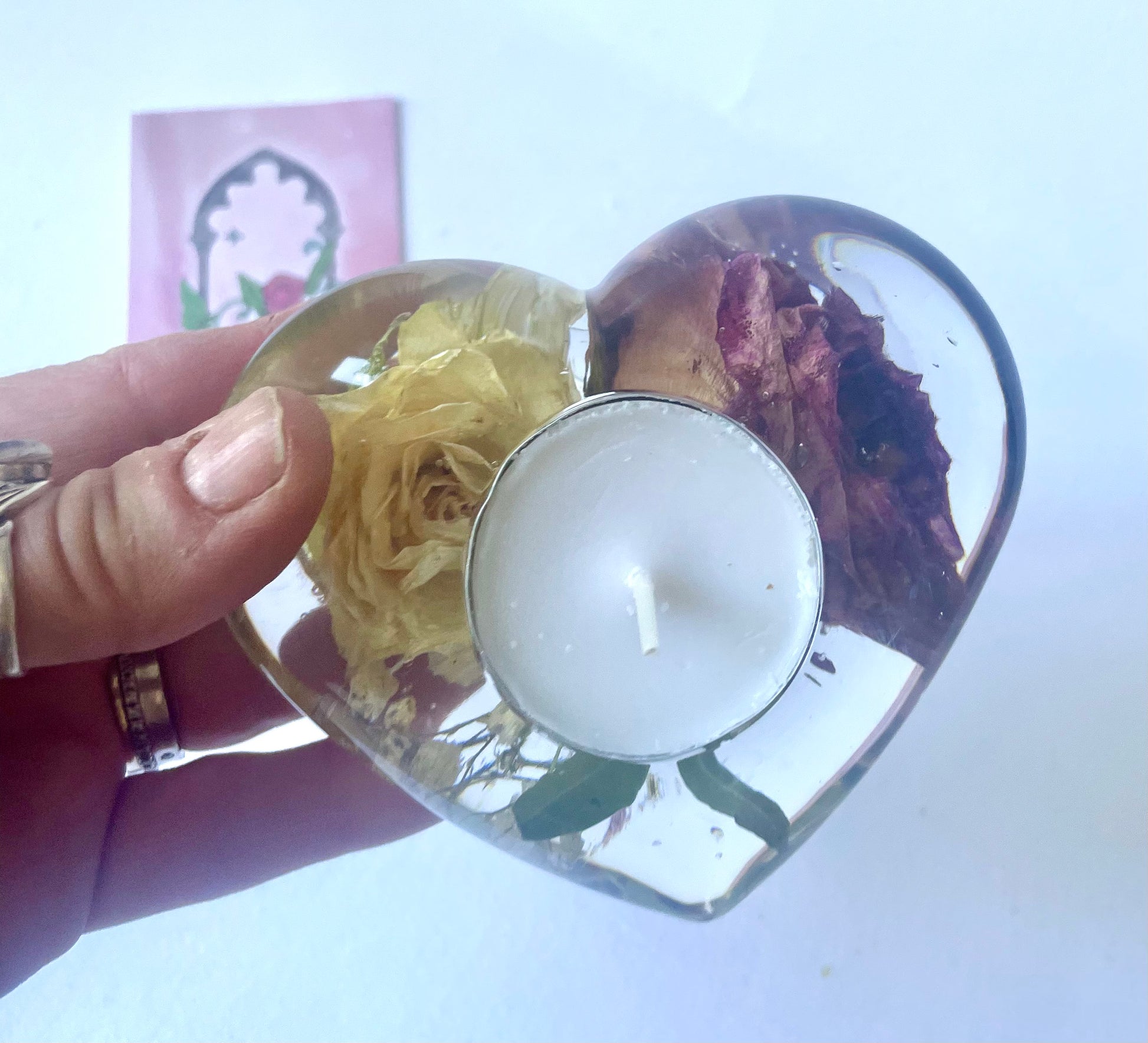 Please avoid bright windows and direct sunlight on your resin heart . Although UV resistant resin is used, this can still fade/ discolour over time.