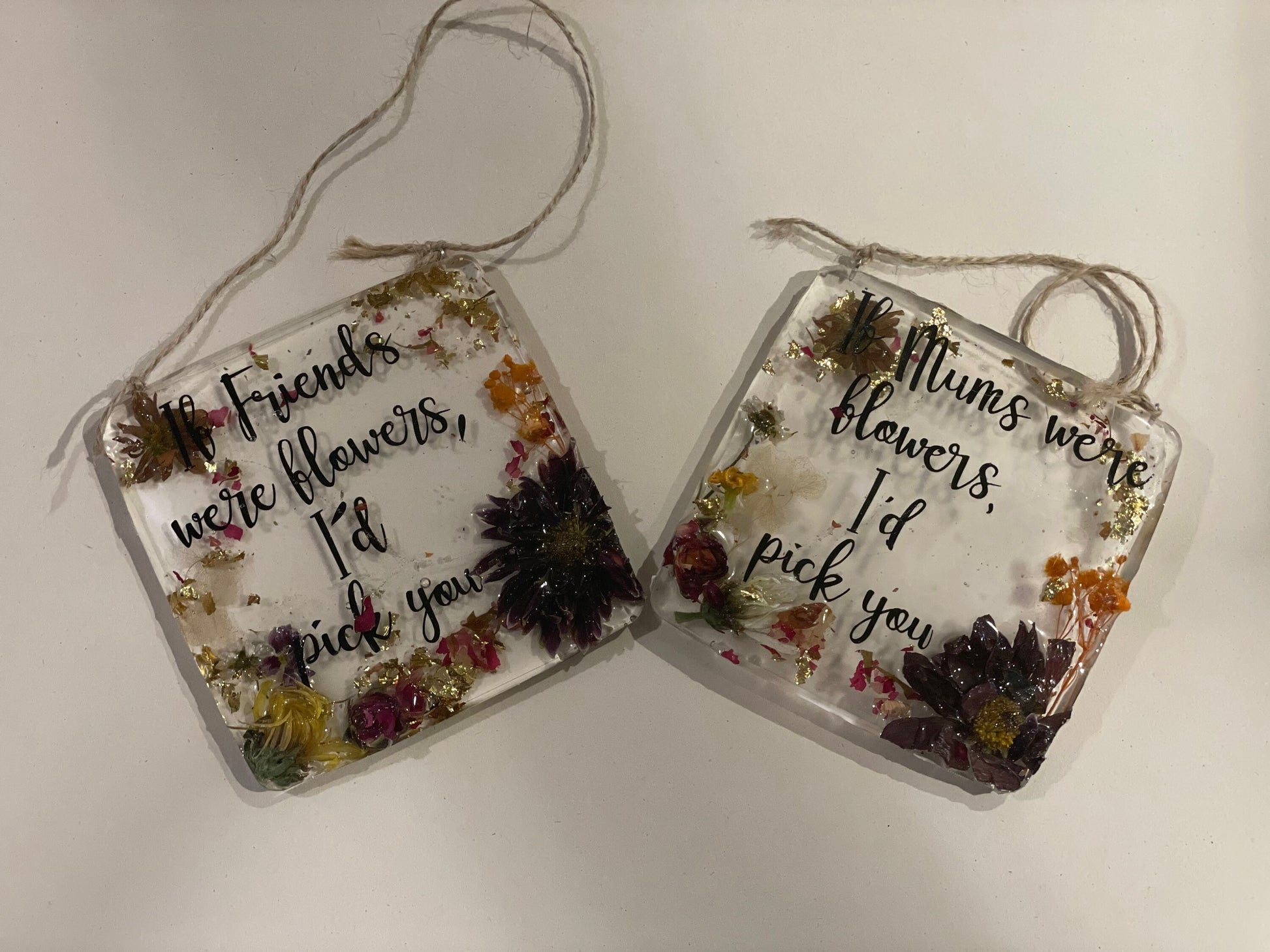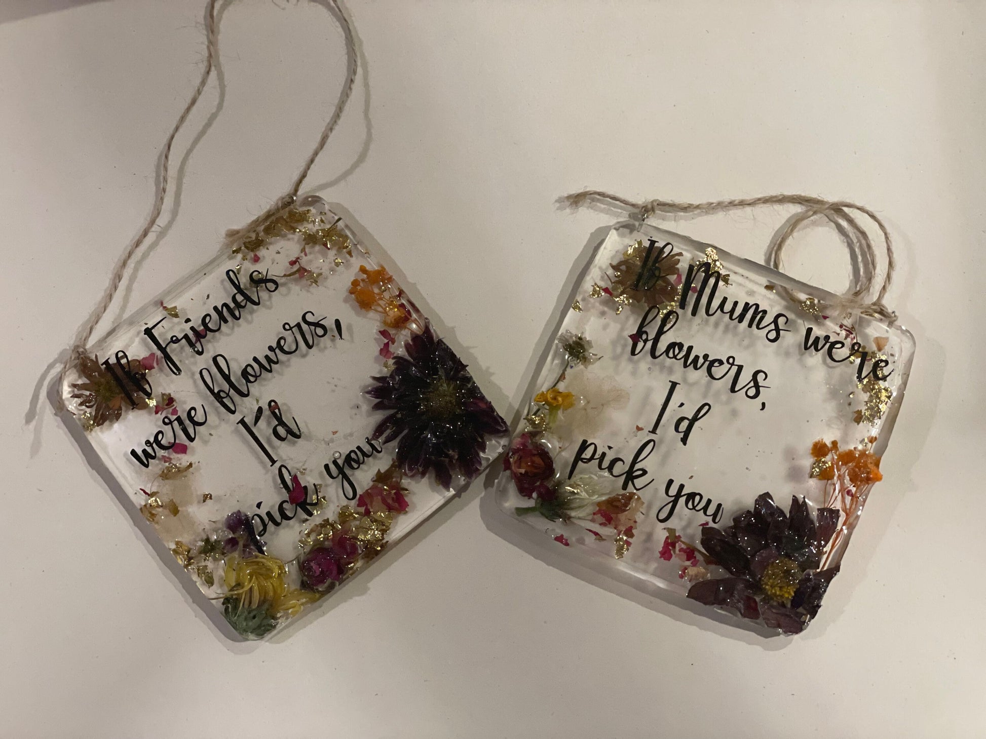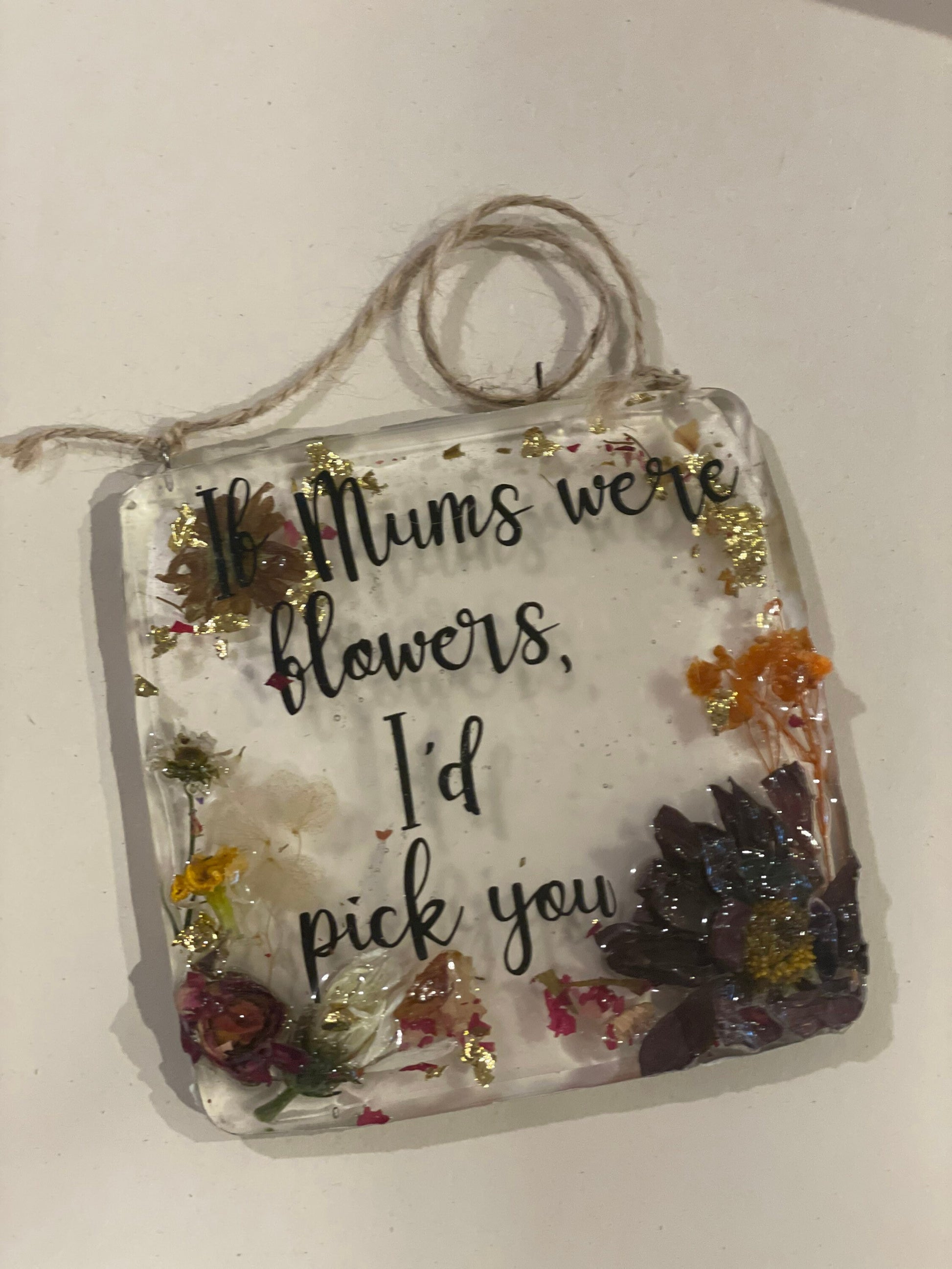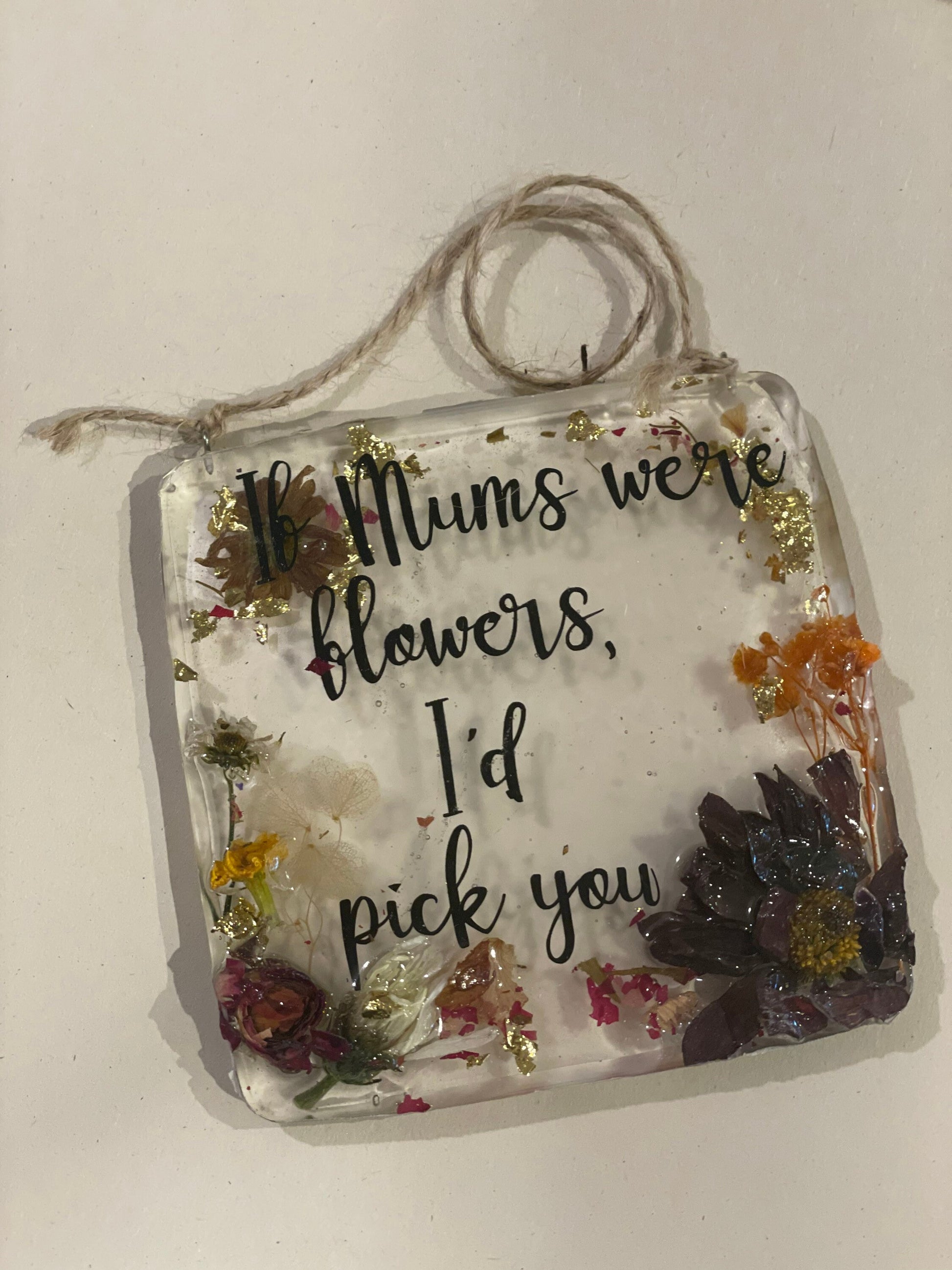 A beautiful flower filled hanging decoration to let someone know how special they are. Gold foil flecks add an extra bit of sparkle. The phrase “if mums were flowers I’d pick you” is set into the resin on black vinyl.