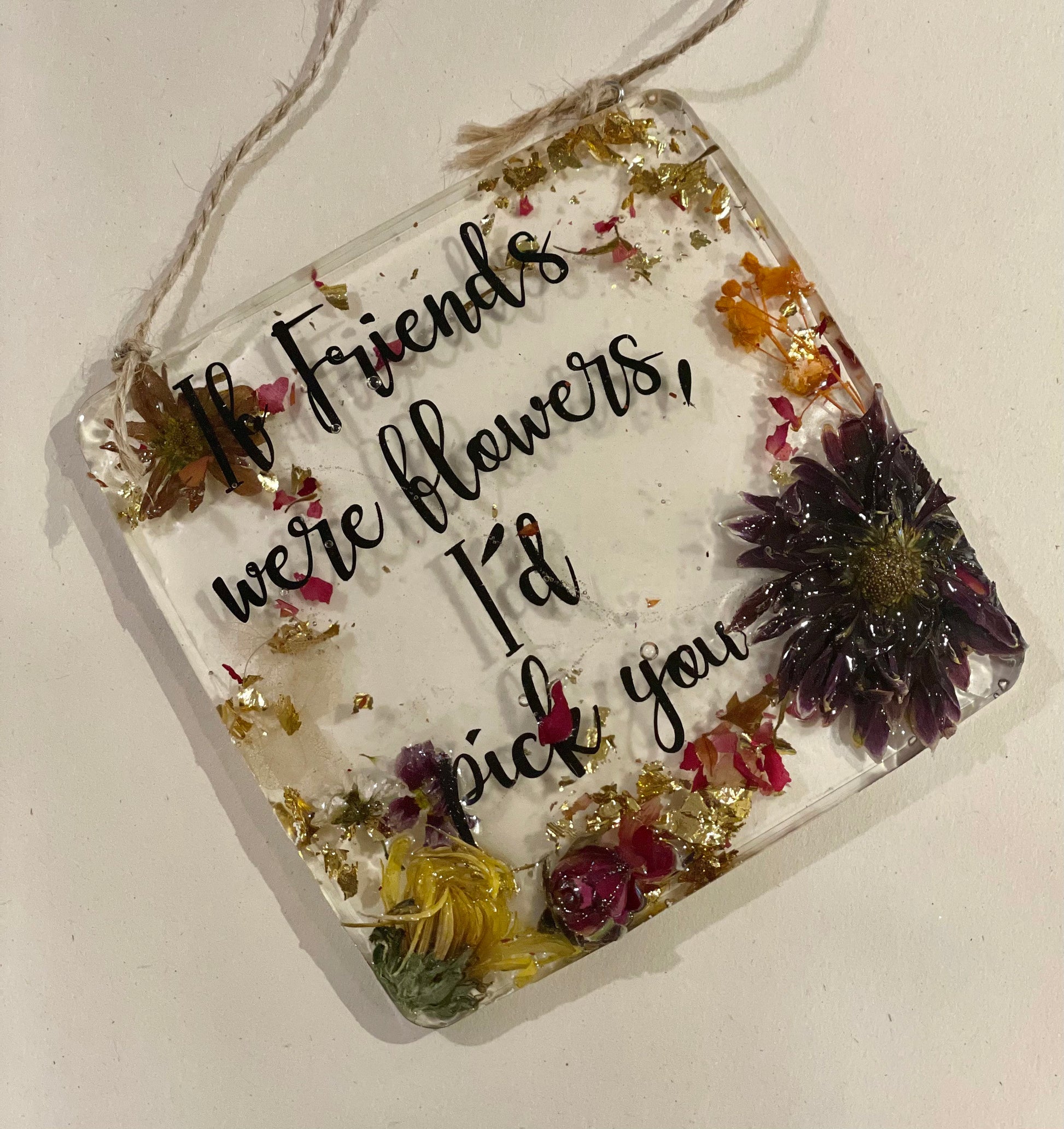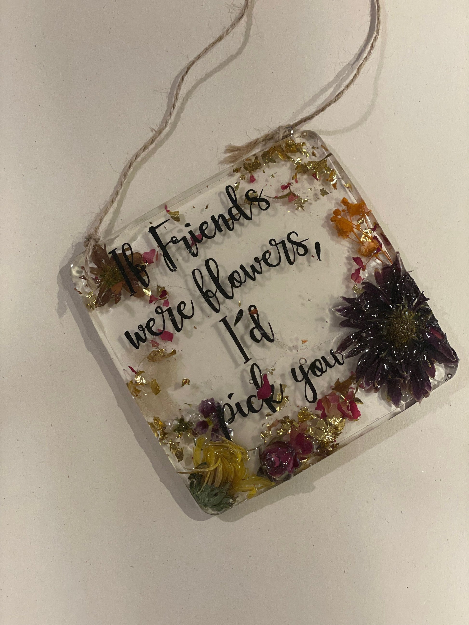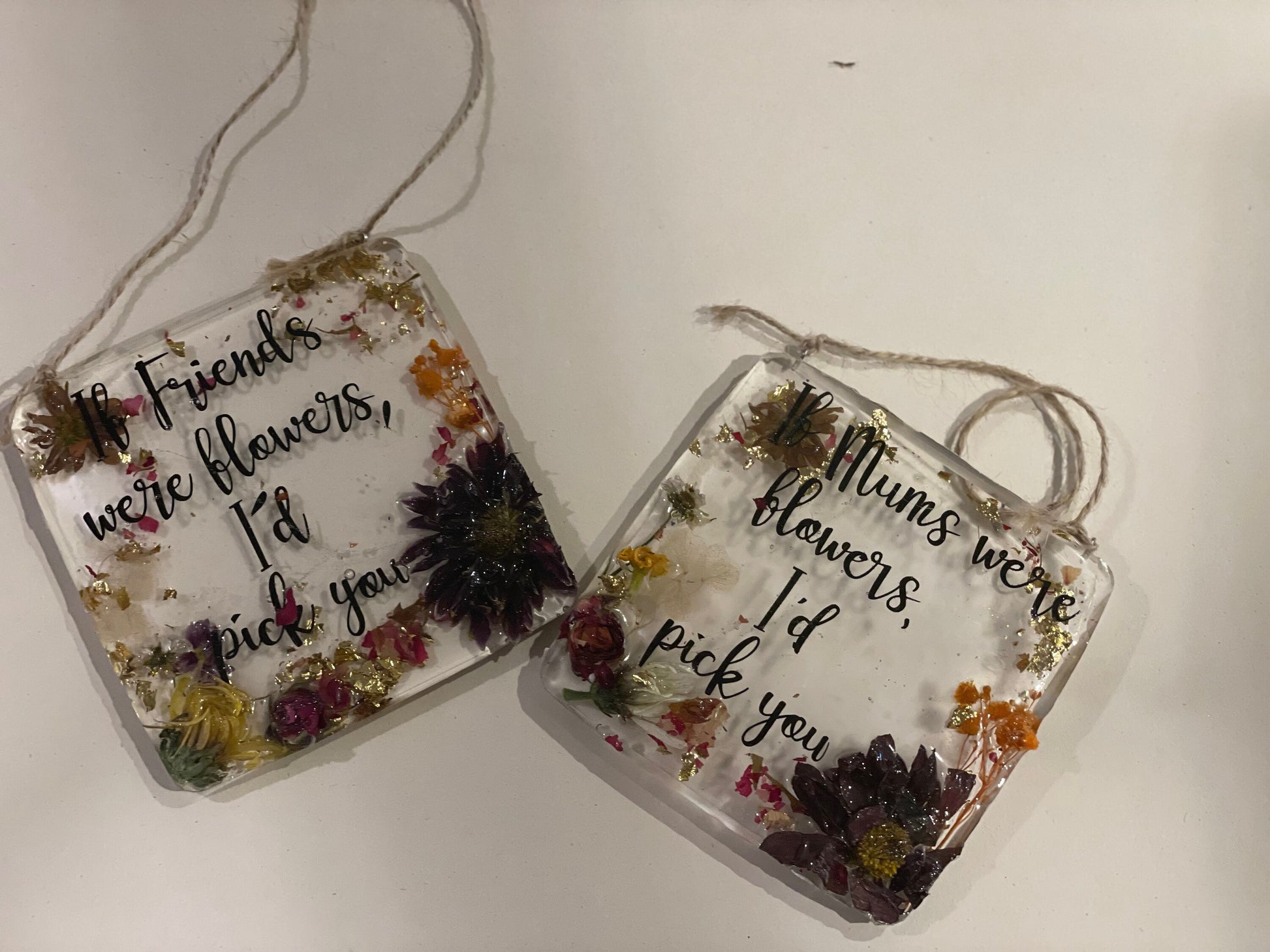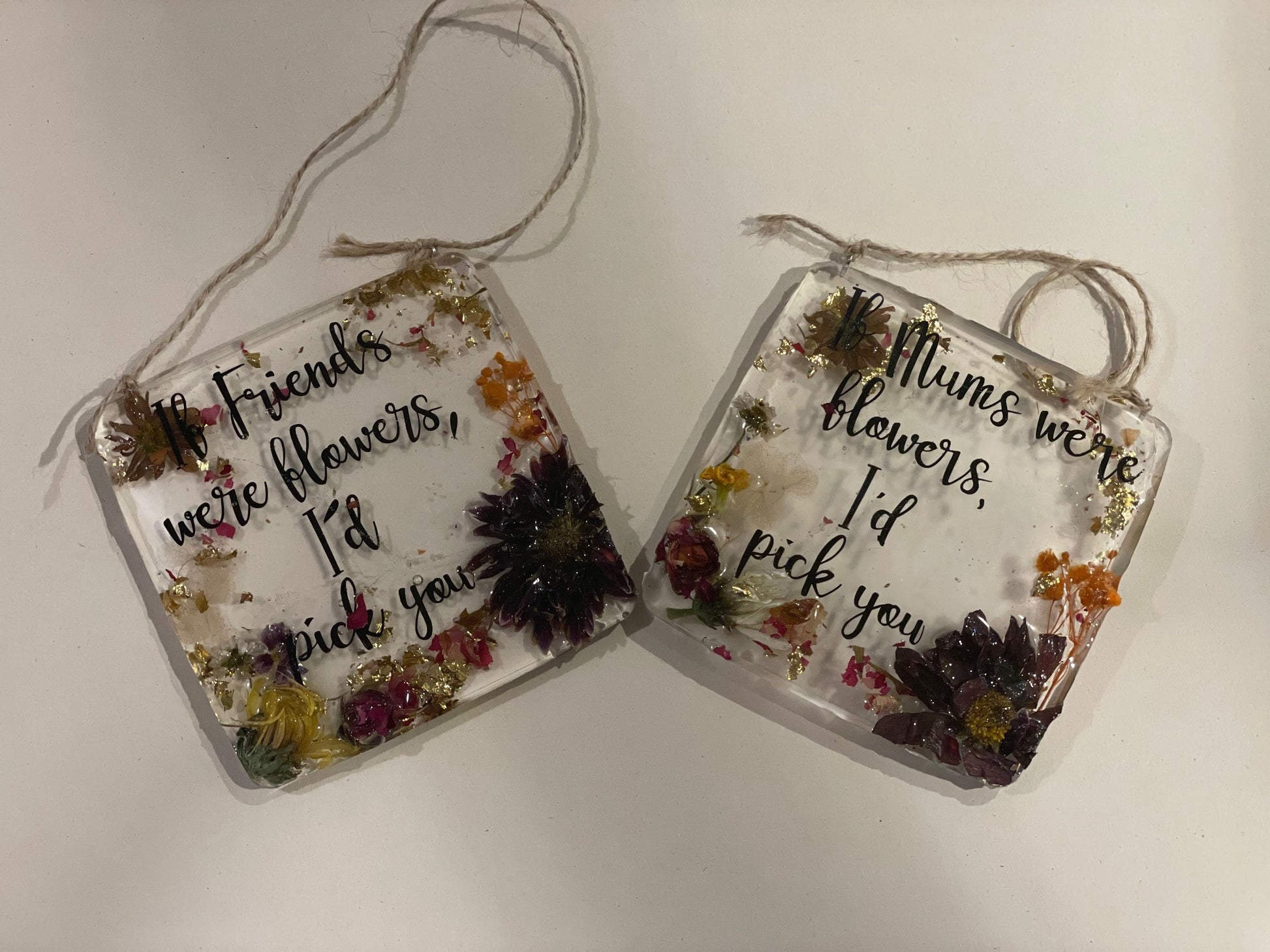 A beautiful flower filled hanging decoration to let someone know how special they are. Gold foil flecks add an extra bit of sparkle. The phrase “if mums were flowers I’d pick you” is set into the resin on black vinyl.