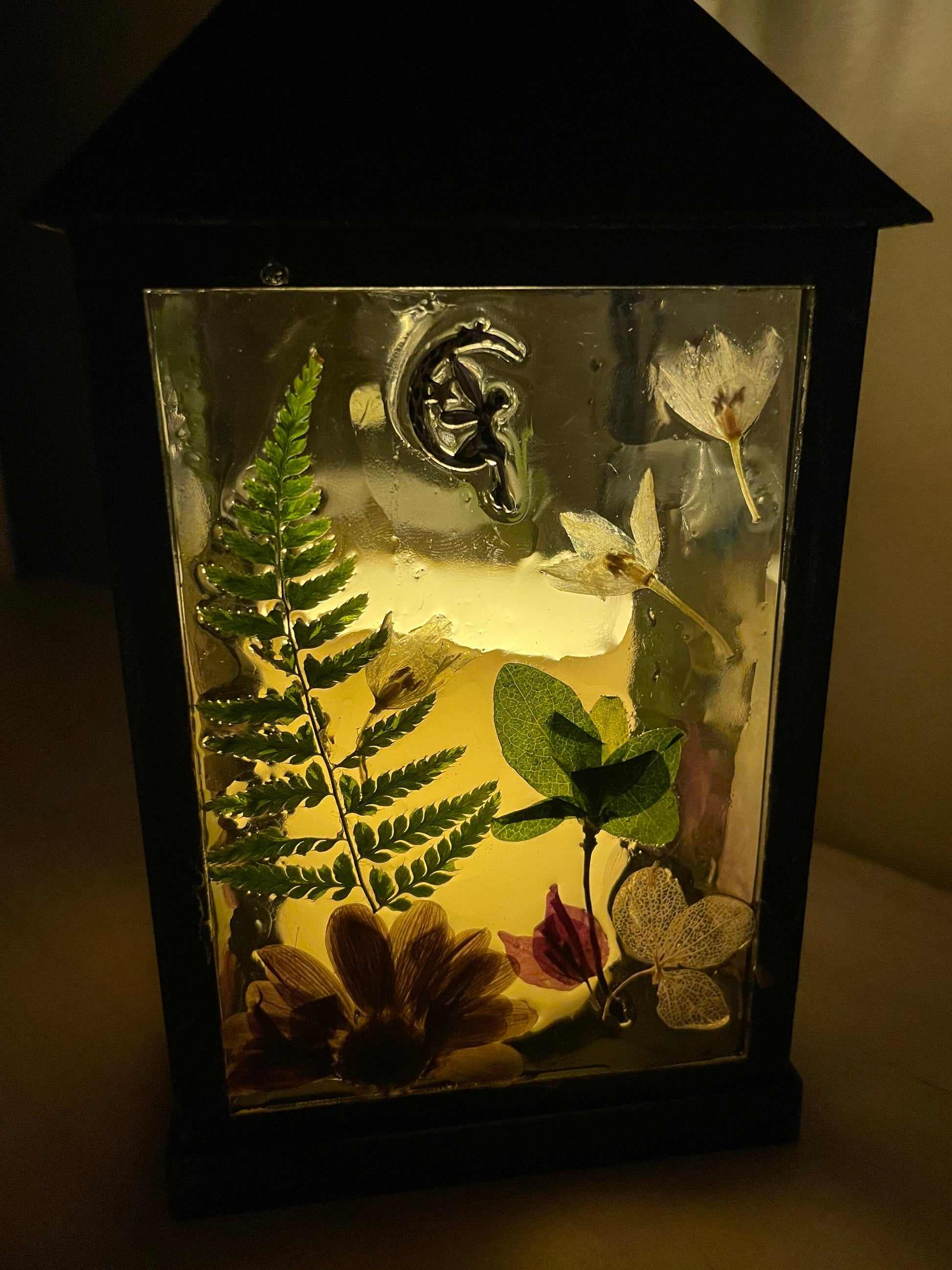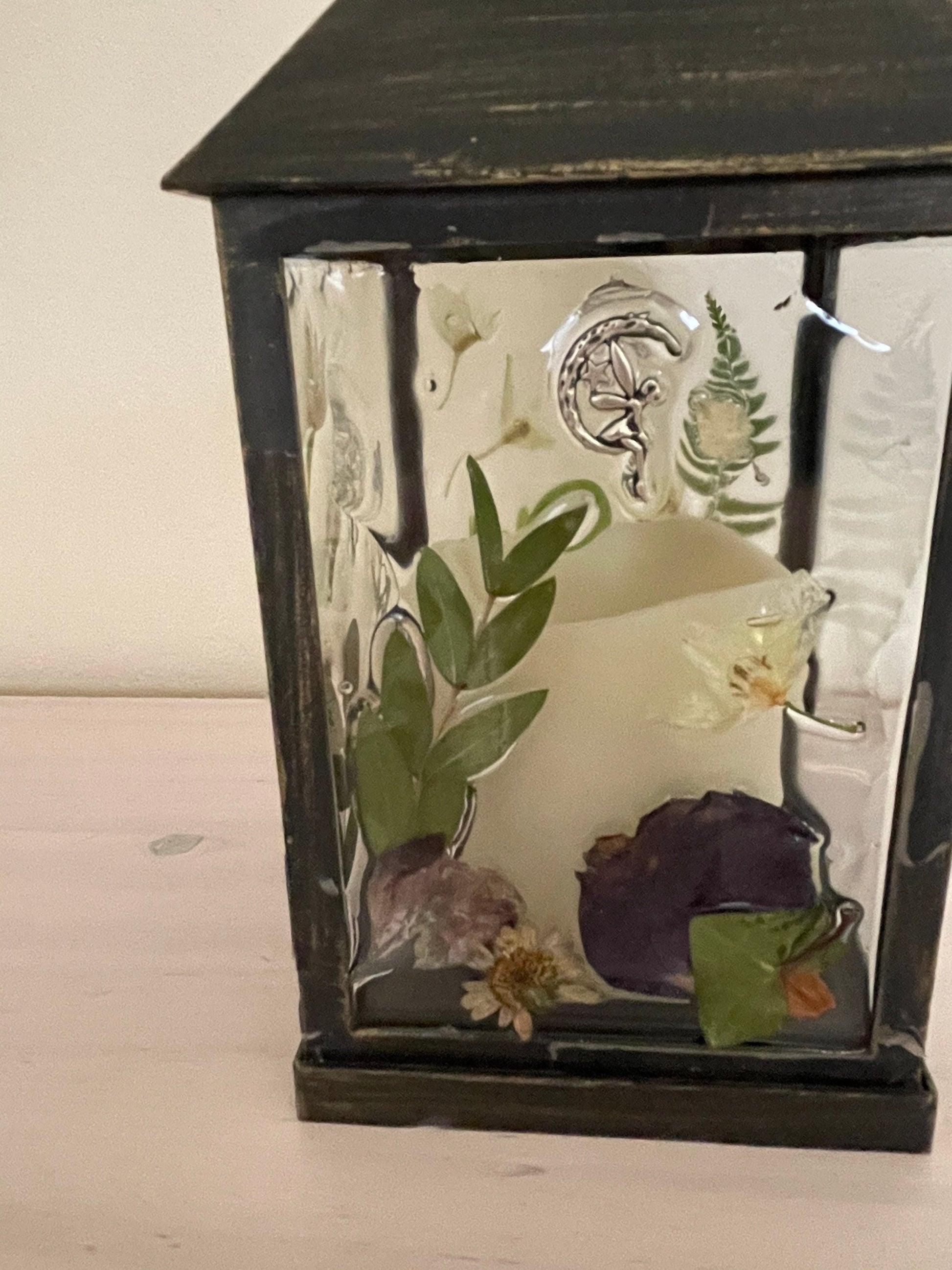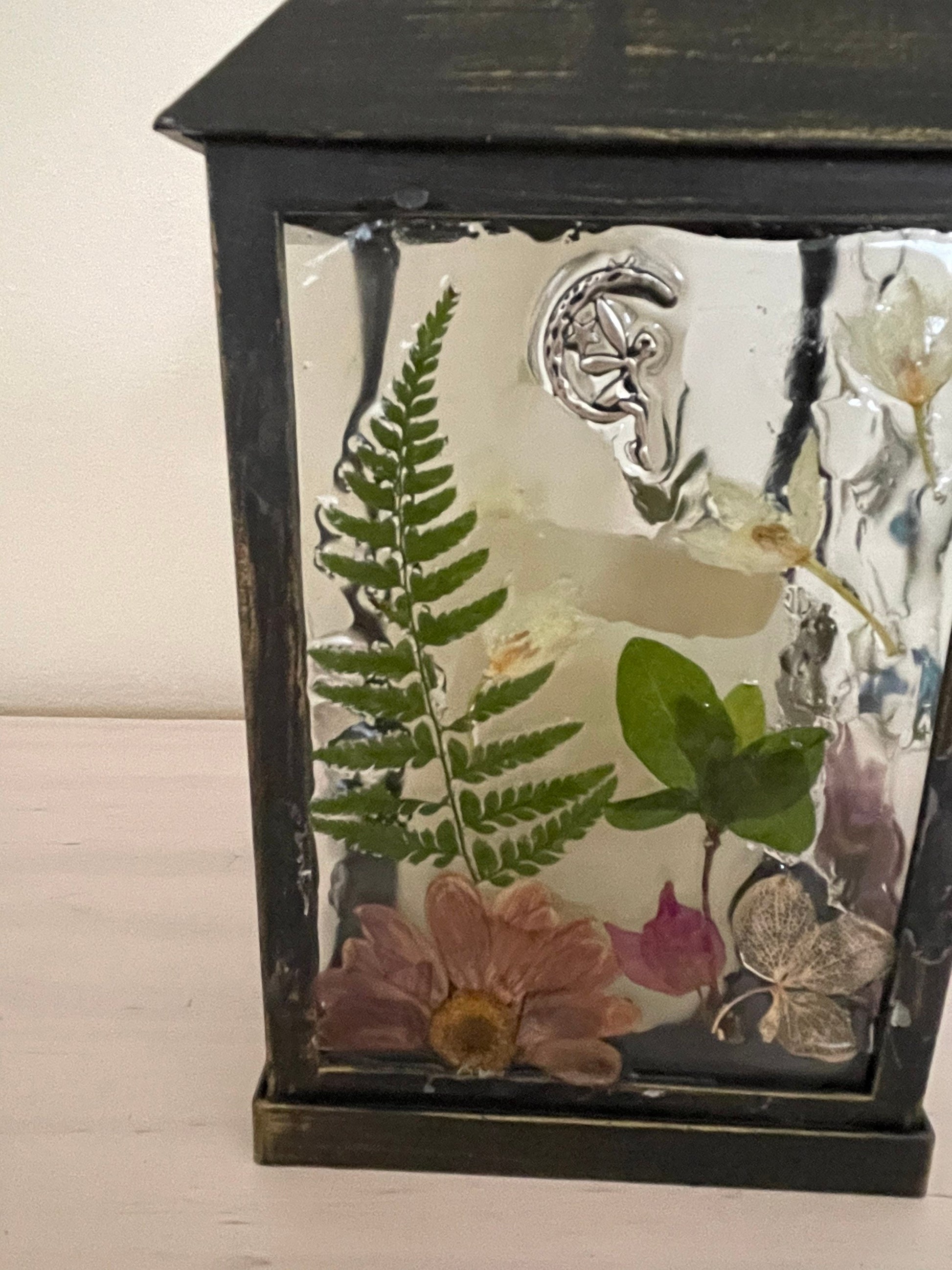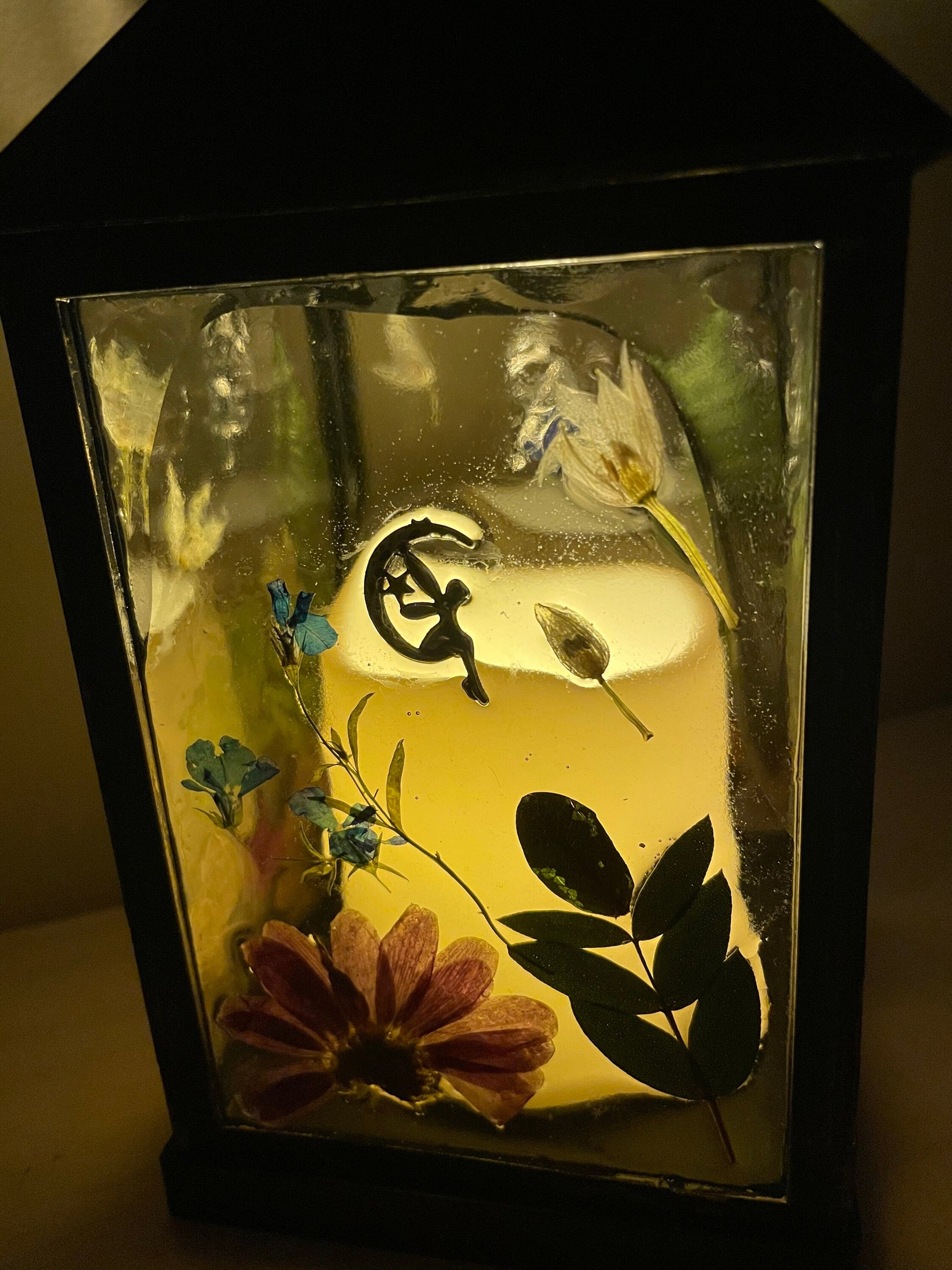 Lantern with real flowers and silver fairy charm, Flower fairy night light, flower decor lantern, lantern with real flower decoration, Resinate-7003.myshopify.com