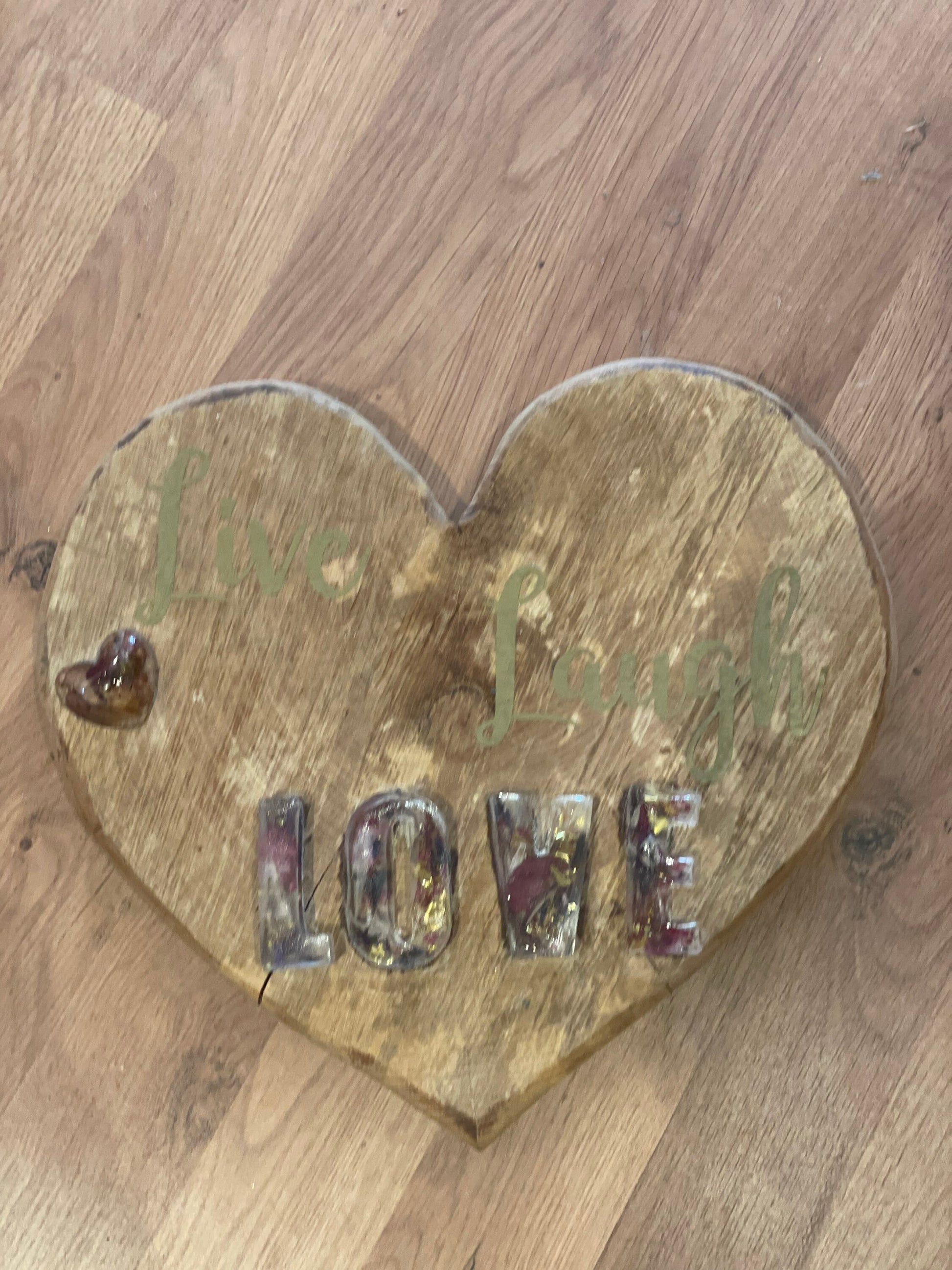 A beautiful real log slice shaped into a heart with a live, laugh, love motto.