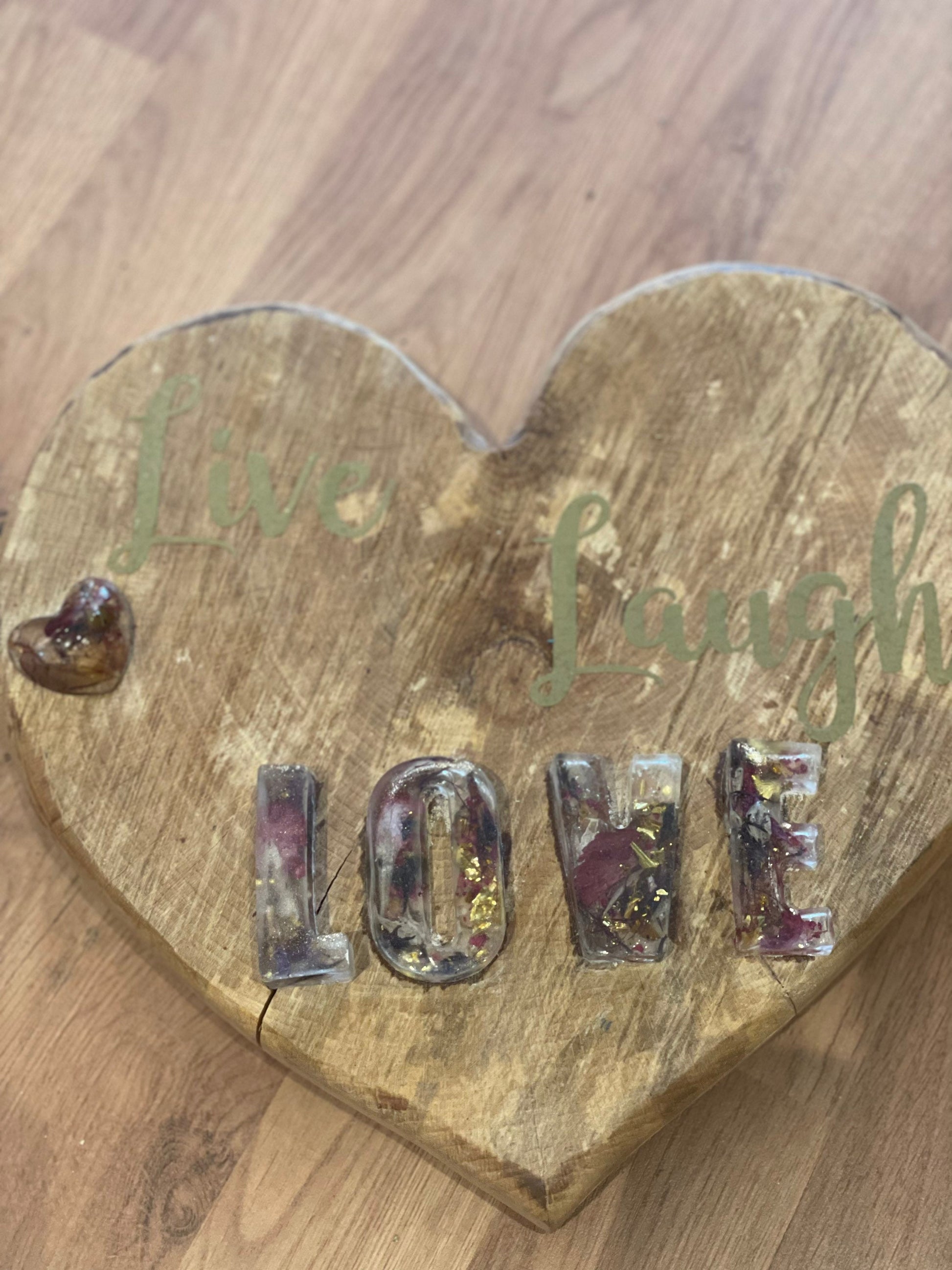 The heart measures approximately 29 cm across by 27 cm high by 5 cm deep. Resin letters are 5 cm high.