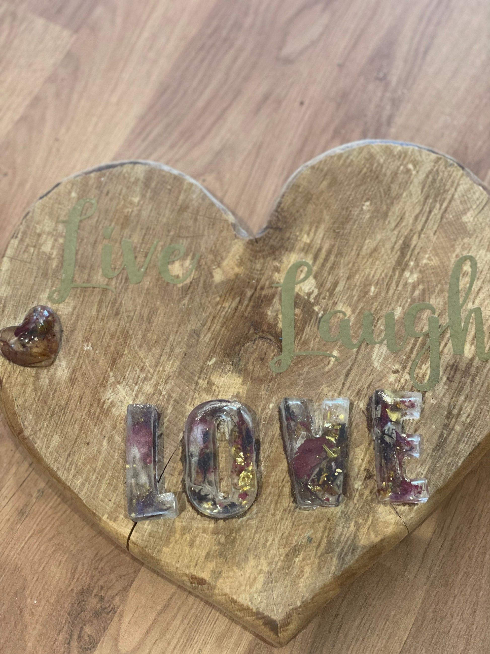 Live laugh love wooden heart with resin letters, hanging wall sign for flower themed living room, home sign with real flowers, housewarming Gift, new home gift, first home present. Resinate-7003.myshopify.com