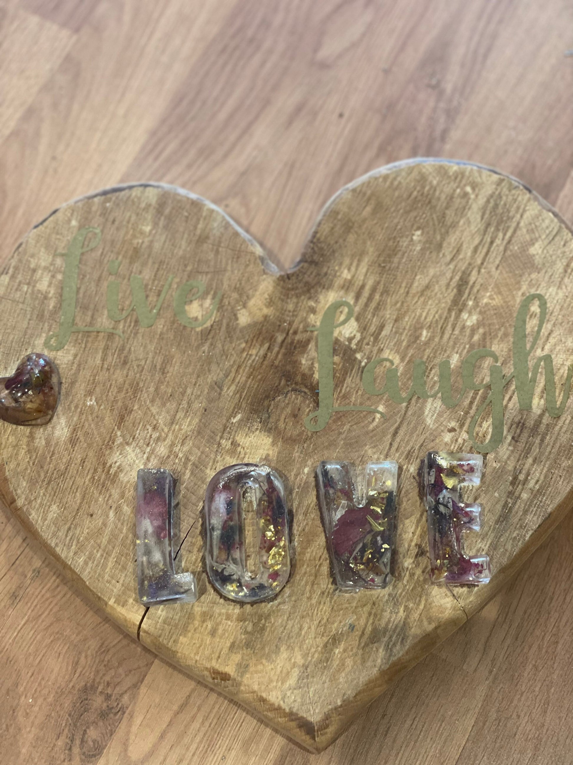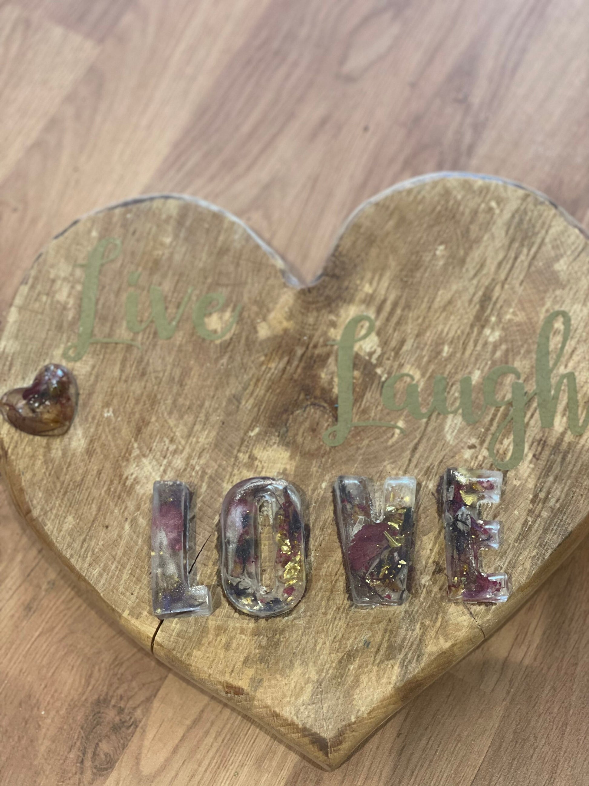 Live laugh love wooden heart with resin letters, hanging wall sign, gift for her, home sign with real flowers, housewarming