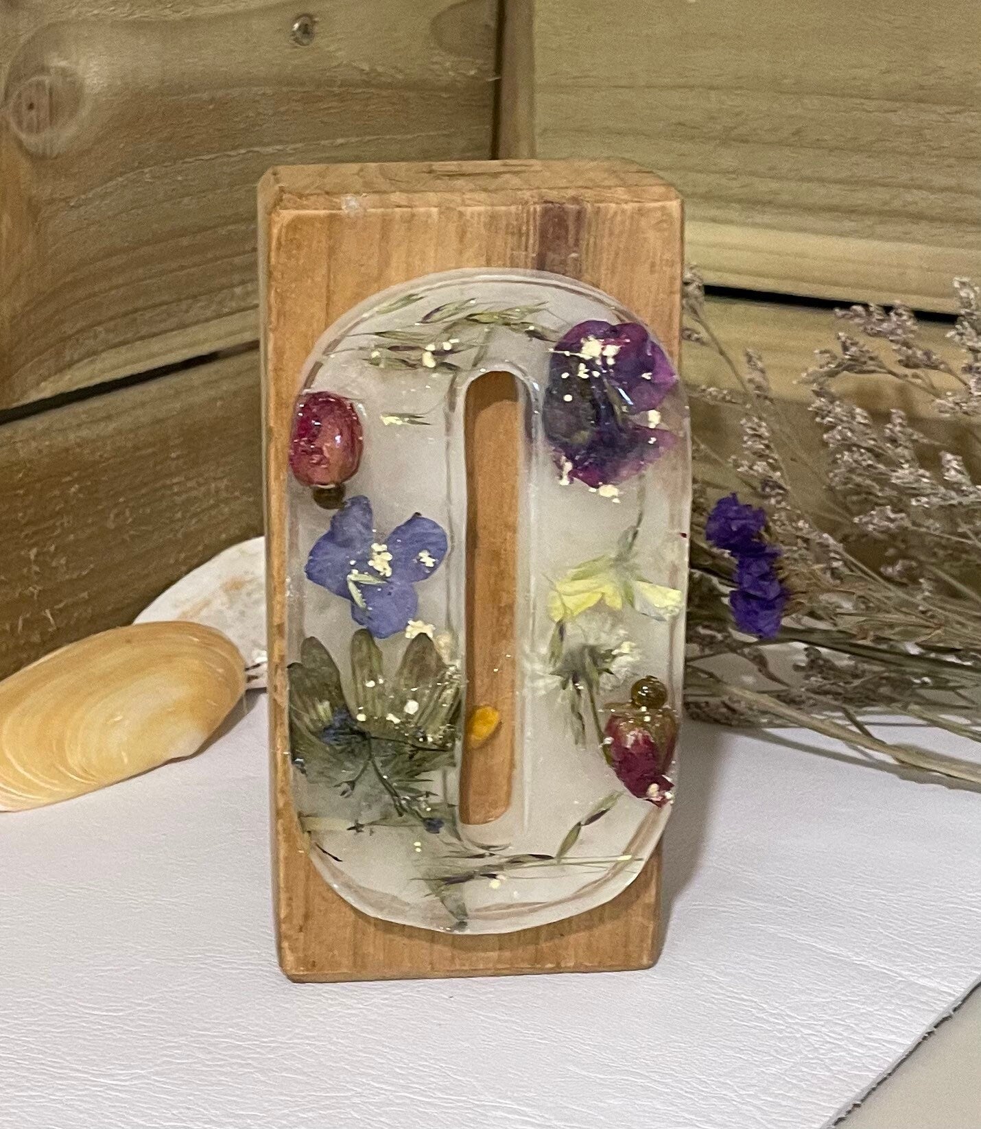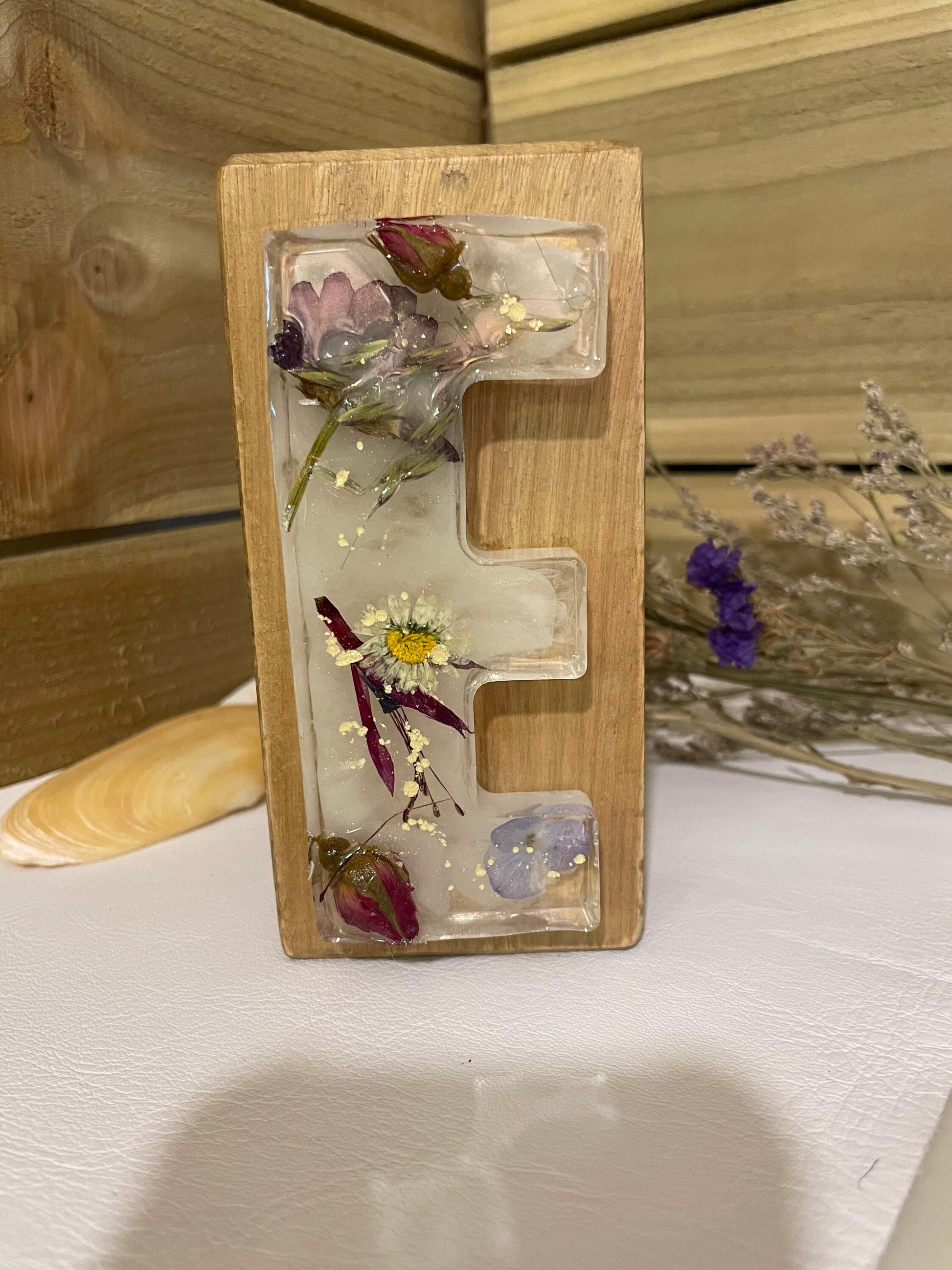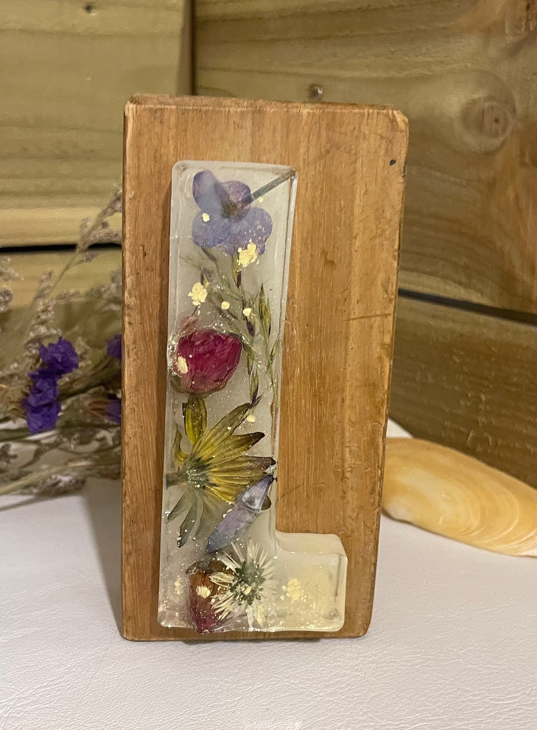 The 11 cm high letters are full of real flowers including calendulas, rose buds, fuchsia and hydrangeas with shimmering pale gold swirls.