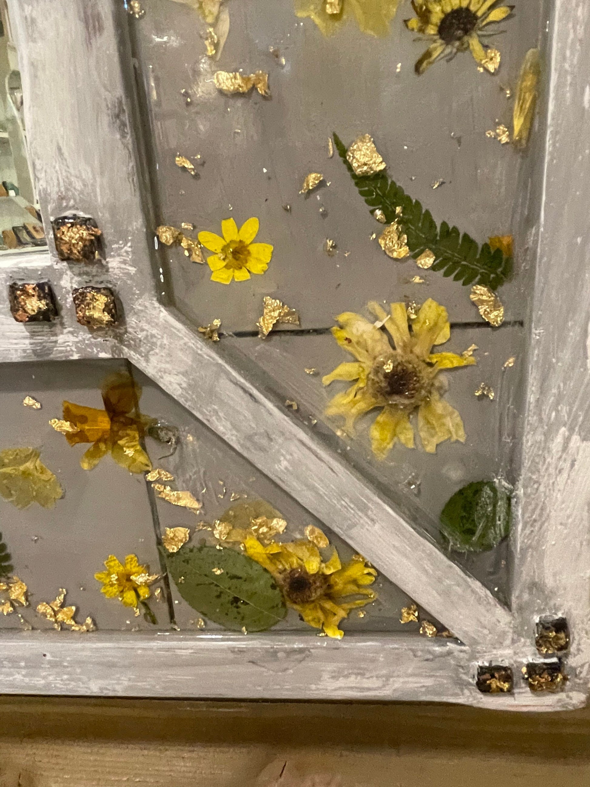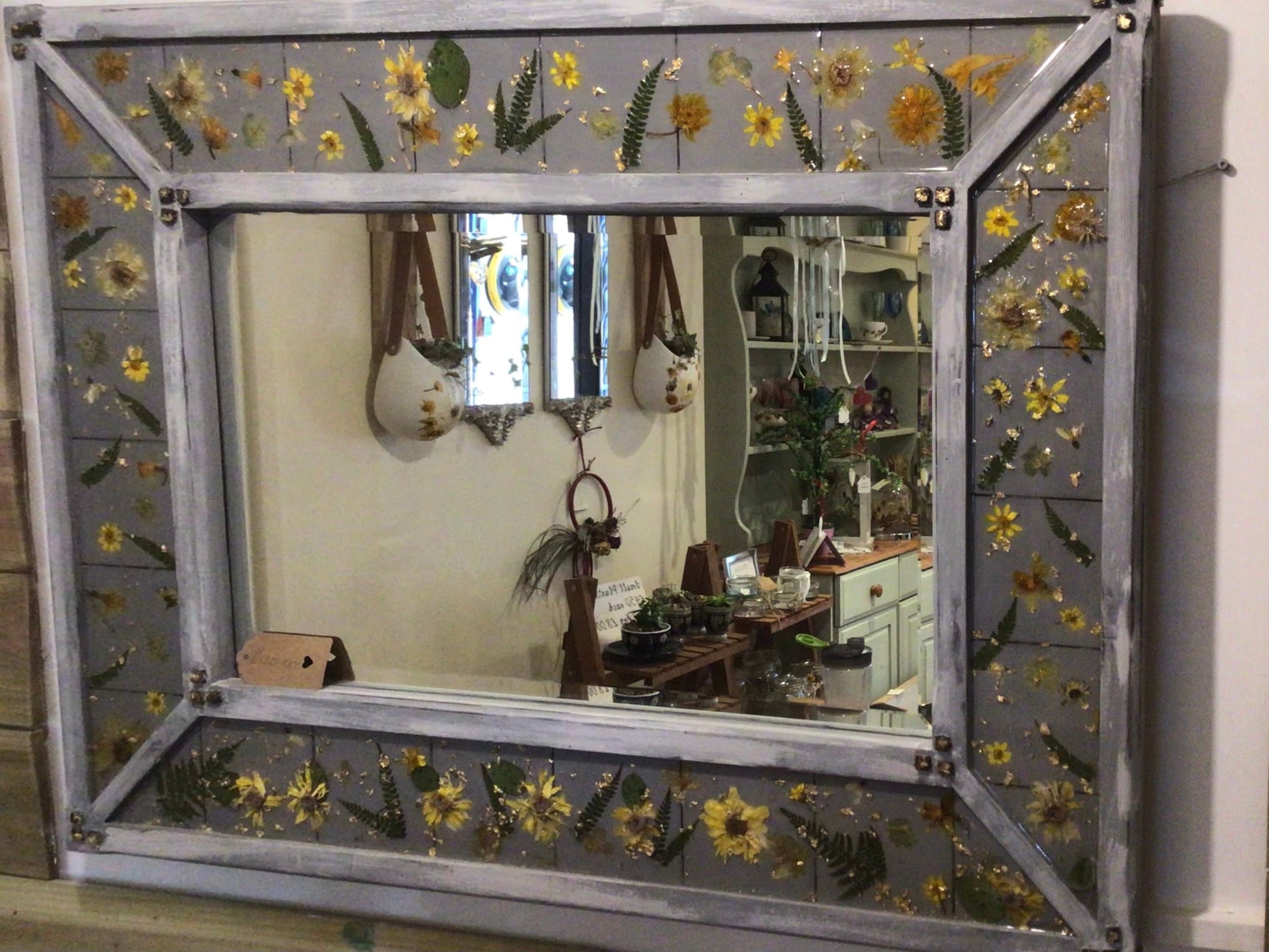 The white washed wooden frame is set with a large mirror and has real flowers, petals, leaves and grasses set in resin.