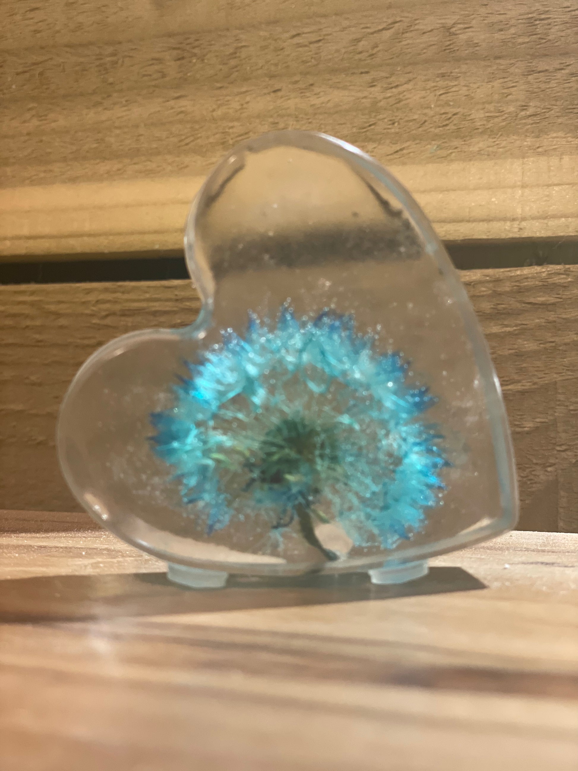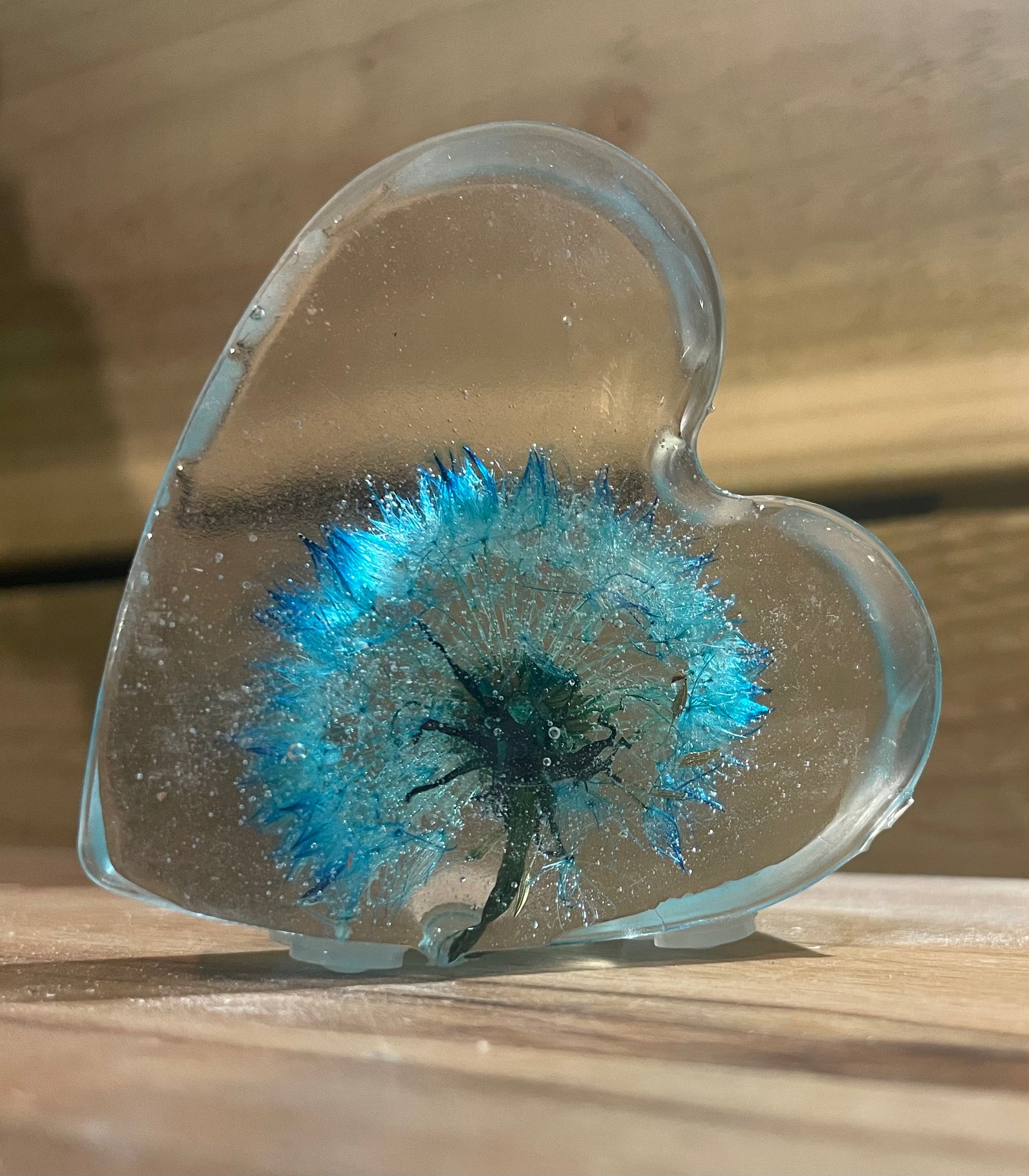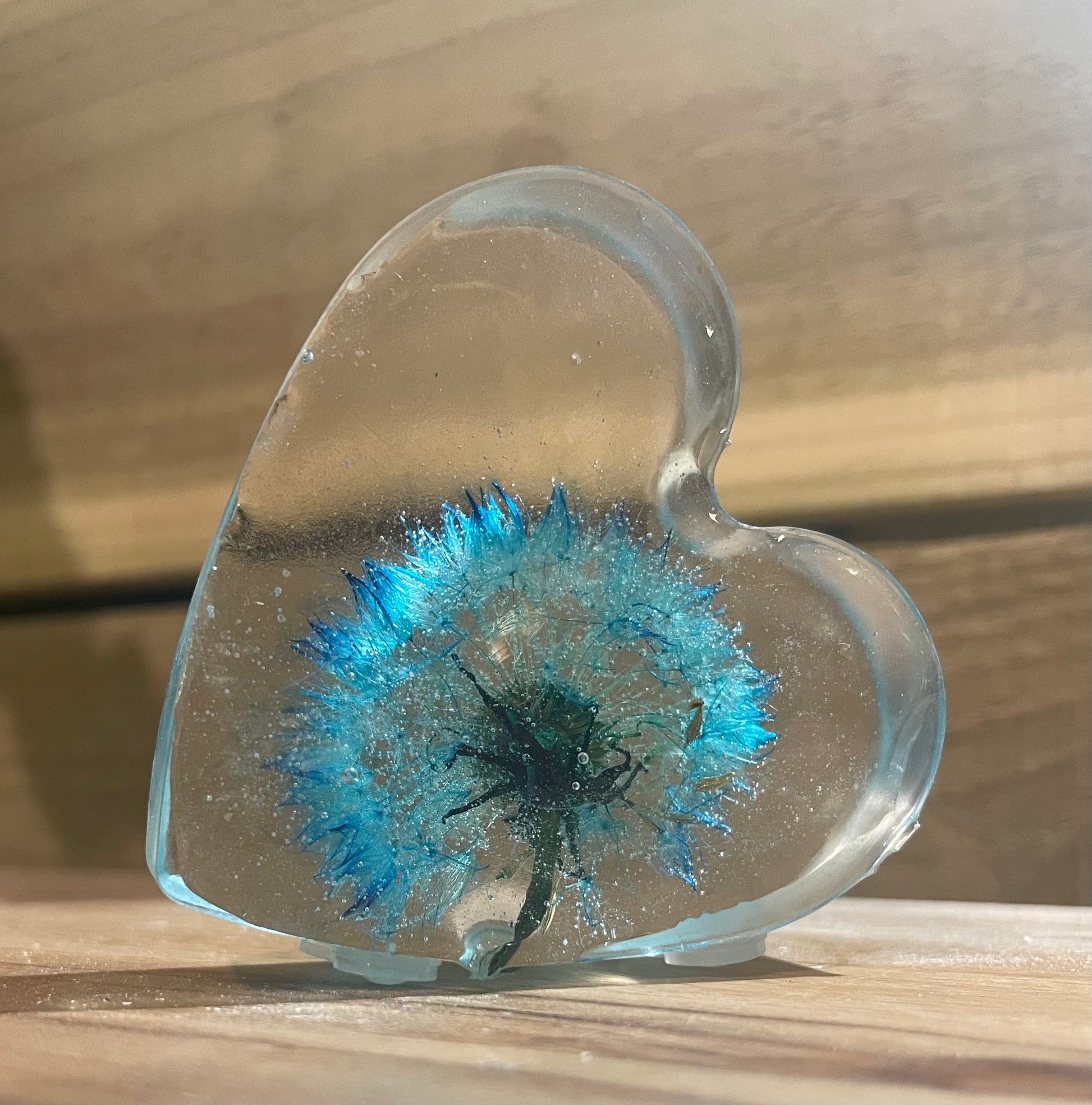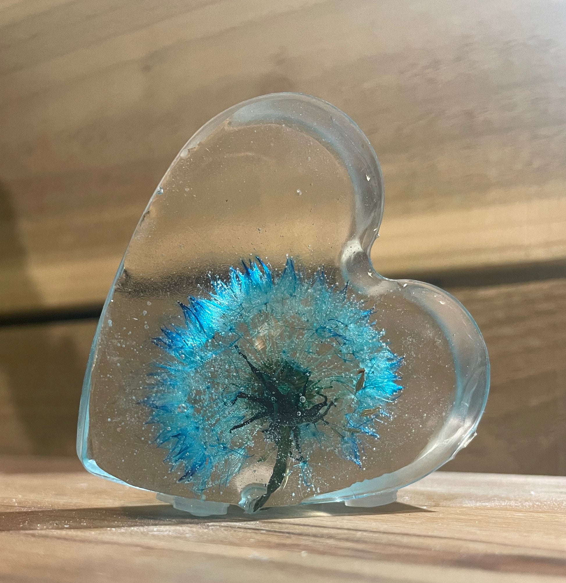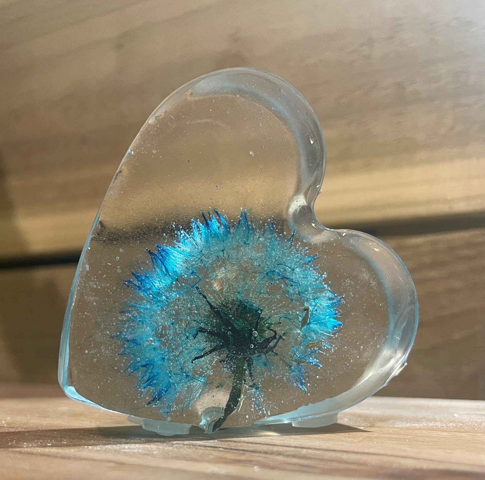 A beautiful free standing resin heart full of dandelion wishes and silver foil flecks for a touch of sparkle.