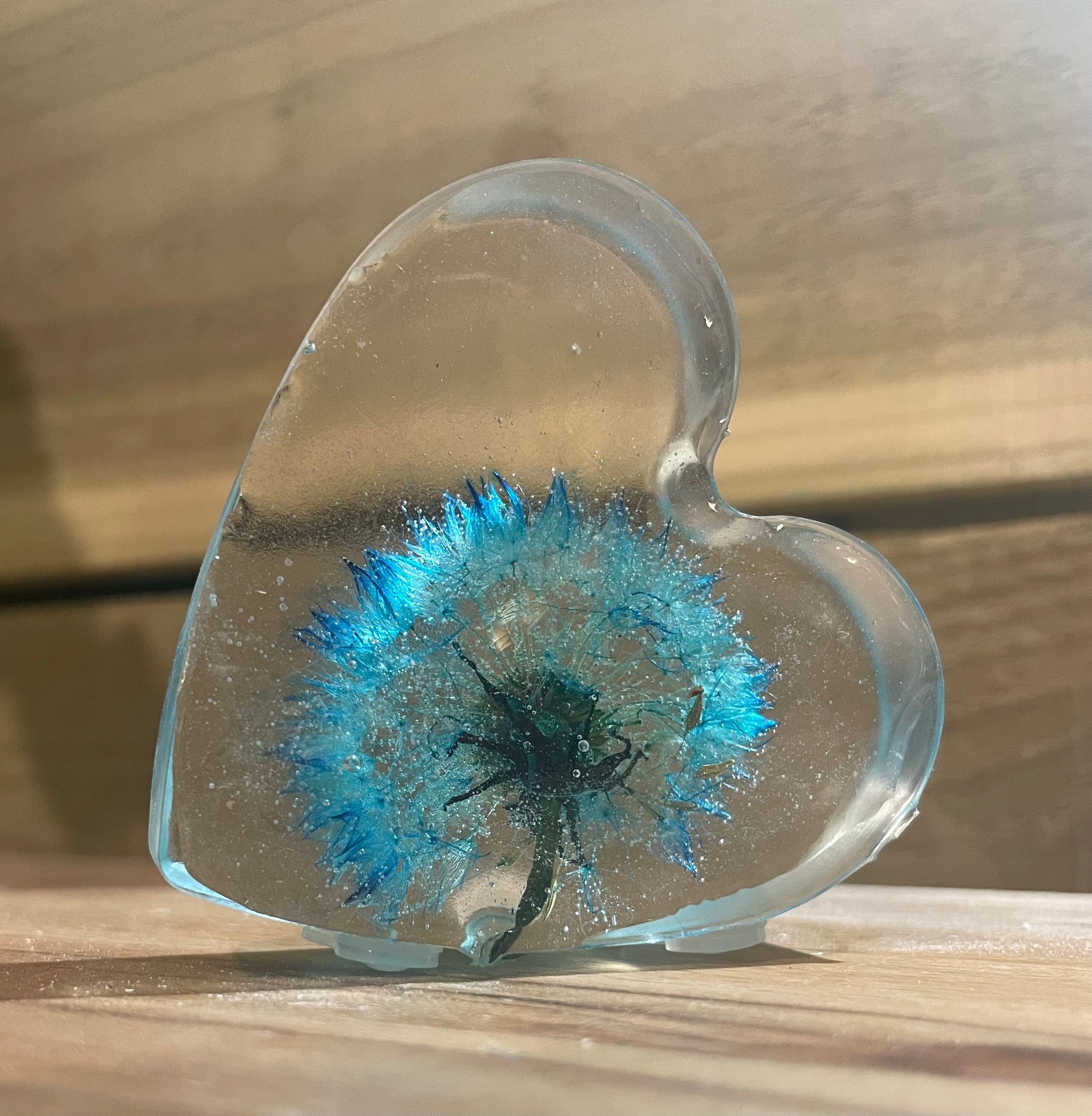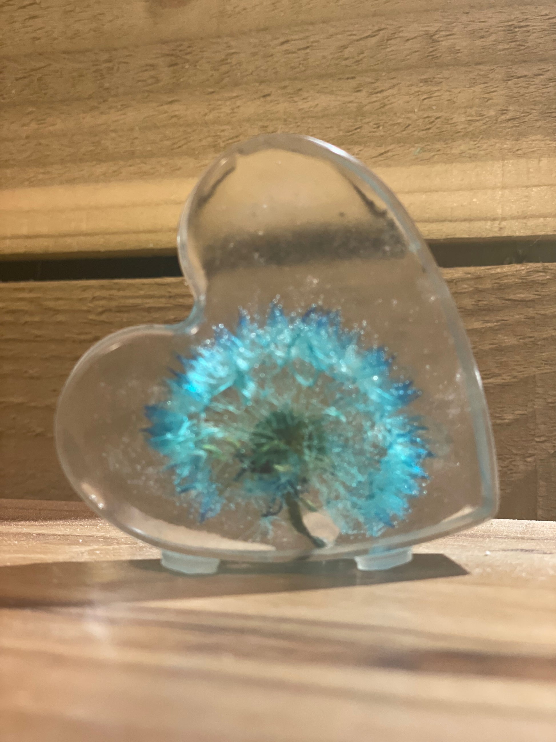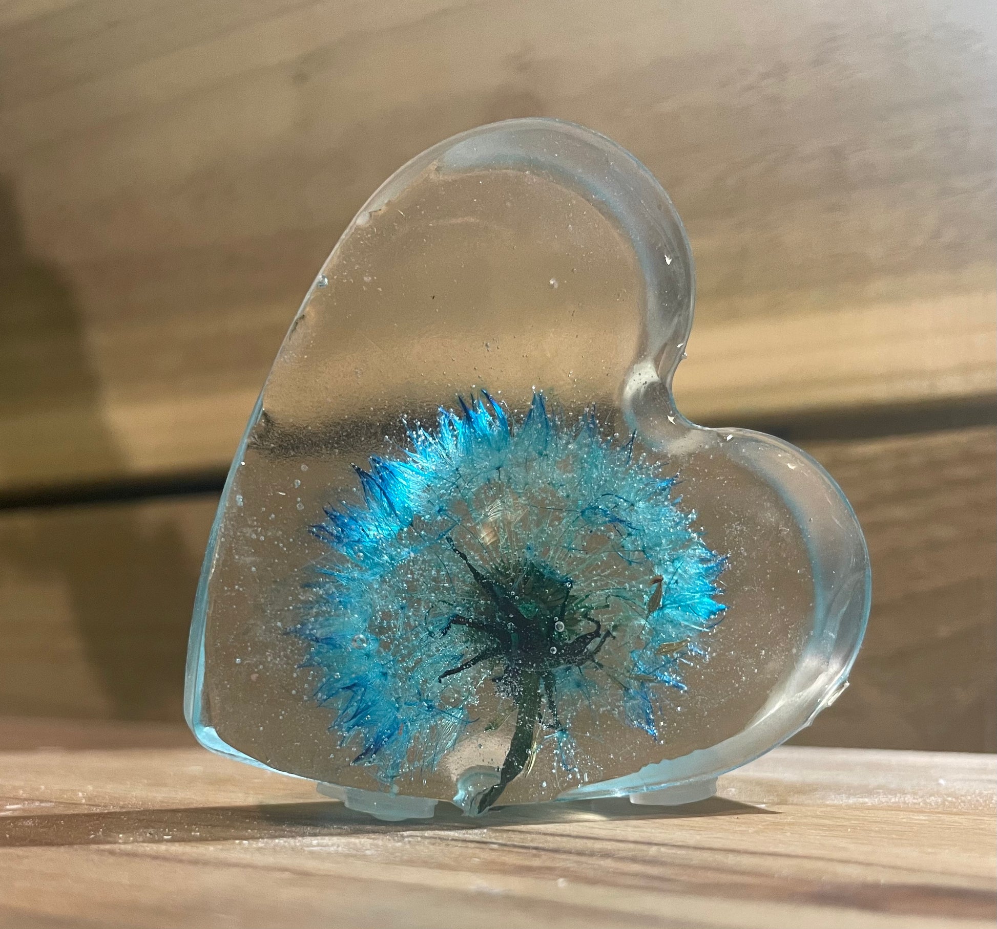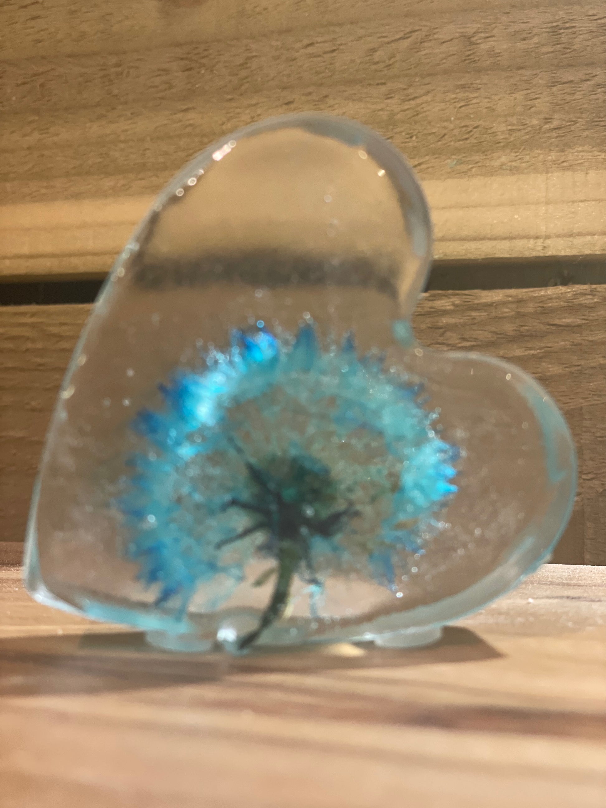 A beautiful free standing resin heart full of dandelion wishes and silver foil flecks for a touch of sparkle.