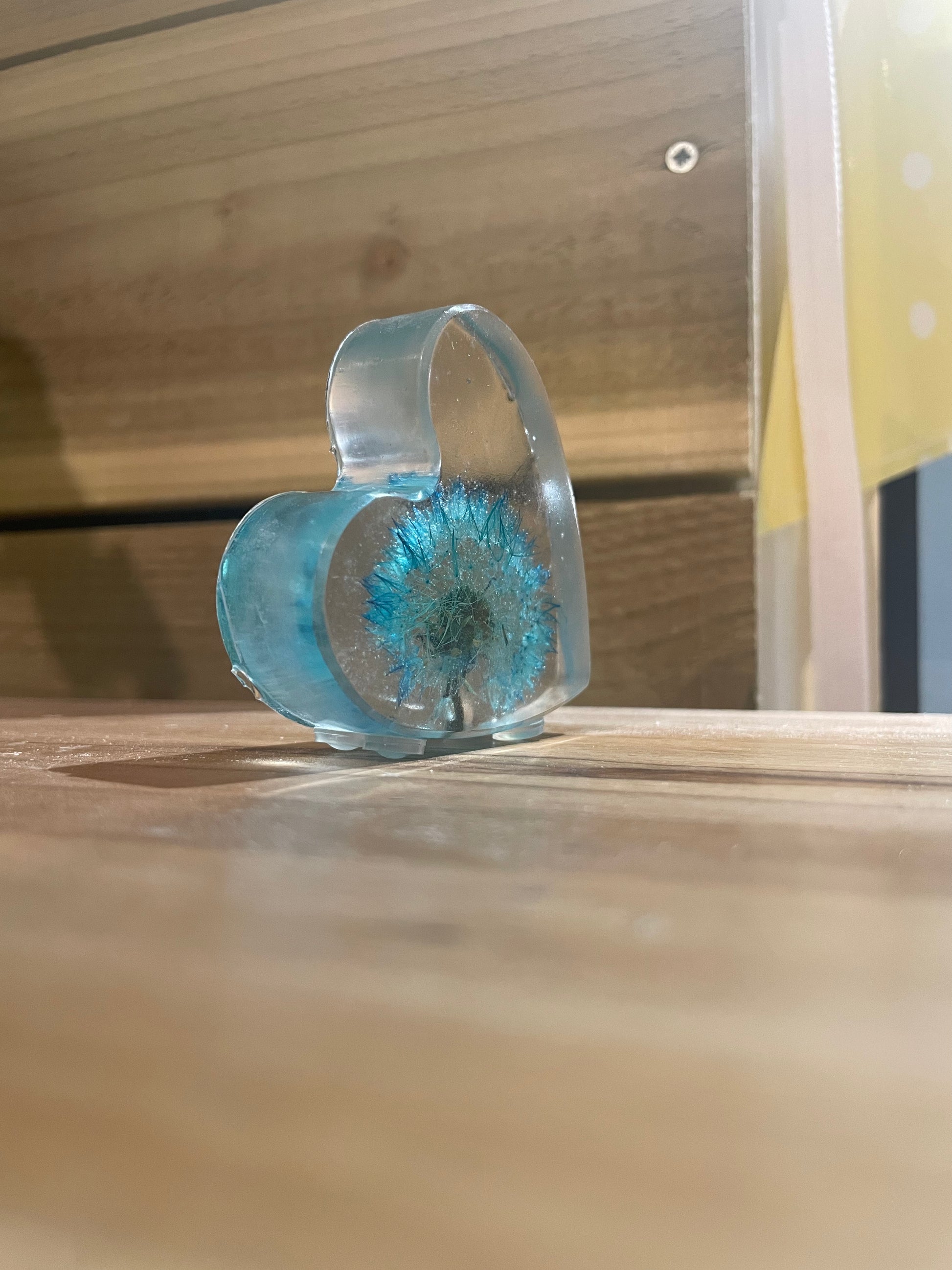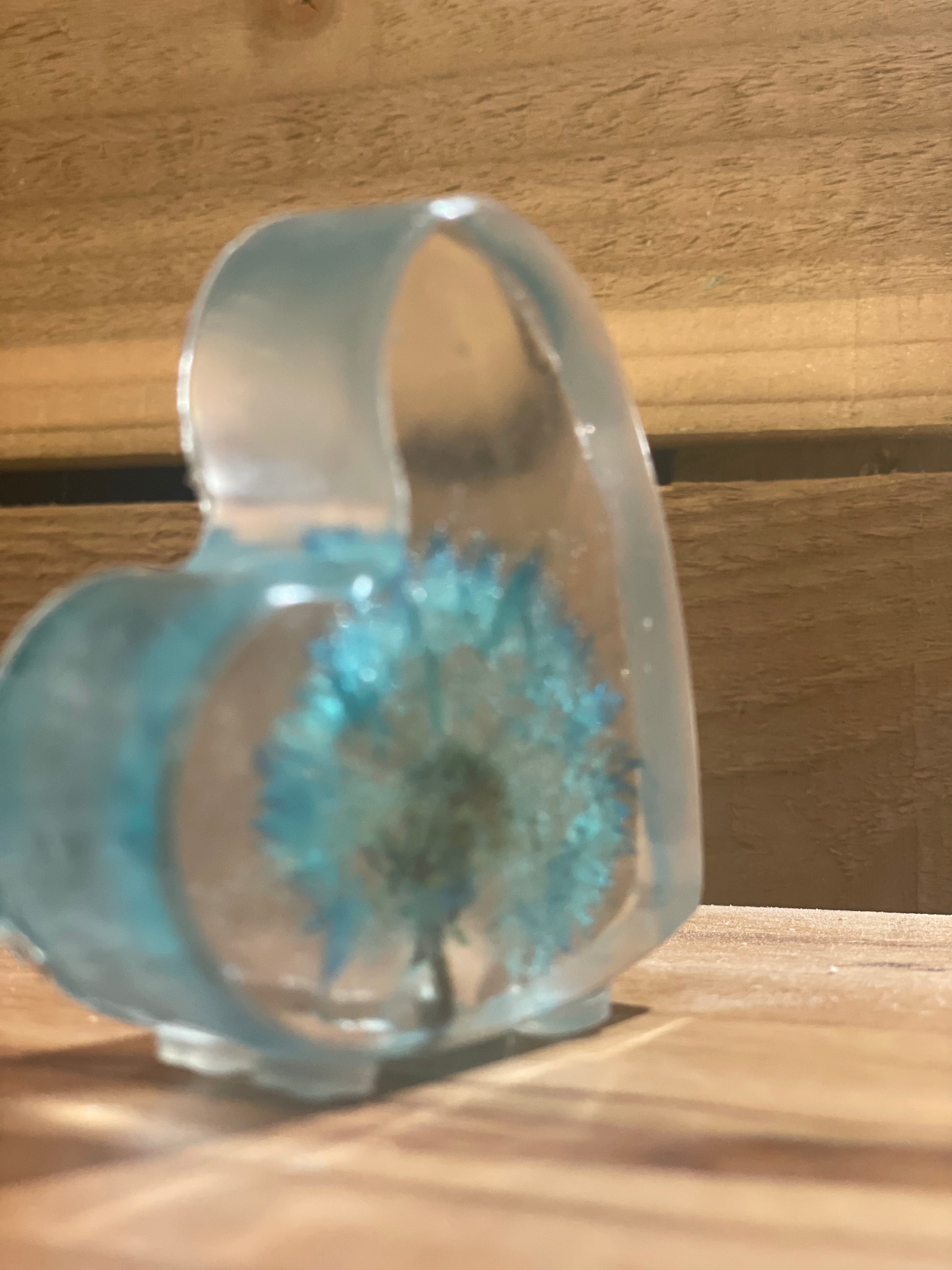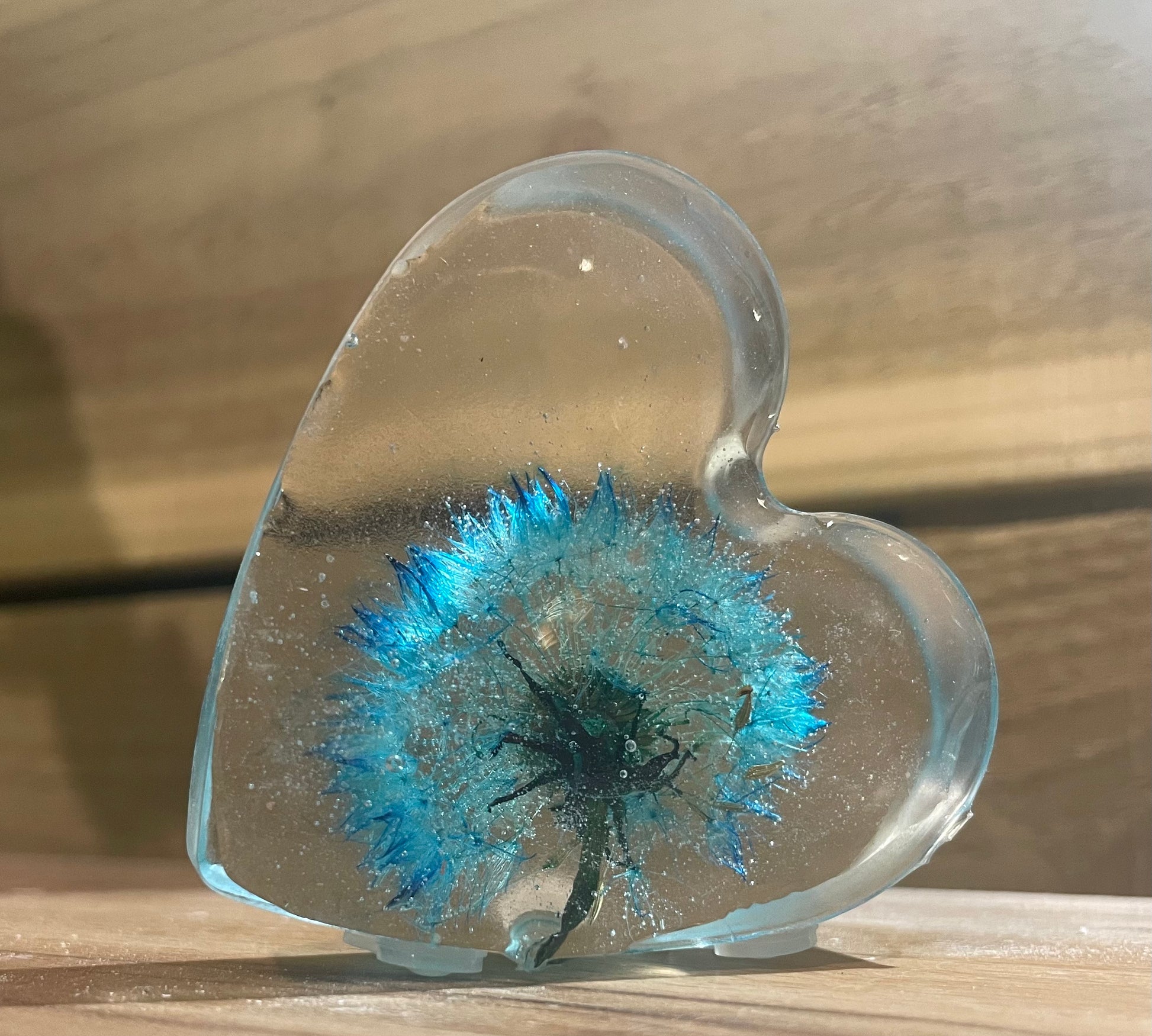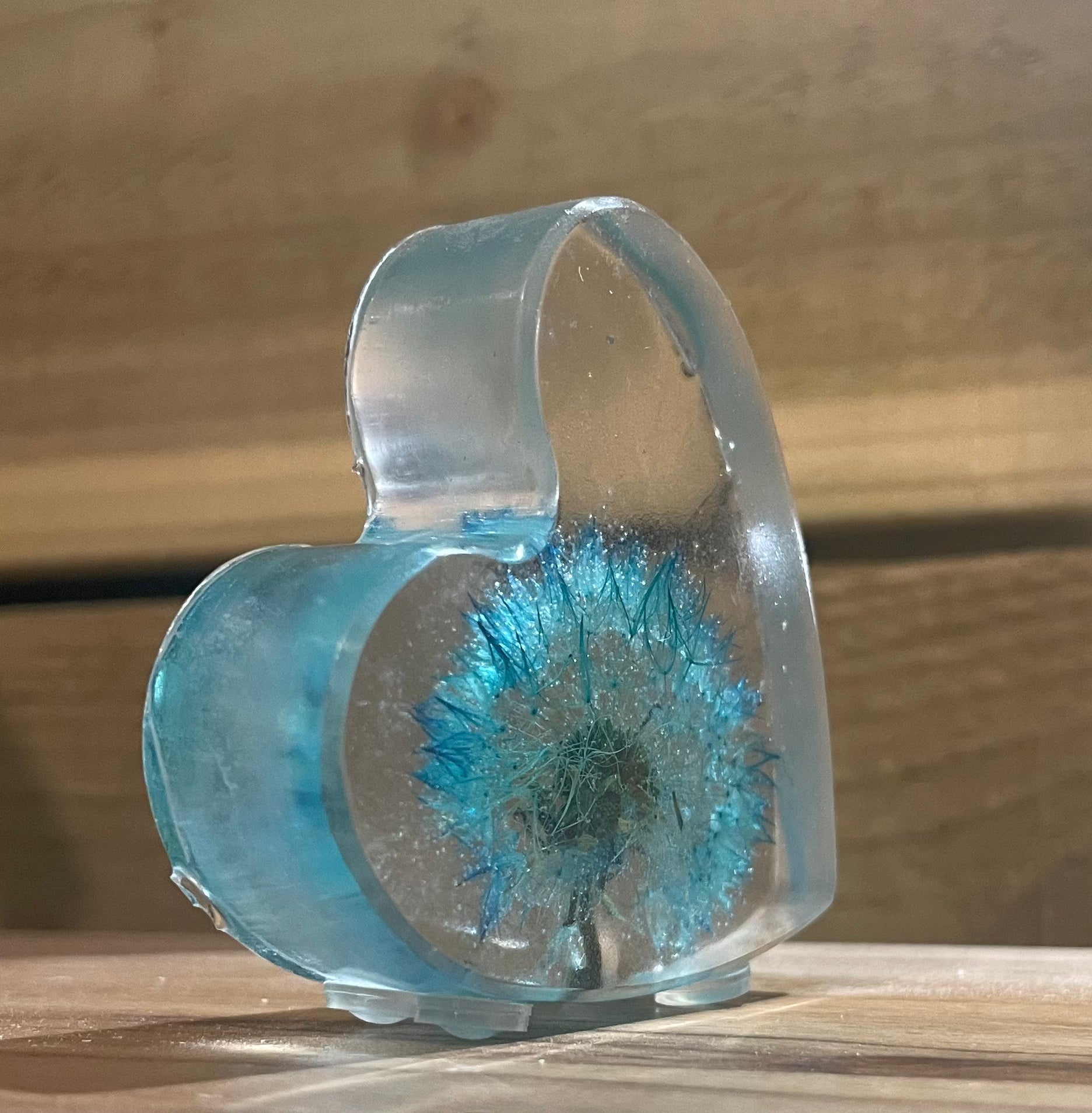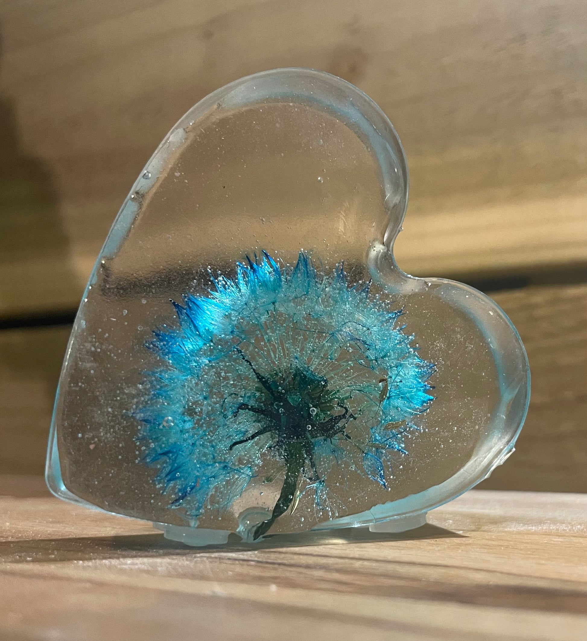 A beautiful free standing resin heart full of dandelion wishes and silver foil flecks for a touch of sparkle.