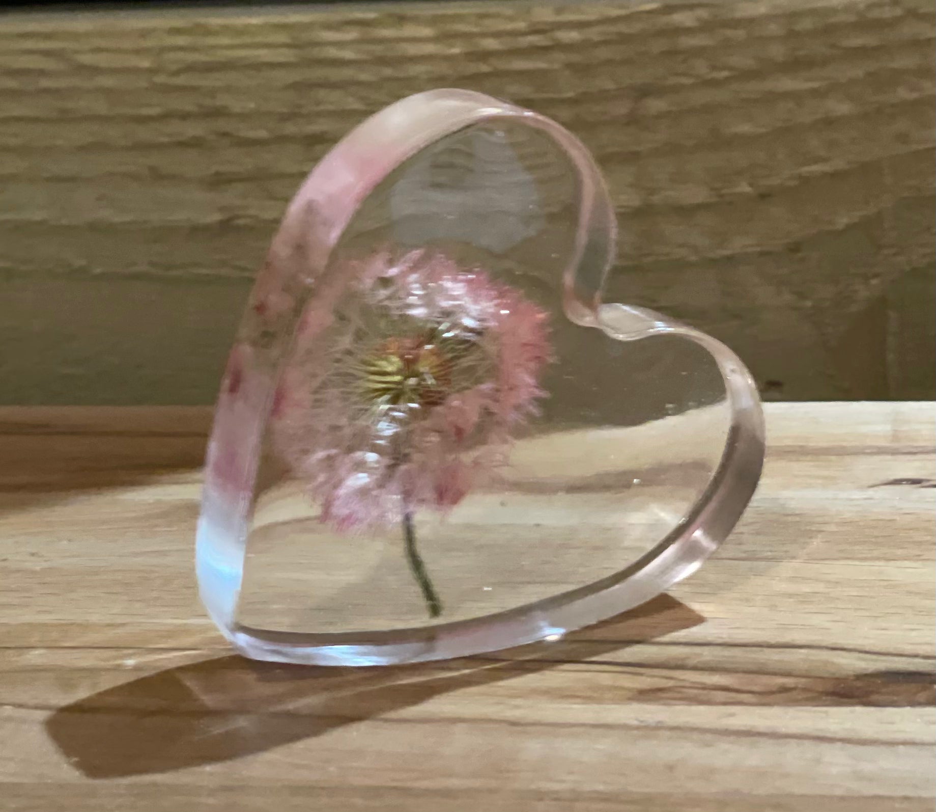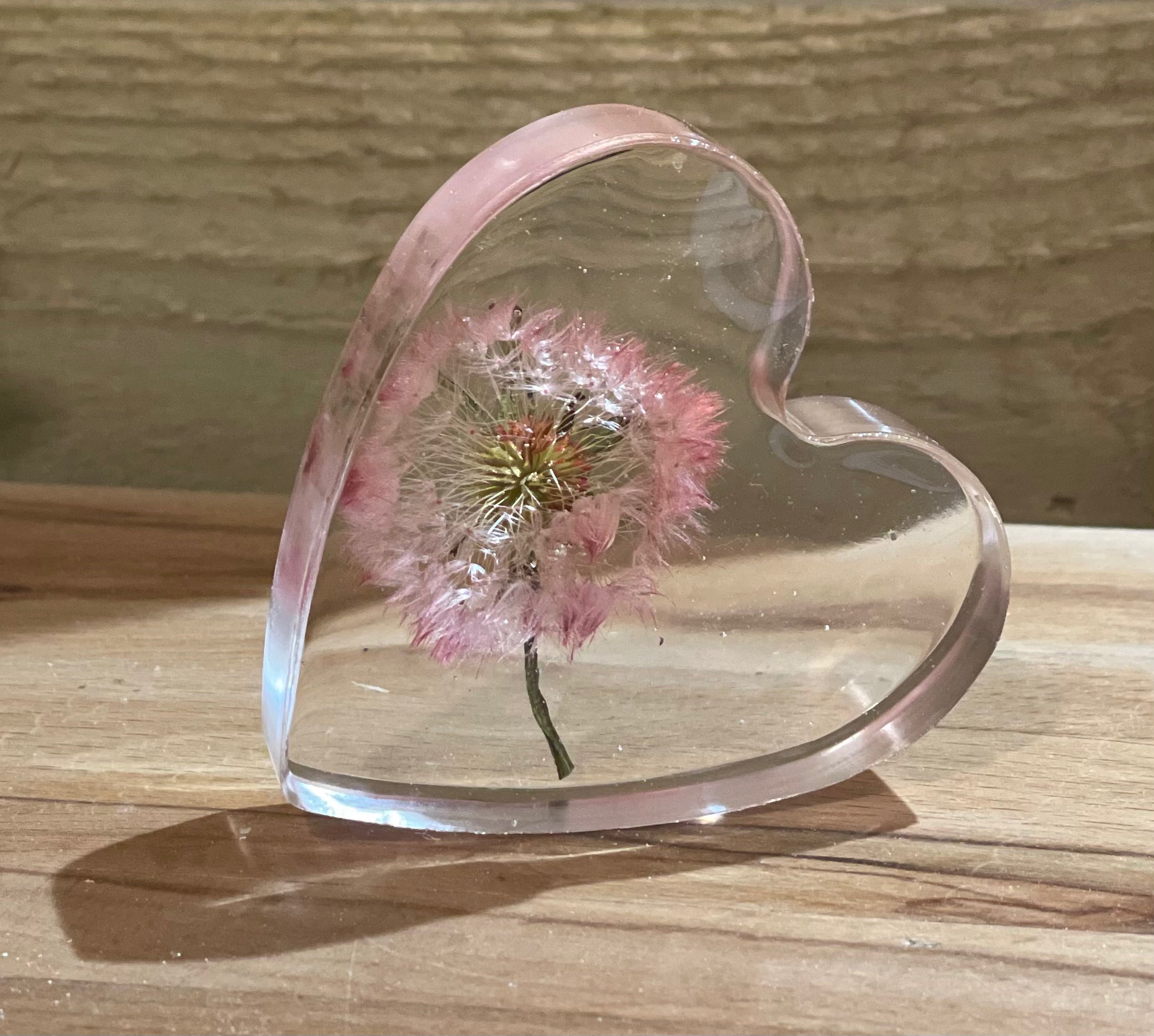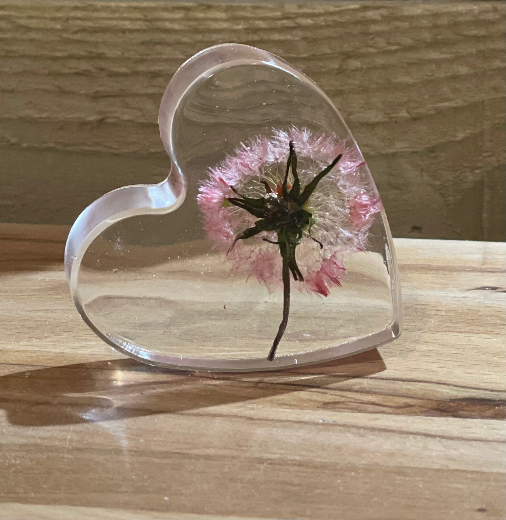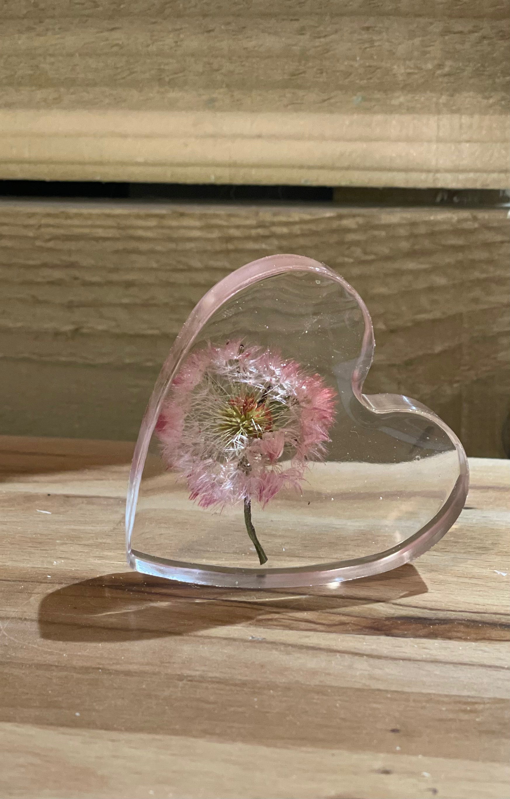 A beautiful free standing resin heart full of dandelion wishes and silver foil flecks for a touch of sparkle.