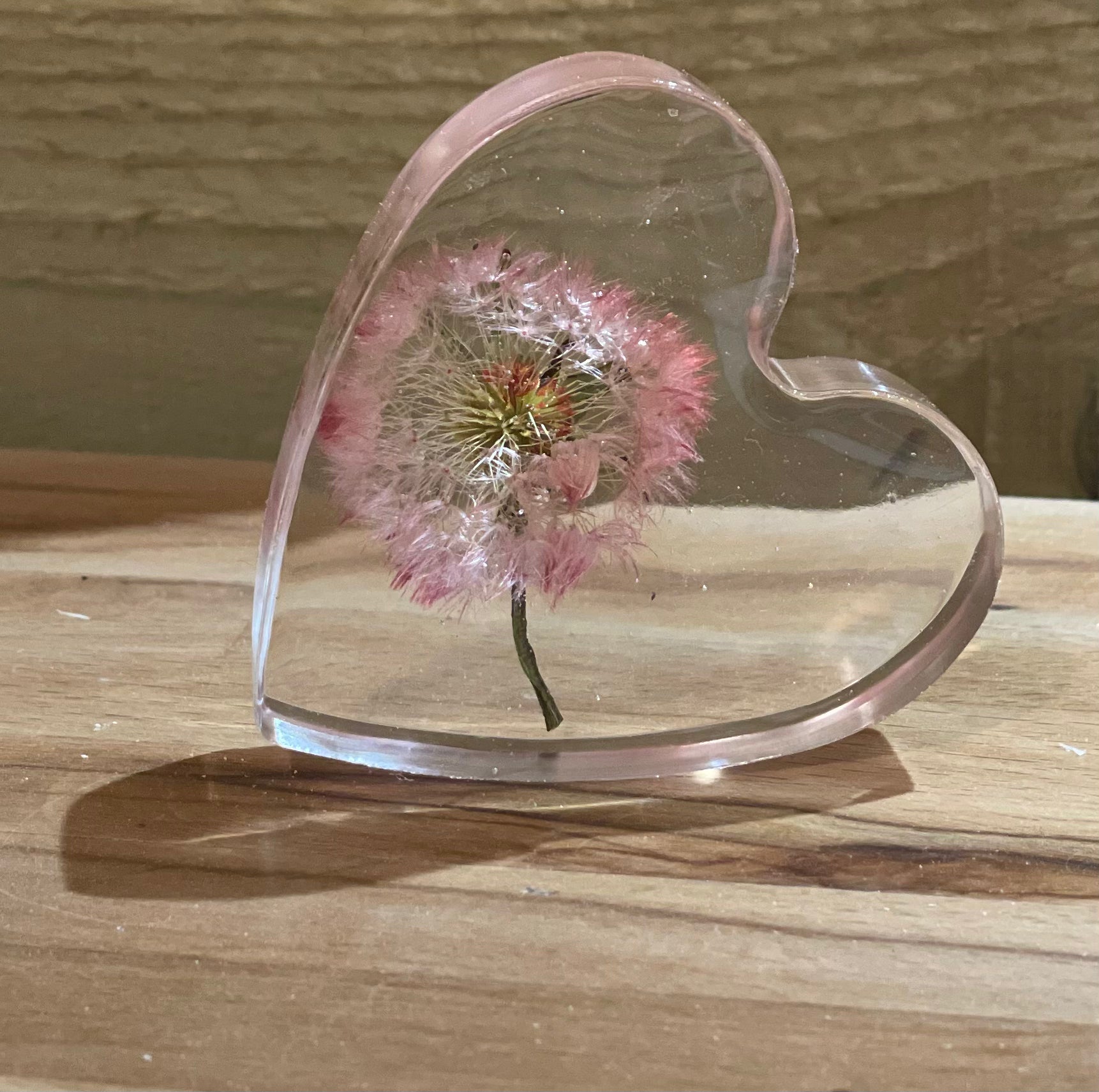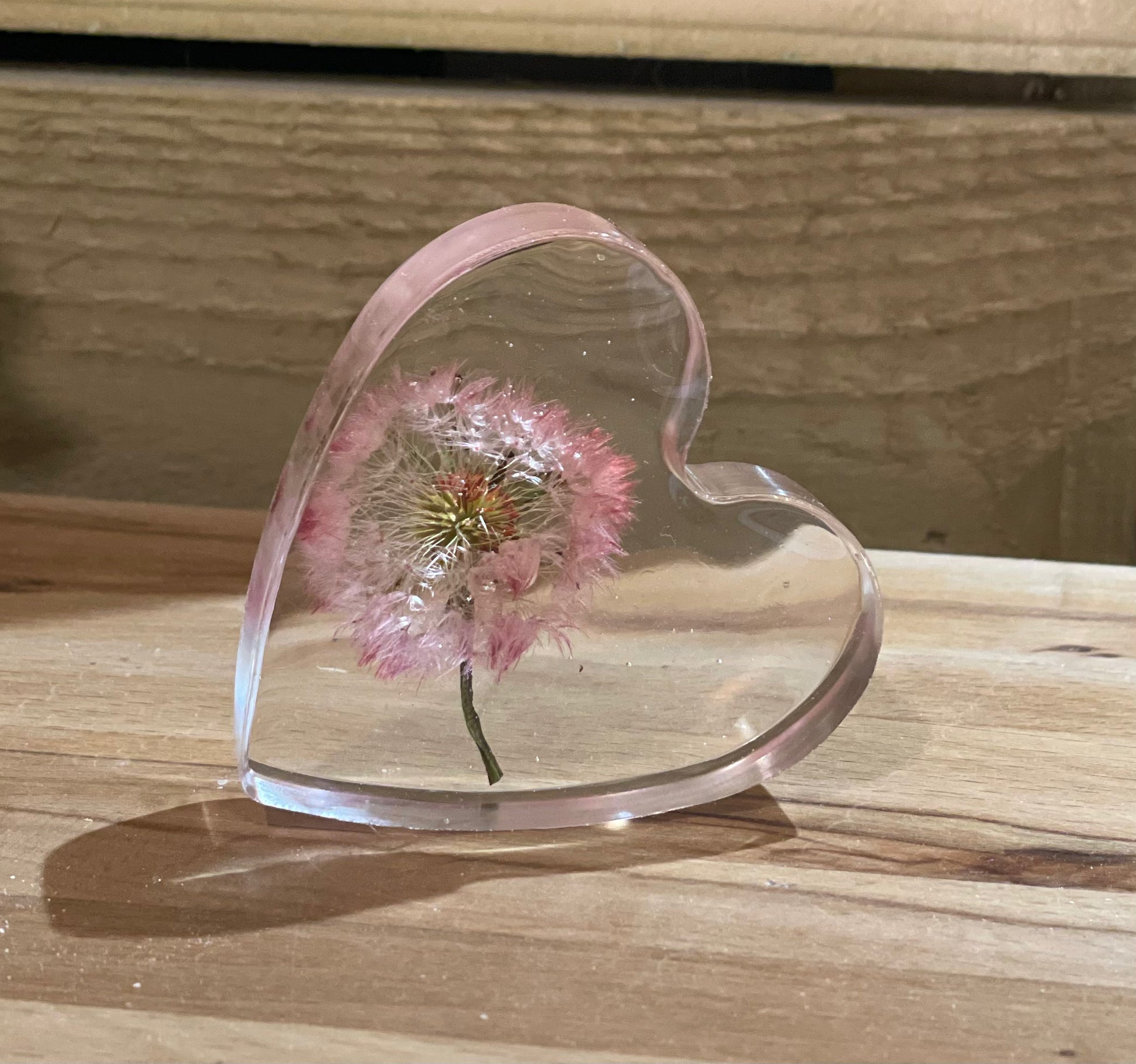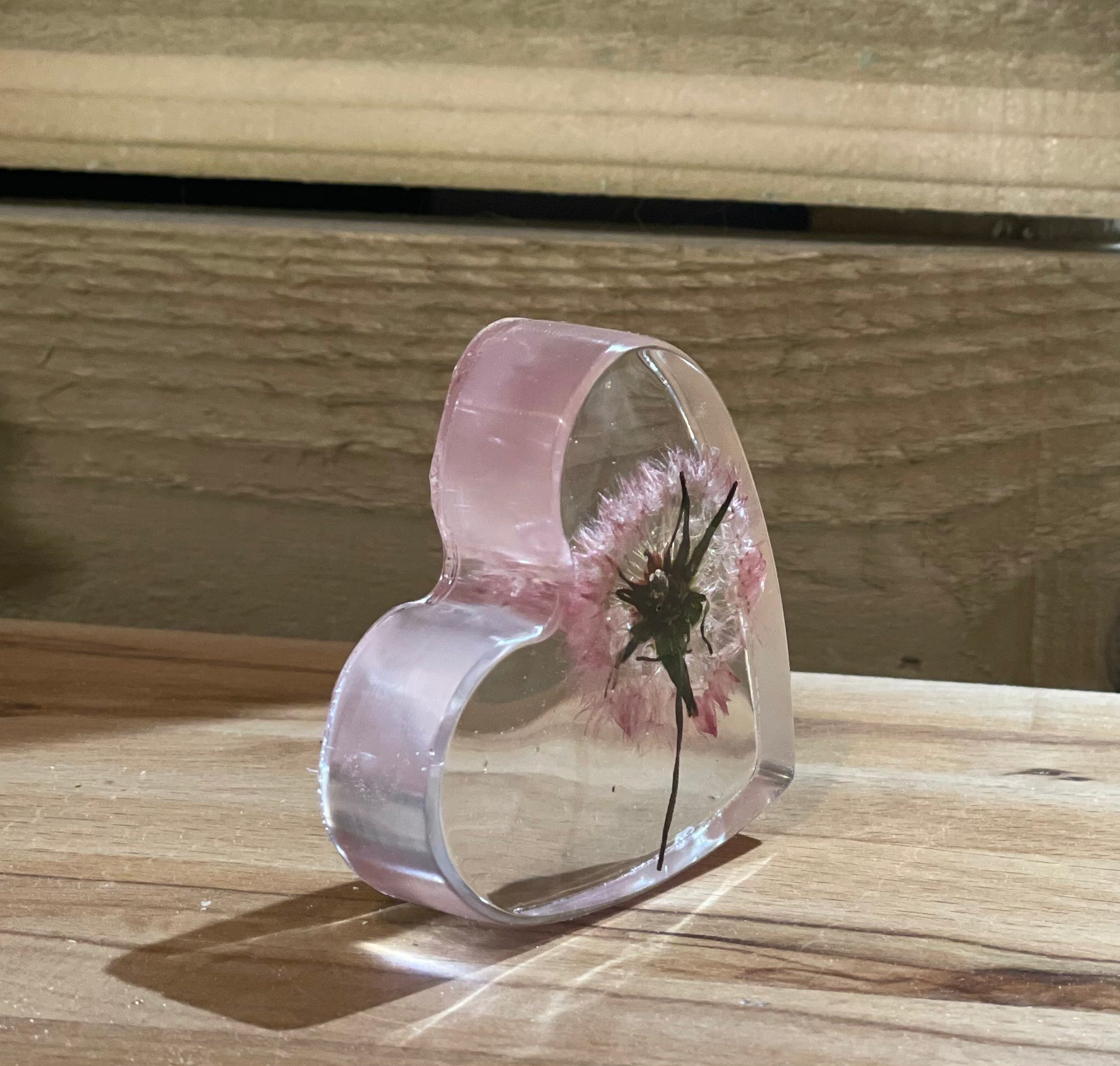 A beautiful free standing resin heart full of dandelion wishes and silver foil flecks for a touch of sparkle.