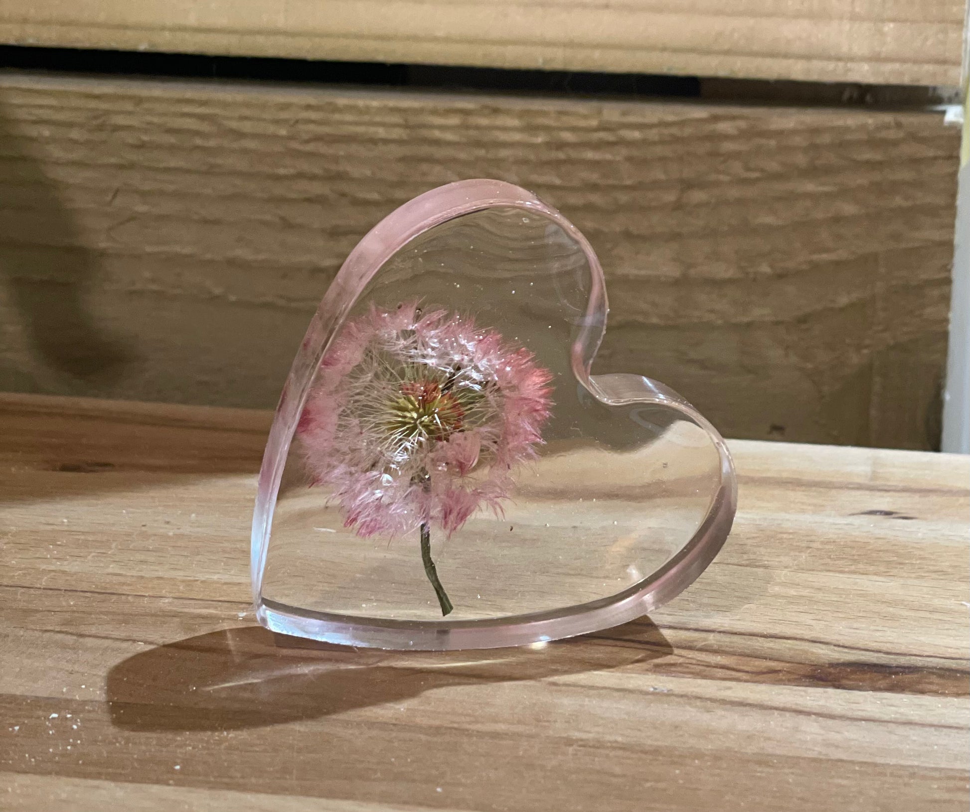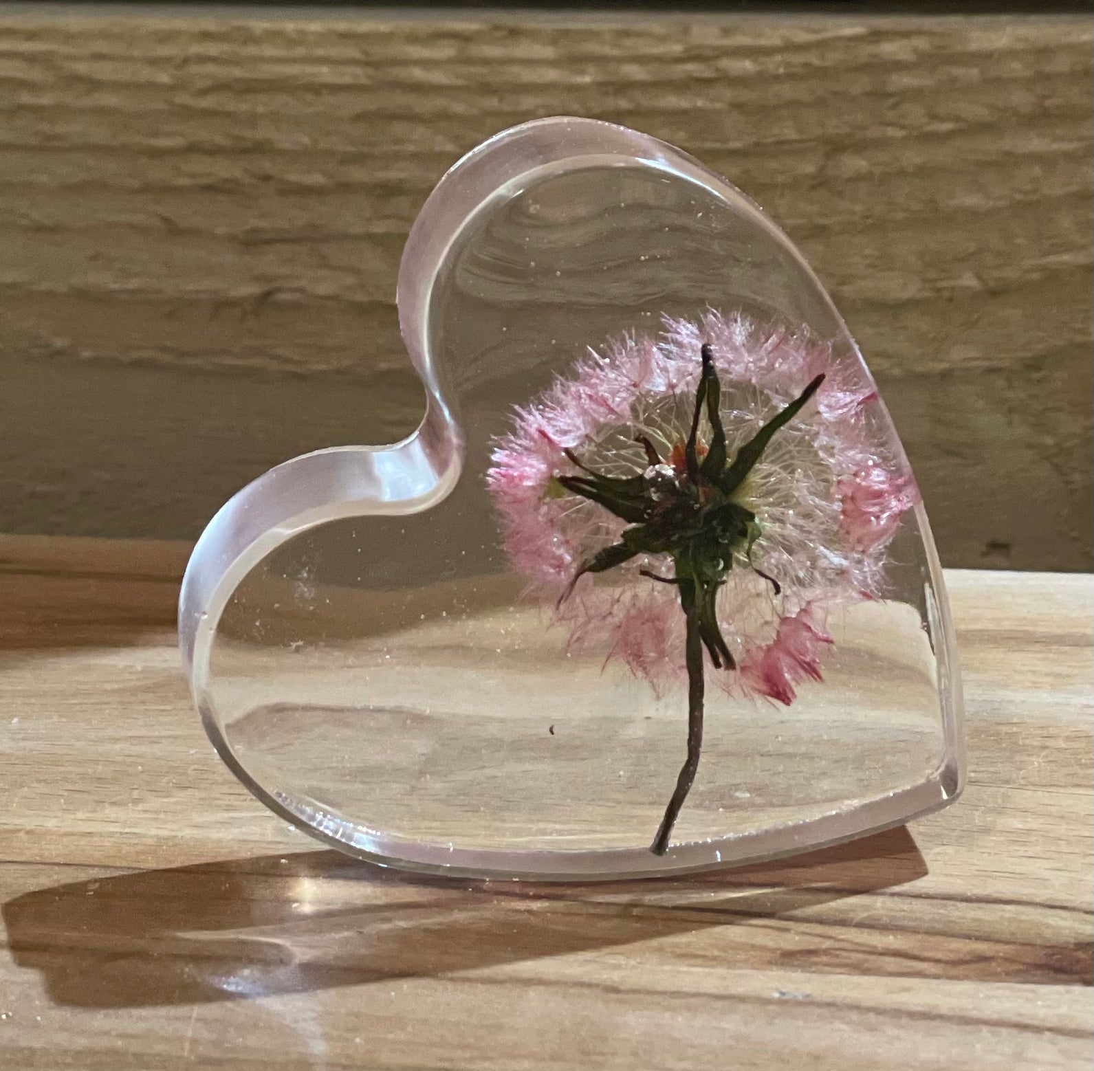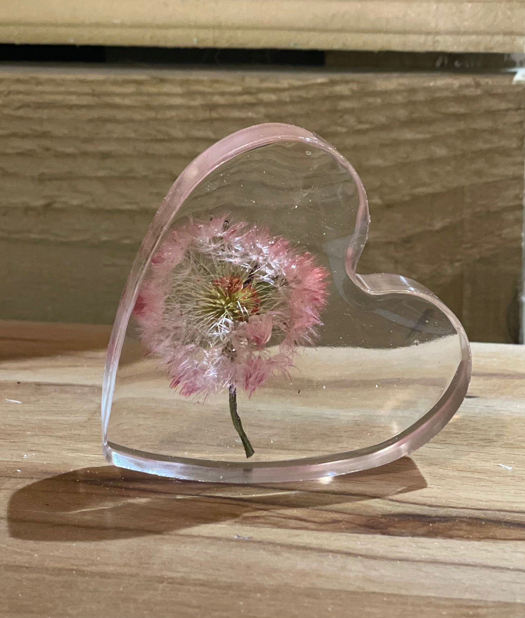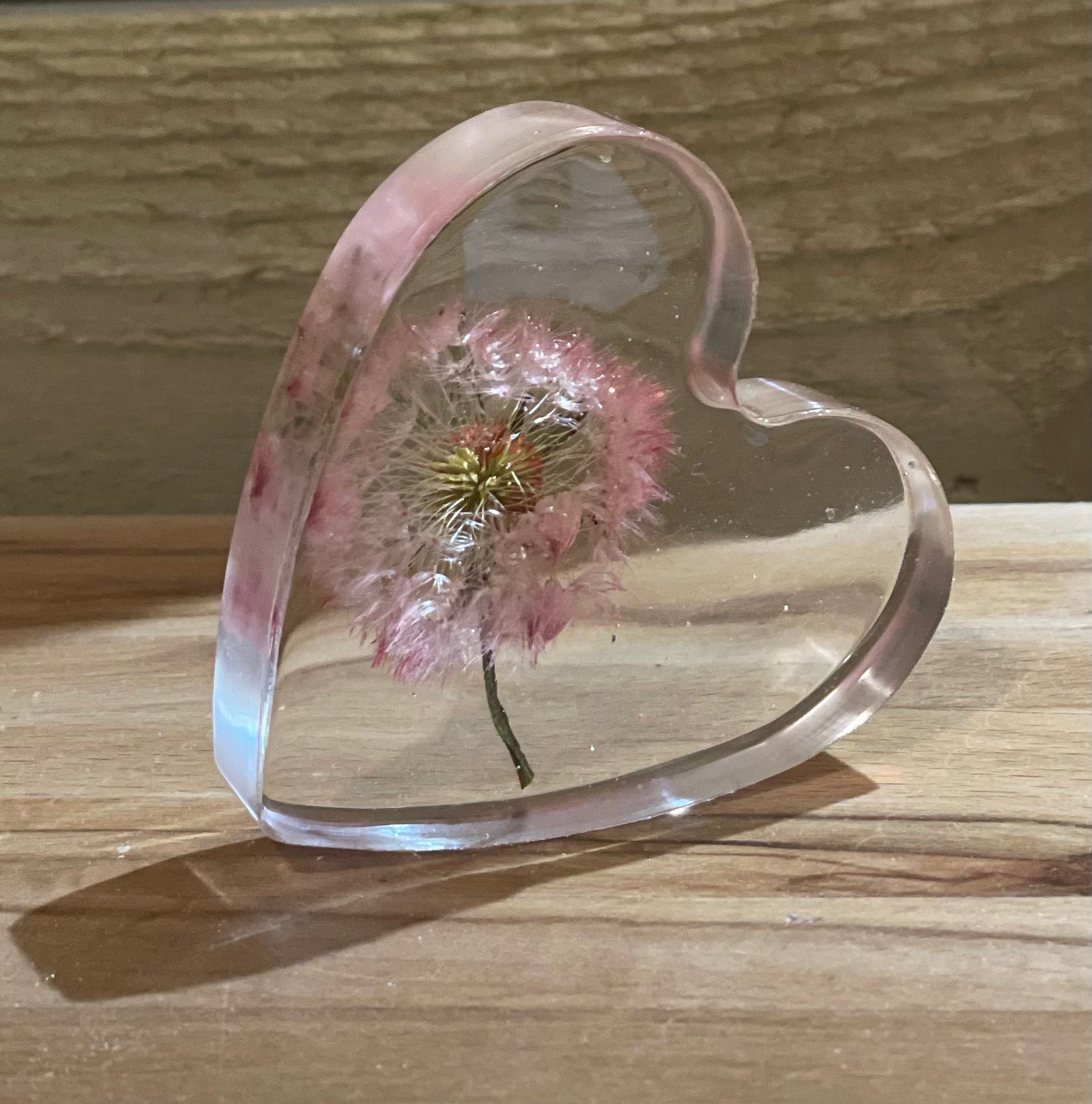 A beautiful free standing resin heart full of dandelion wishes and silver foil flecks for a touch of sparkle.