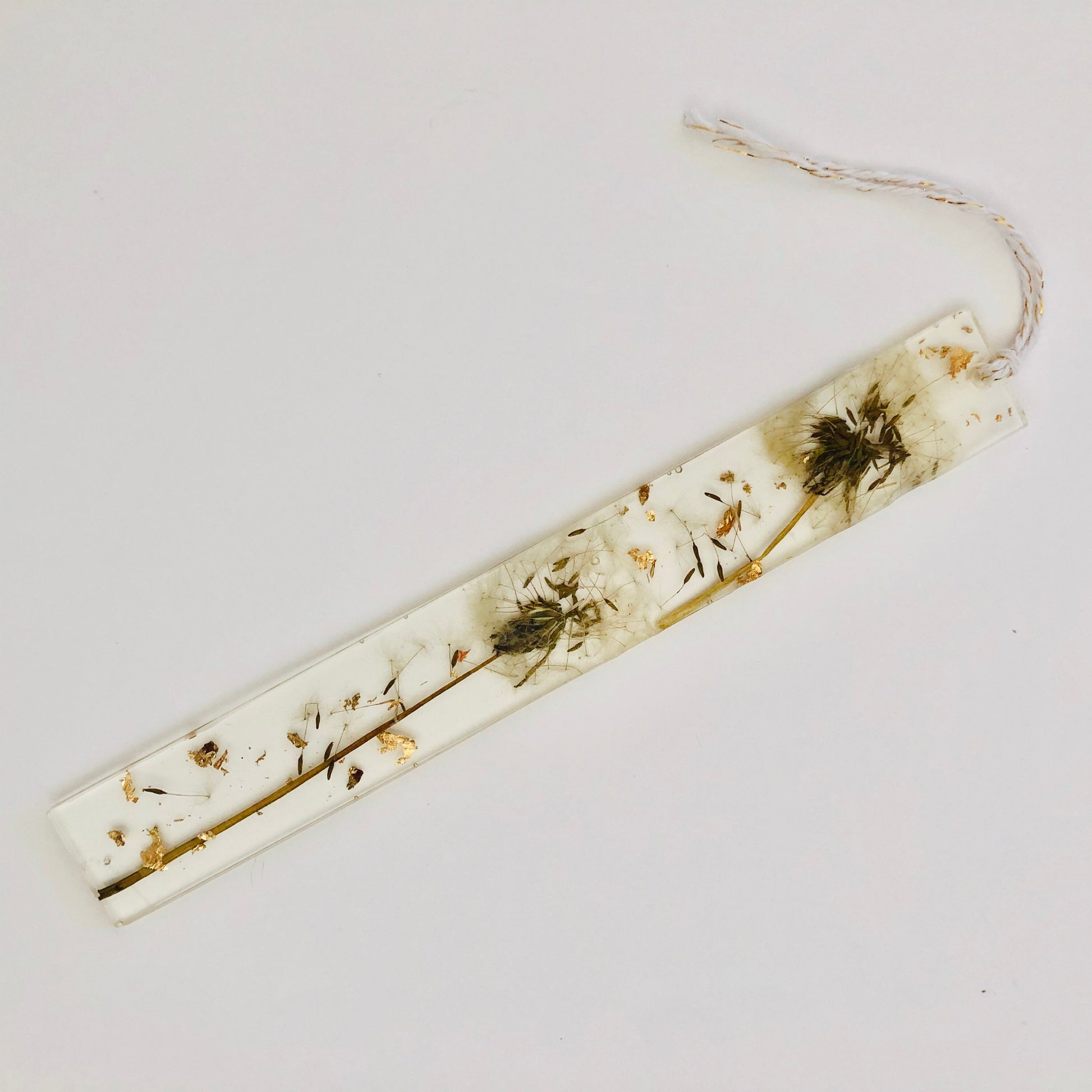 This beautiful handmade bookmark is full of real preserved dandelions with gold flakes.
