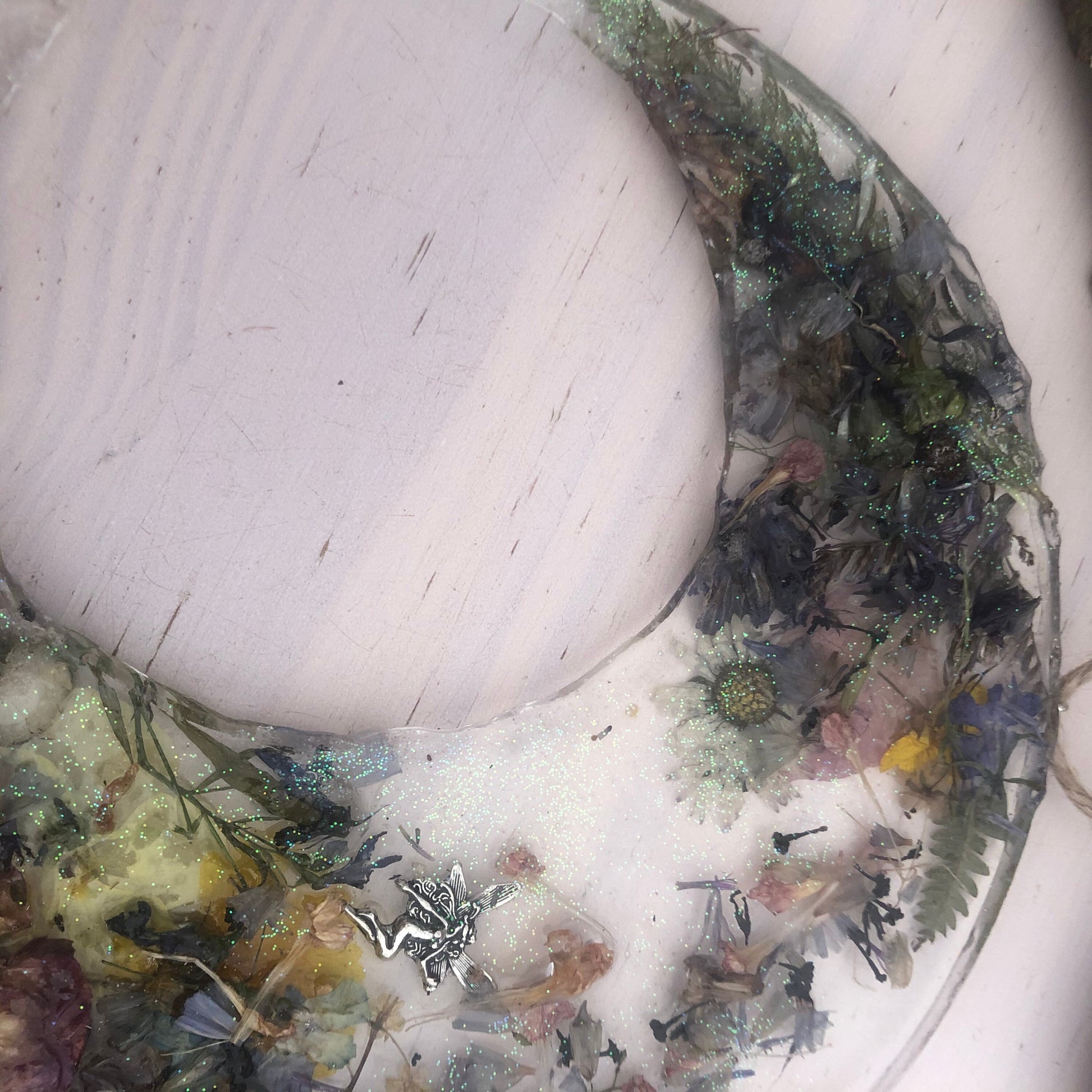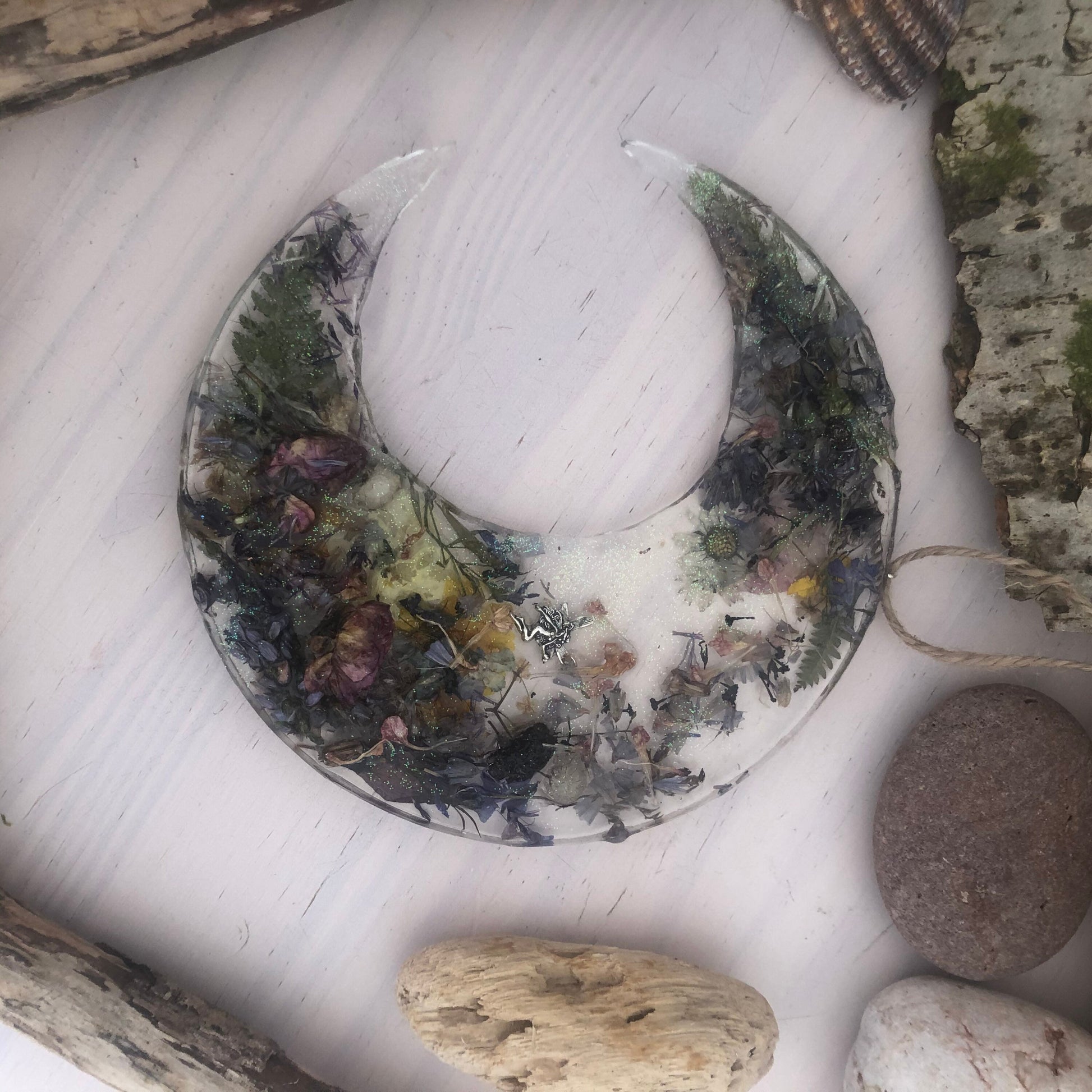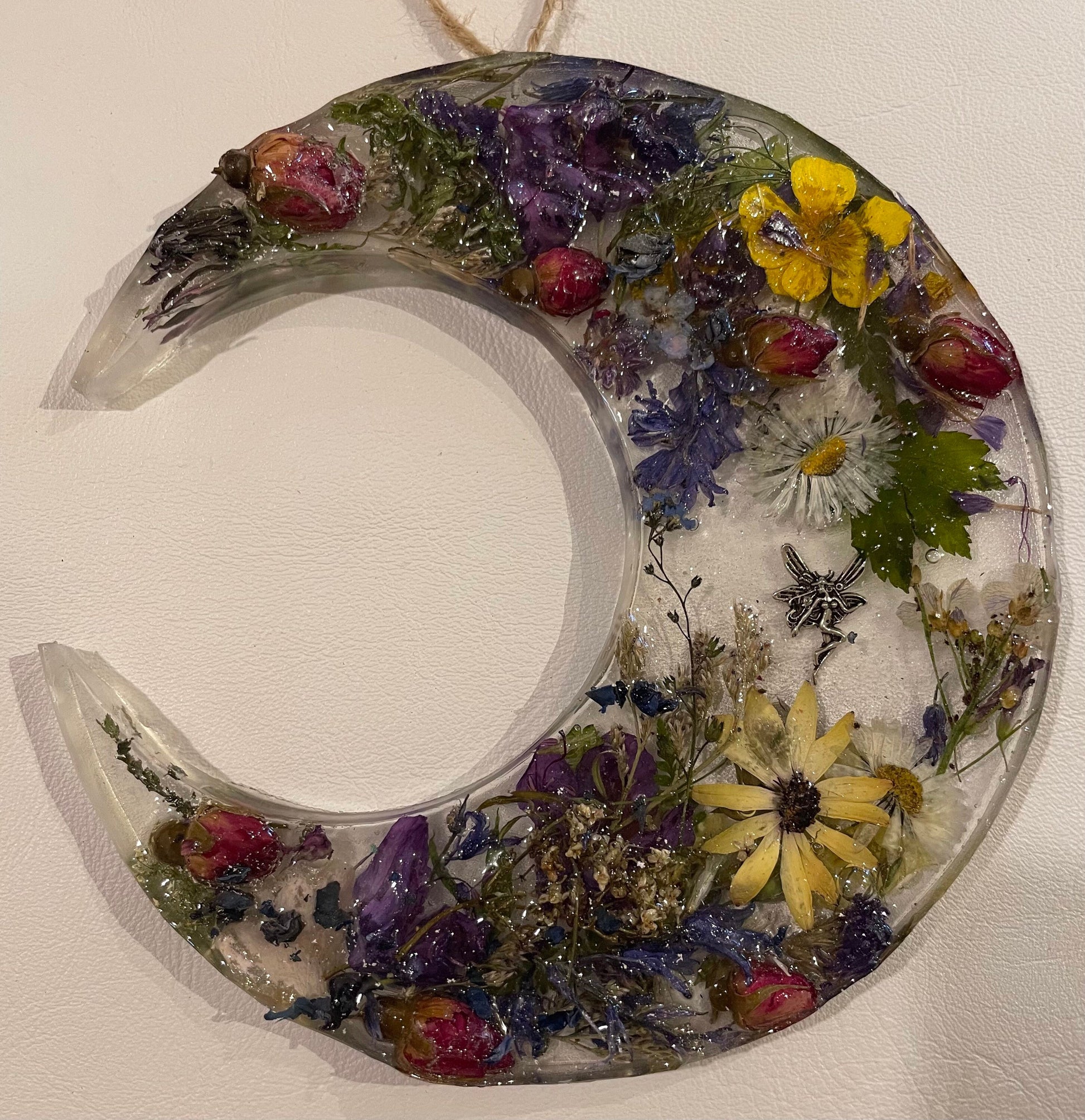 This is beautiful English country garden moon made from real flowers, and leaves set in resin. These are hand made to order so they may vary slightly as each flower and leaf is different !