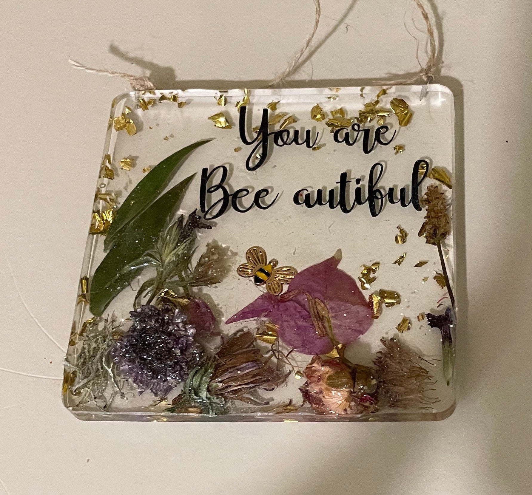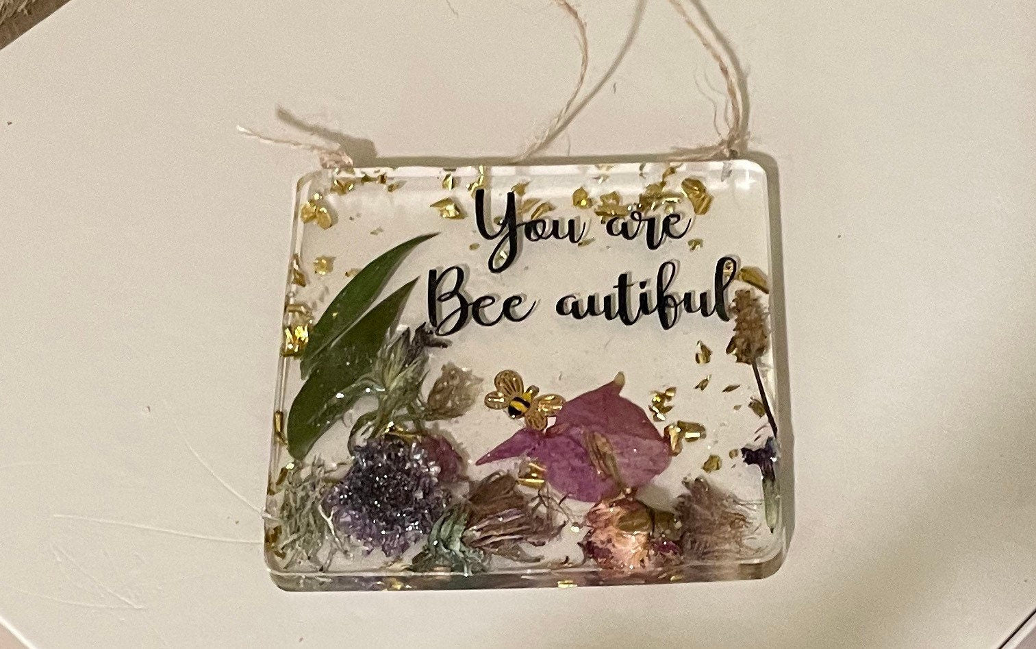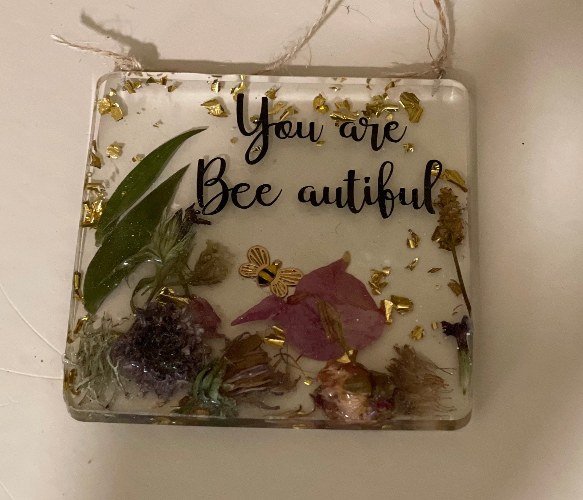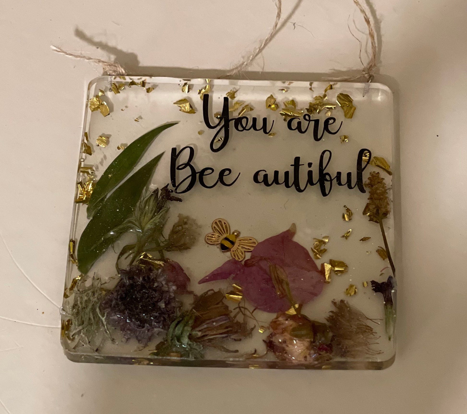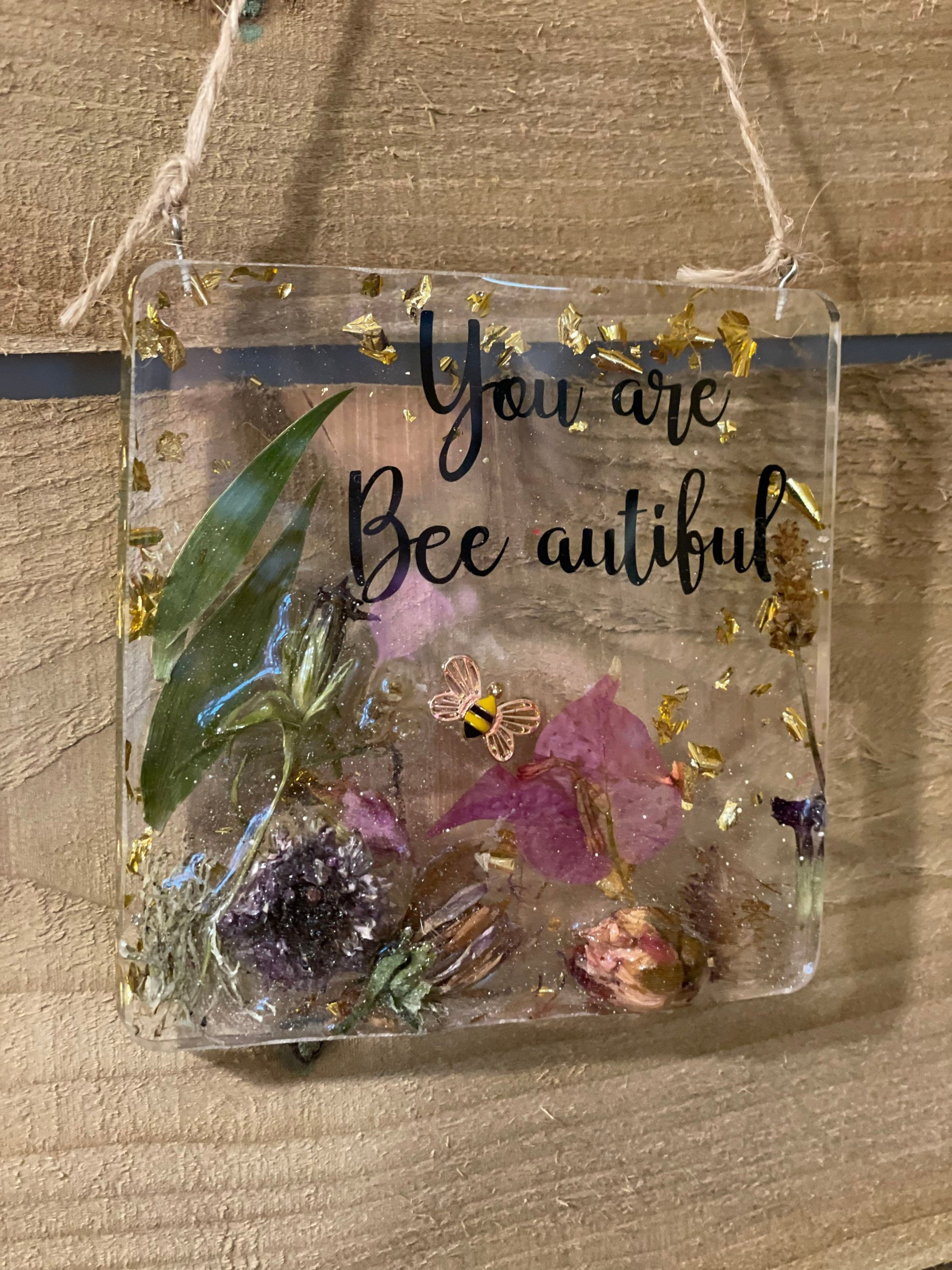 A beautiful flower scene with a golden. Bee , gold flecks and ‘You are Bee autiful’ set in it. Made from real flowers and leaves , set in resin and hung on twine.