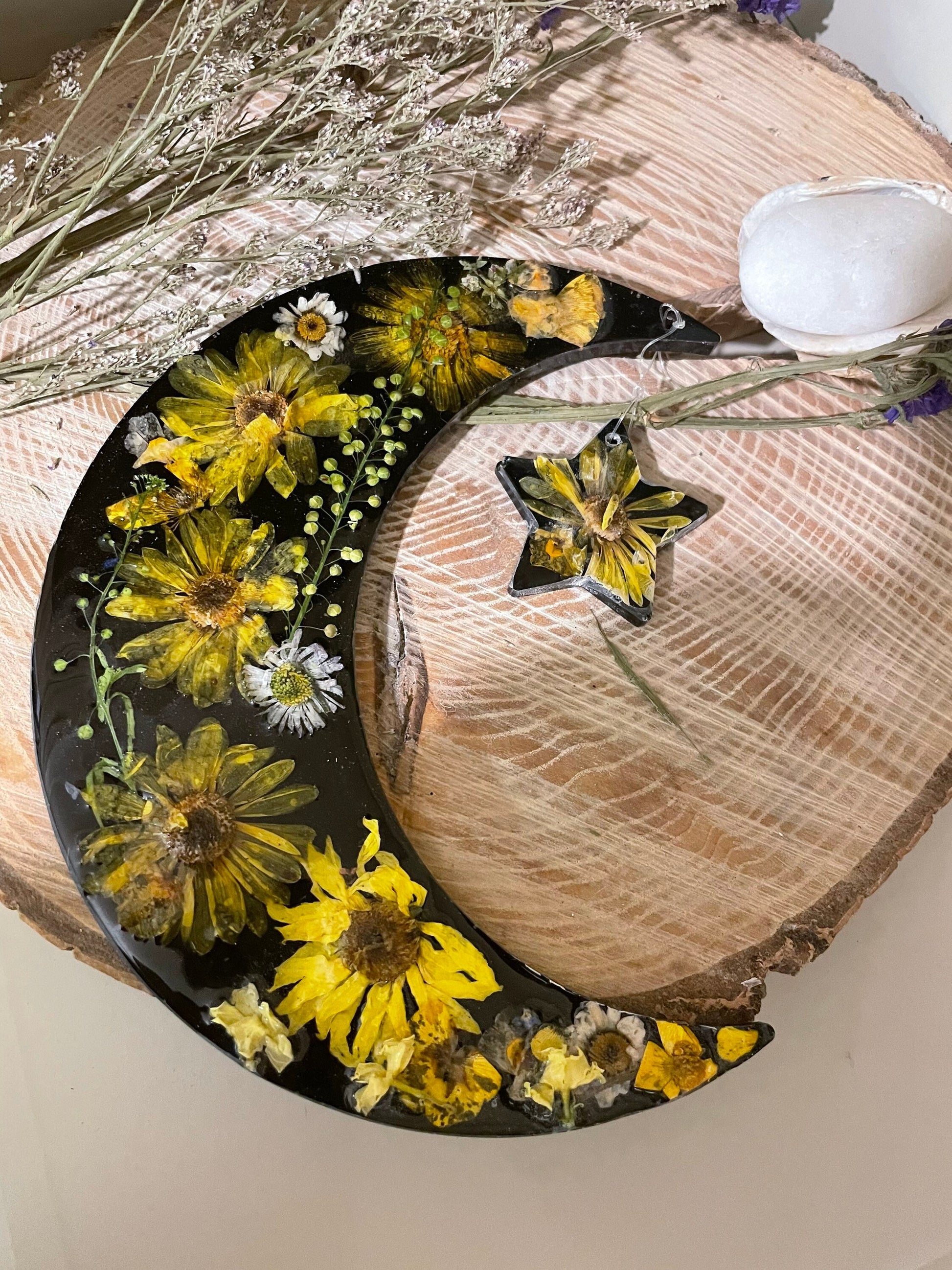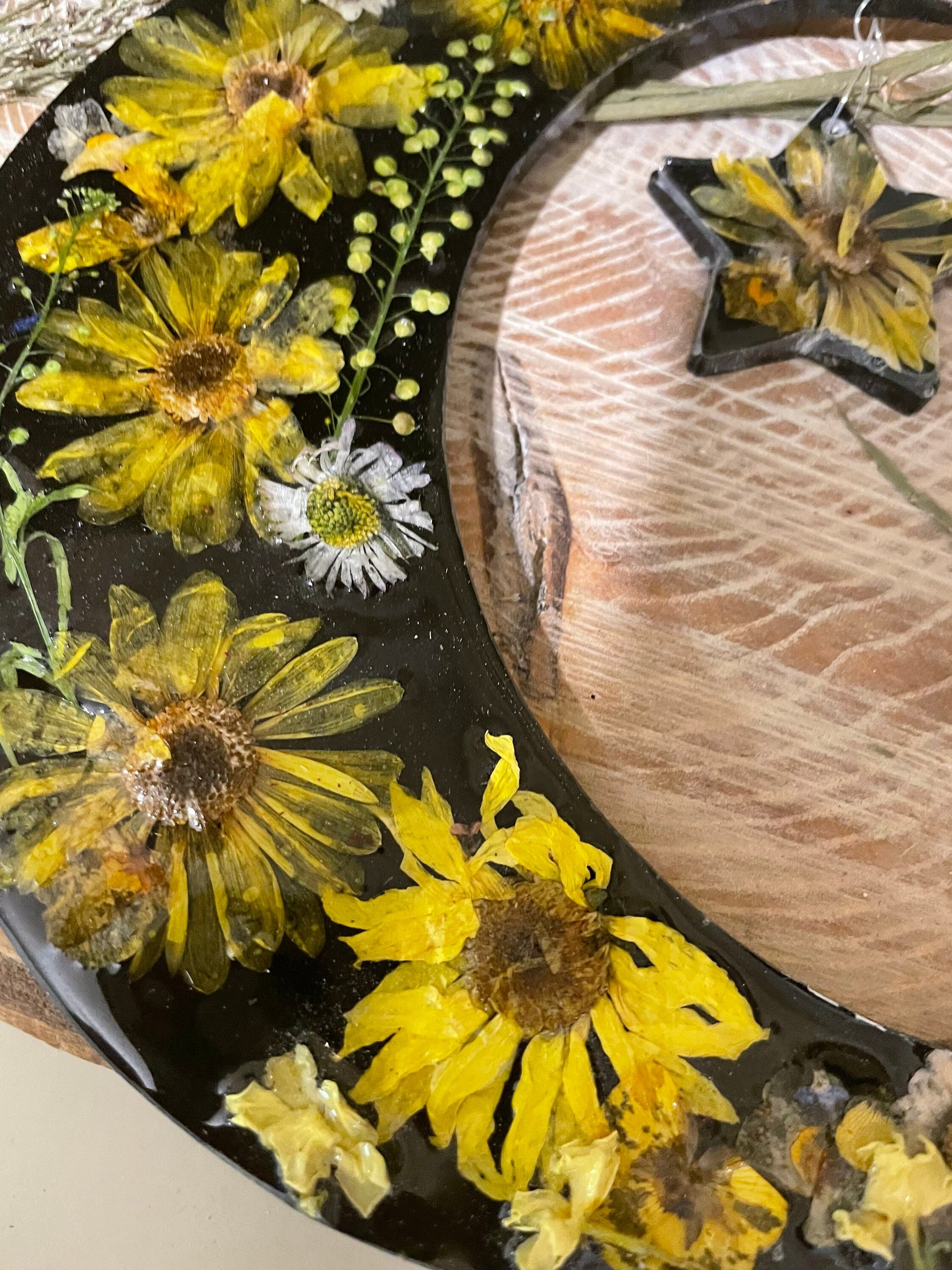 Real flower Resin moon hanging wall art,resin moon floral ornament,real flowers and moon resin decoration,real flowers in resin gift, June birthday gift