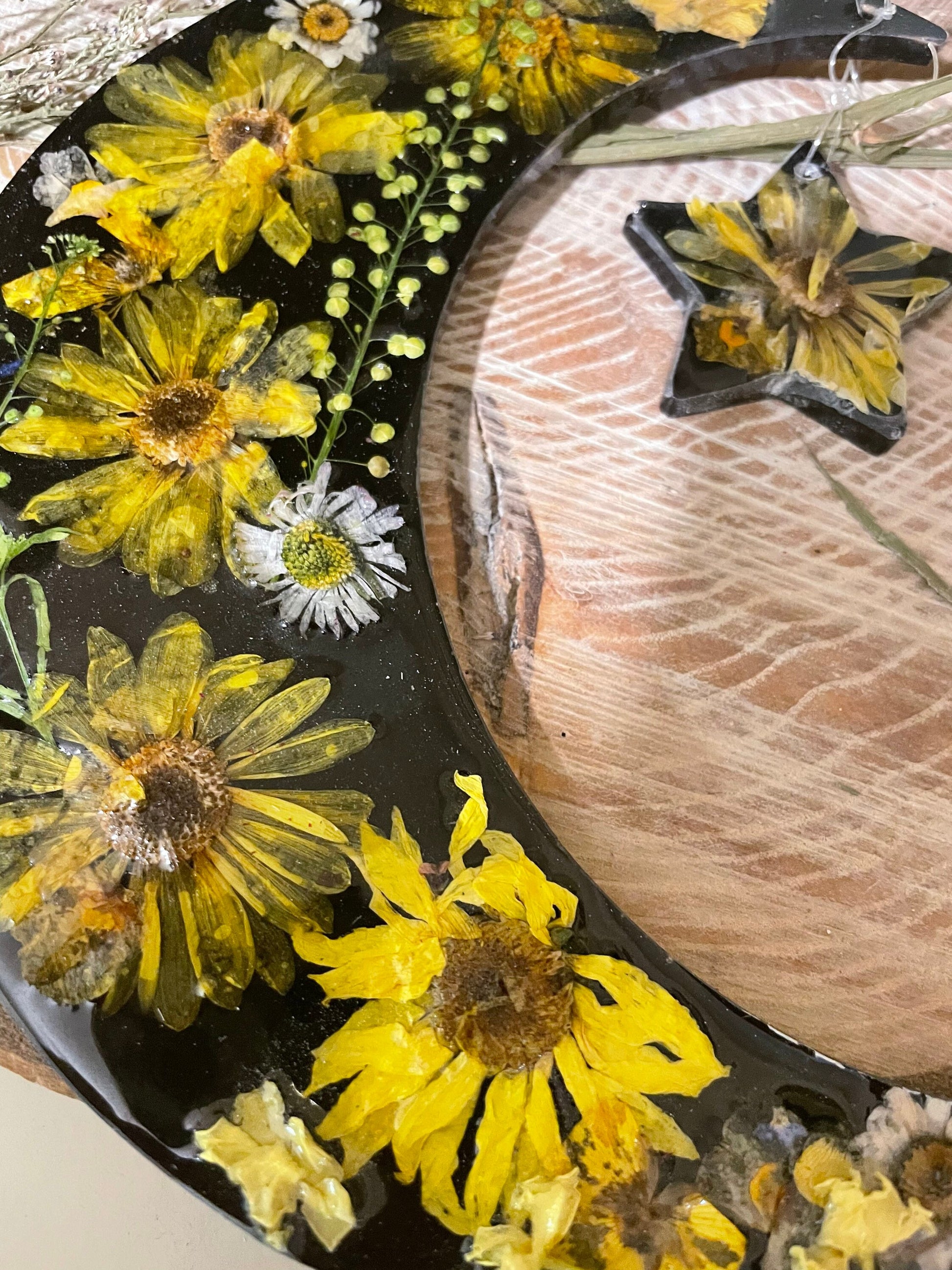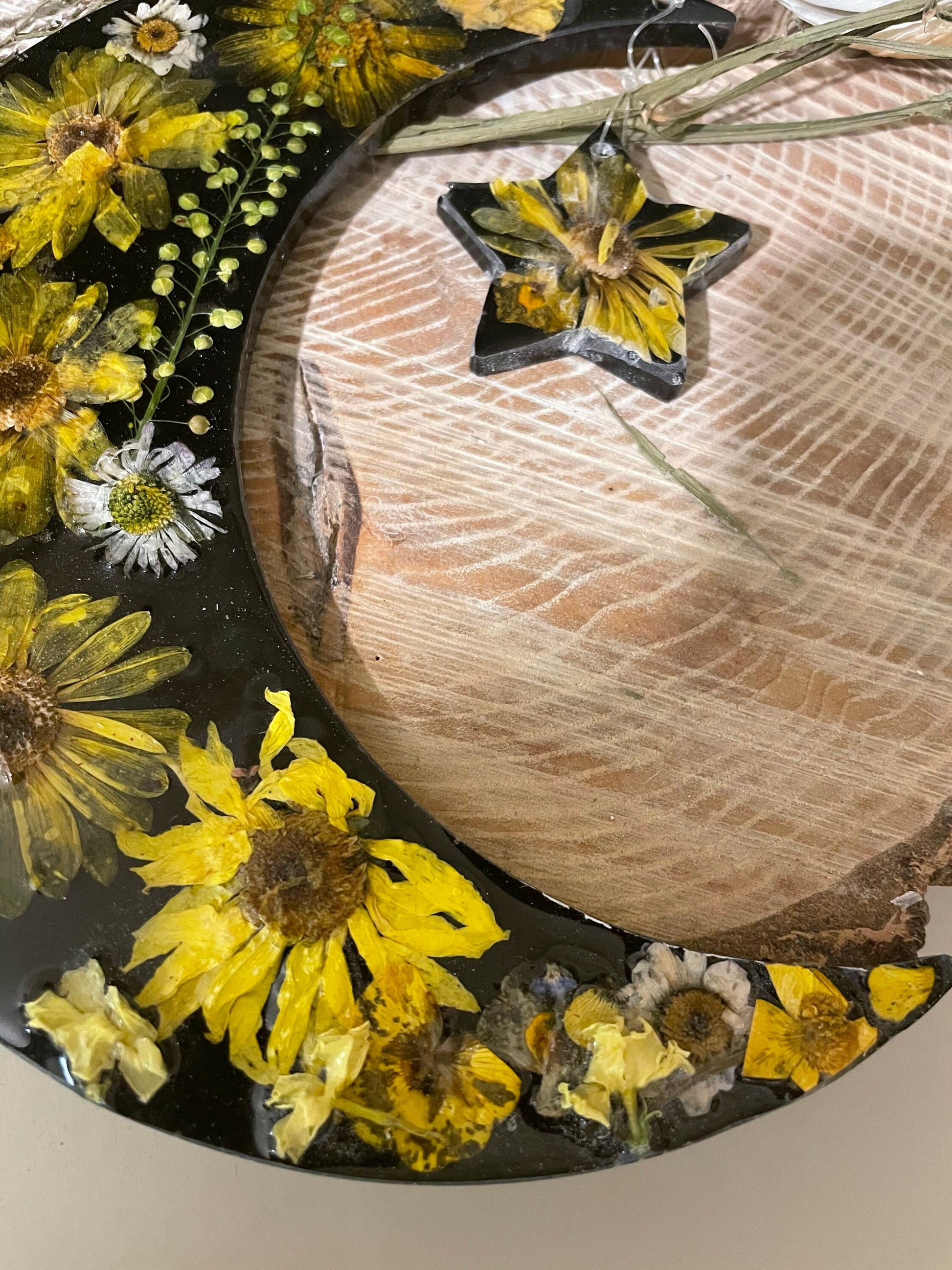 beautiful real yellow flowers fill this lunar inspired resin hanging ornament.