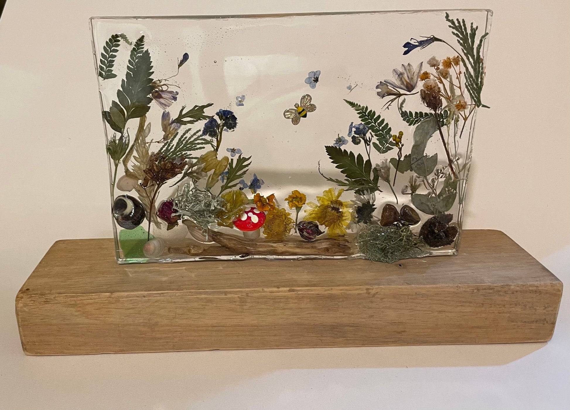 This is beautiful English country garden scene made from real flowers, leaves, shells and twigs, set in resin and displayed on a wooden stand.