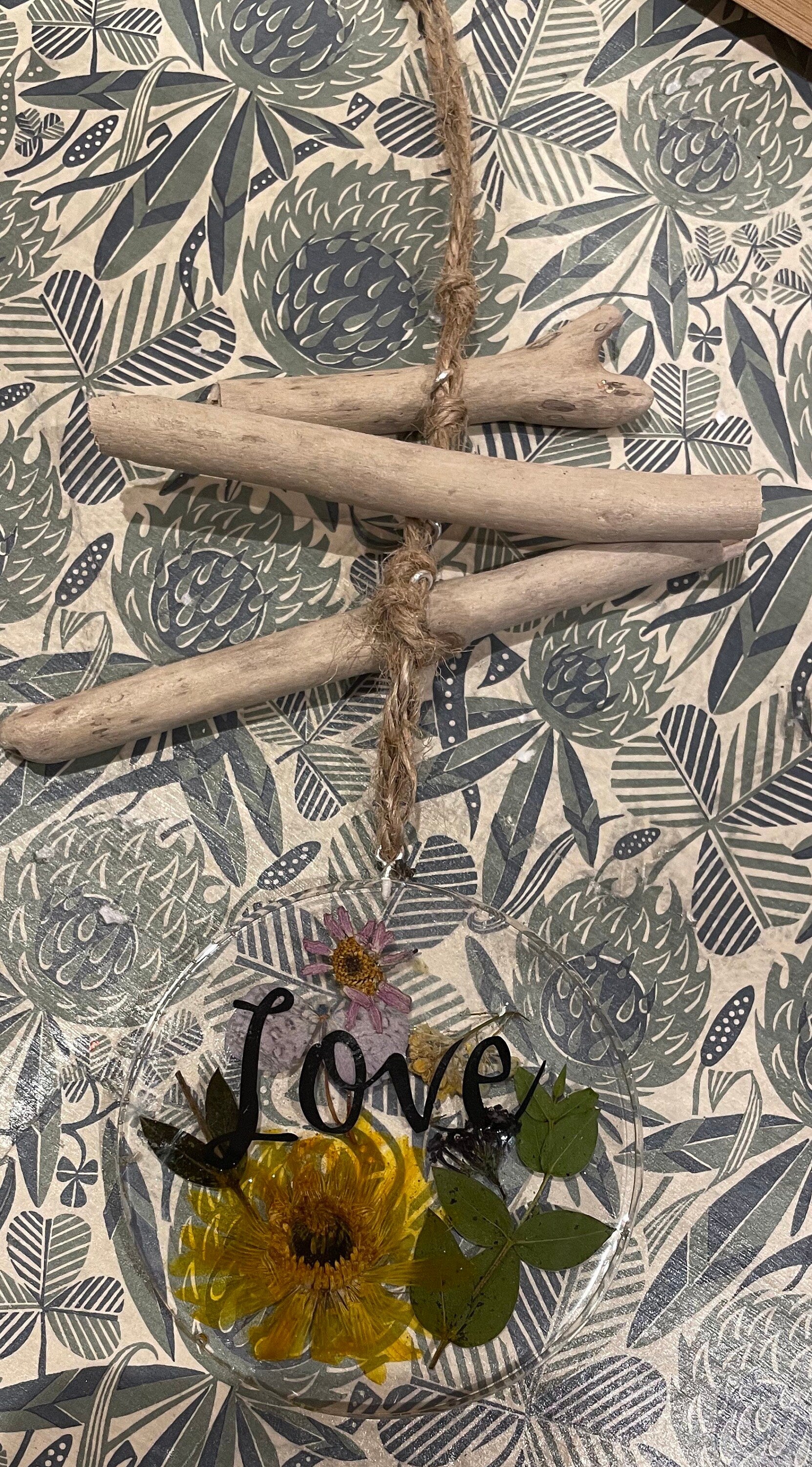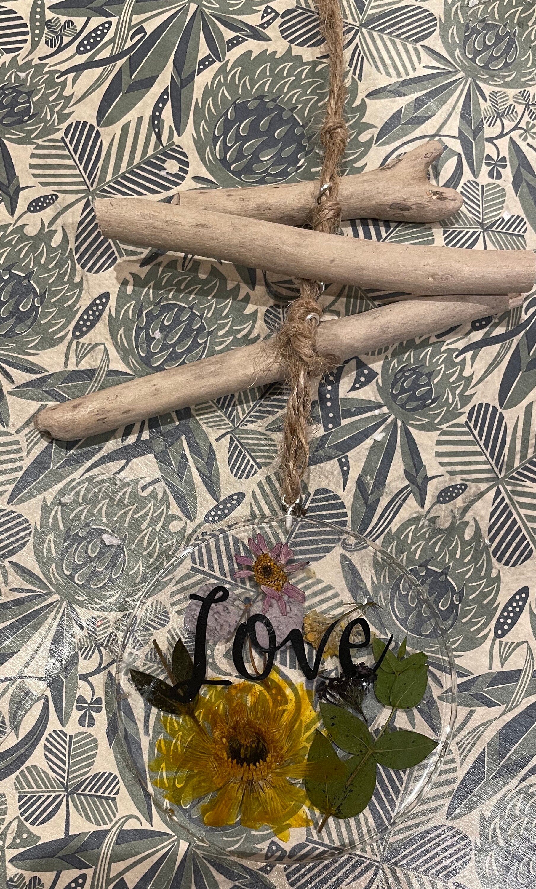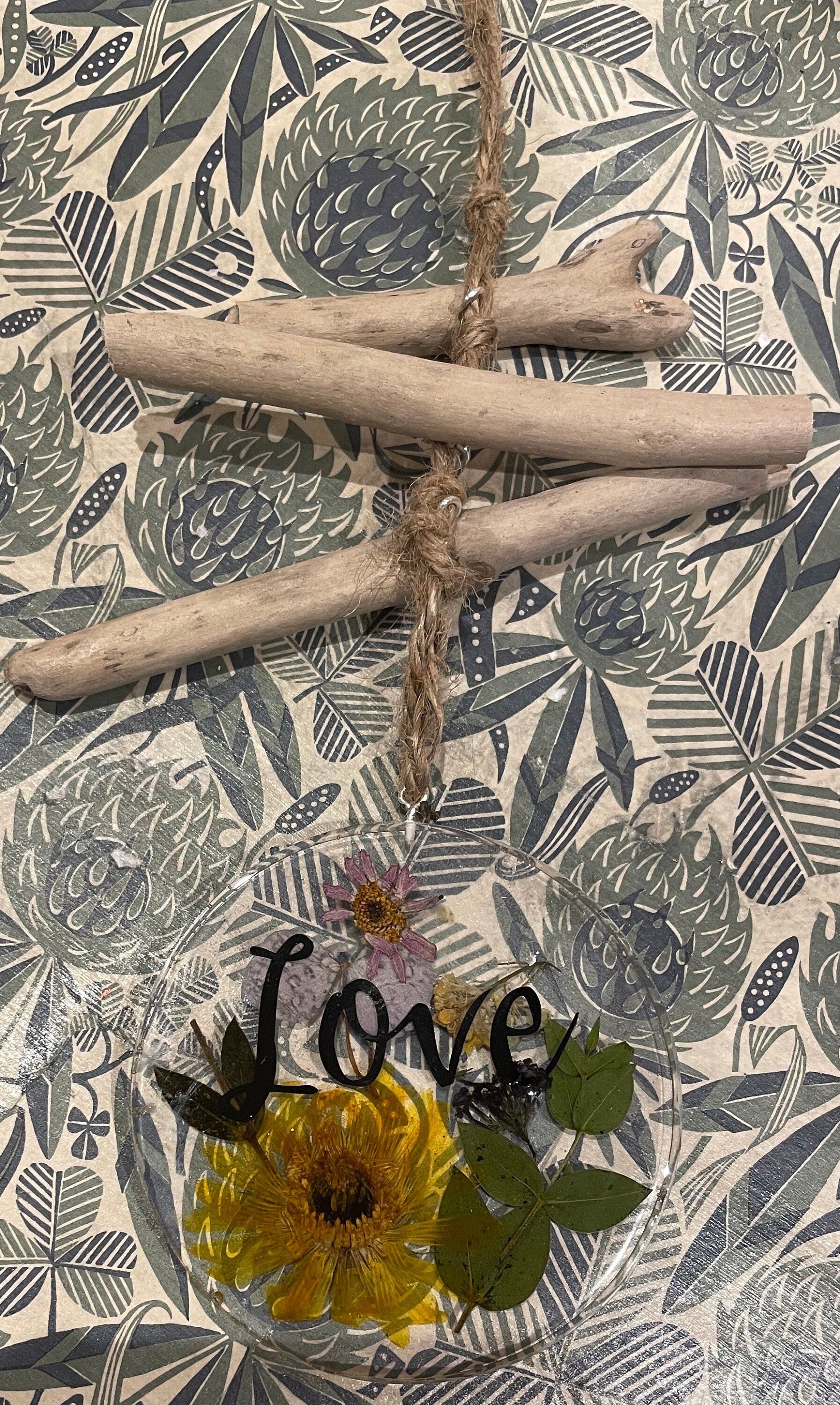 This beautiful hanging decoration has a whole rainbow of petals in it. The word love and a love heart has been added.