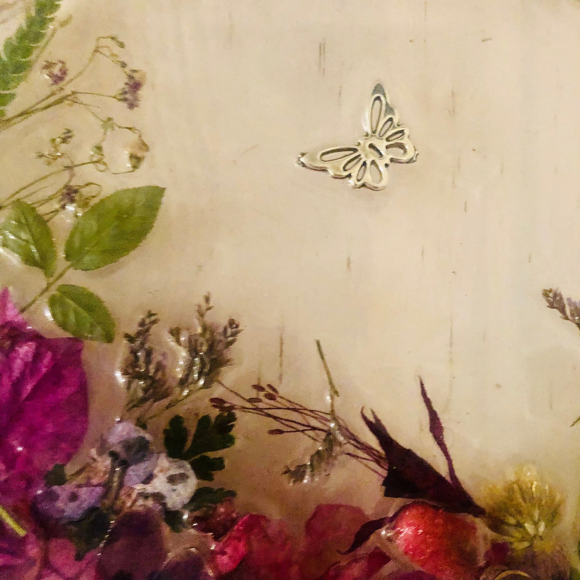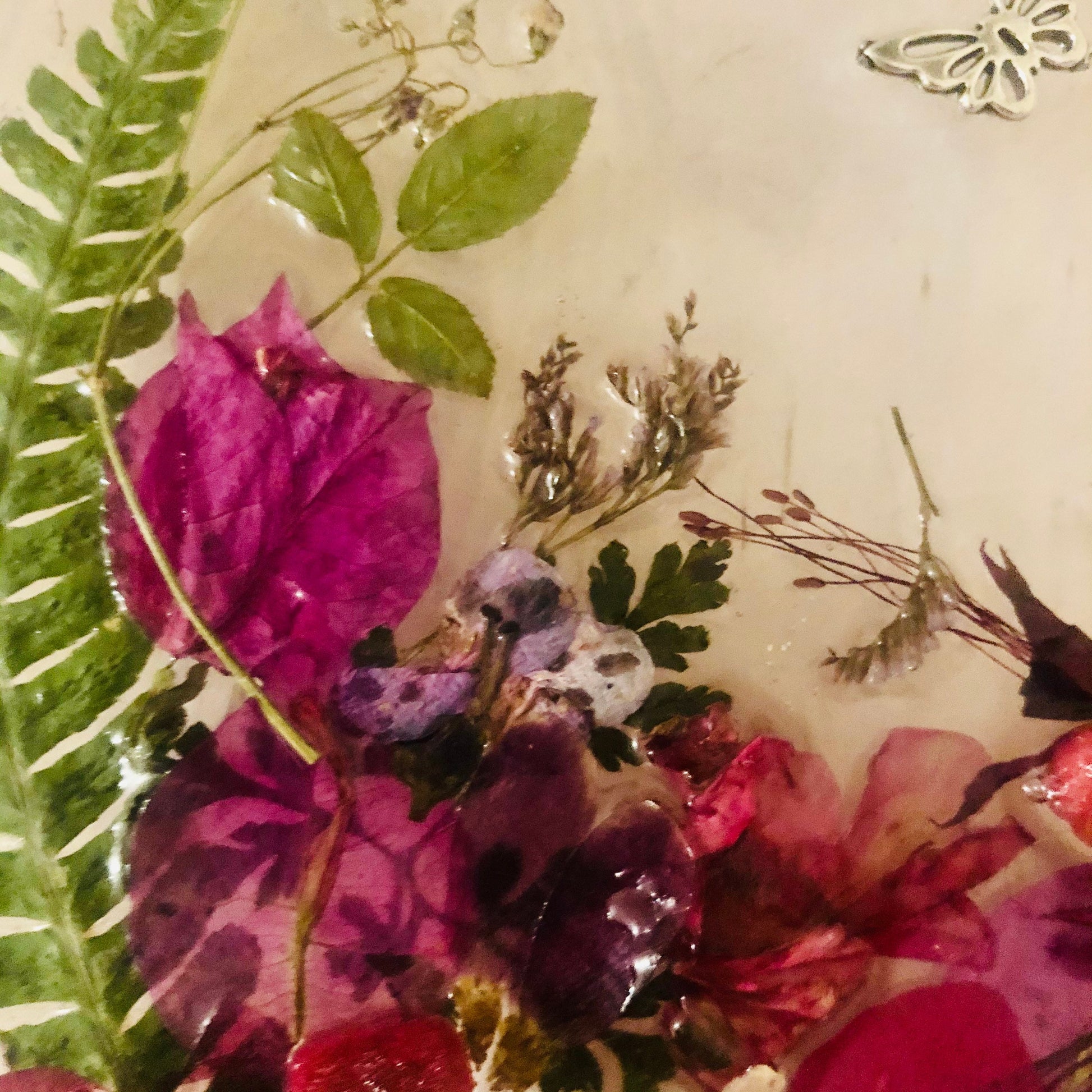 All of our items are unique and handmade with love and care using real pressed flower and foliage preserved in epoxy resin. We grow as many of our own flowers as we can, but occasionally we do have to outsource to meet demands.
