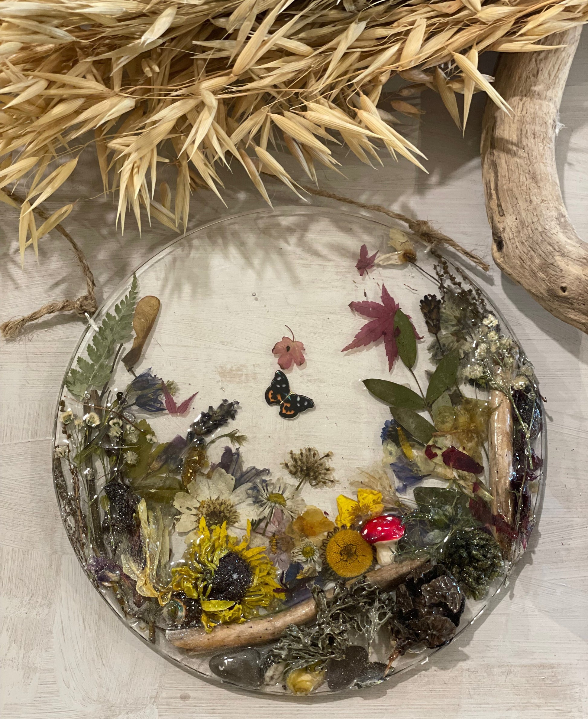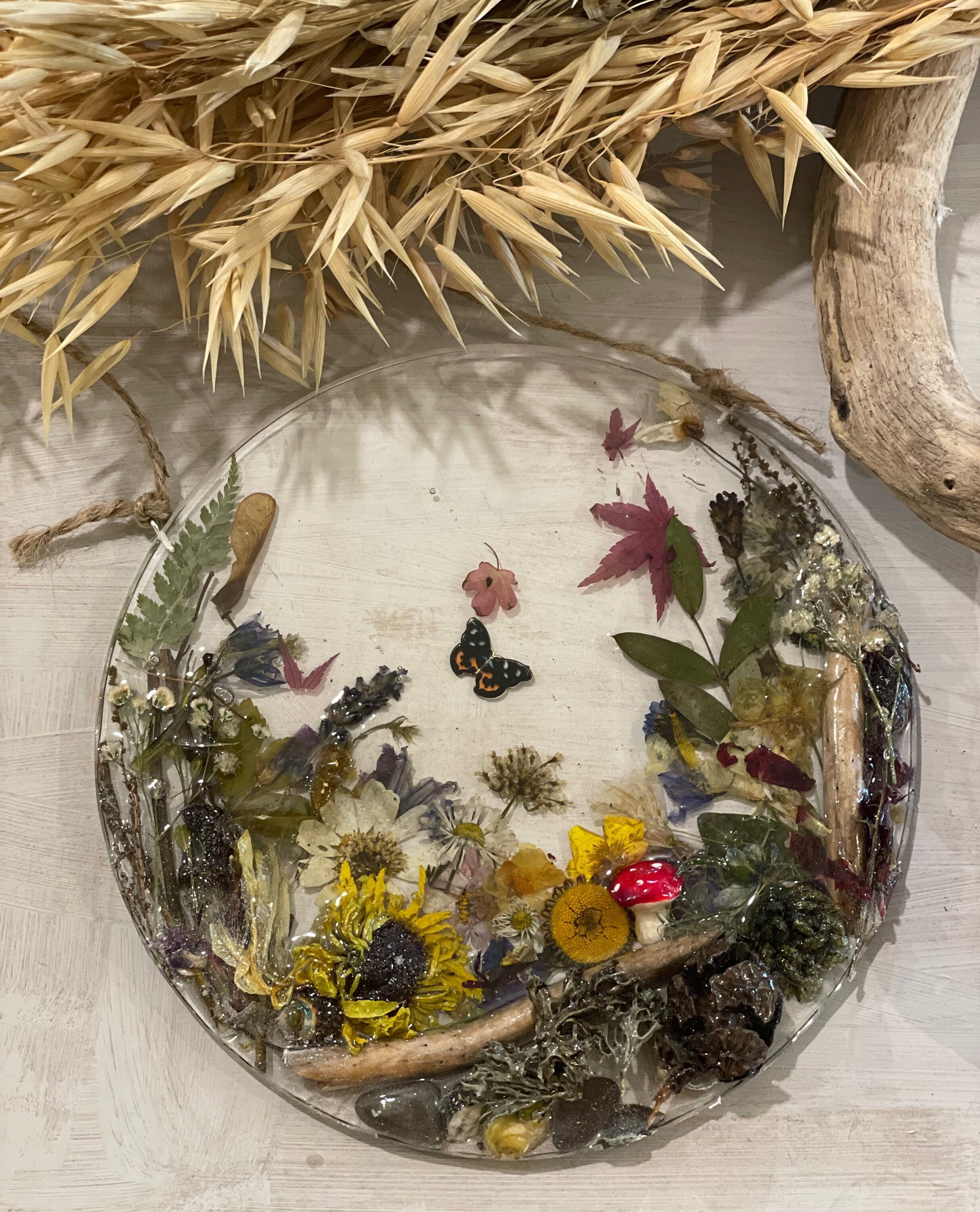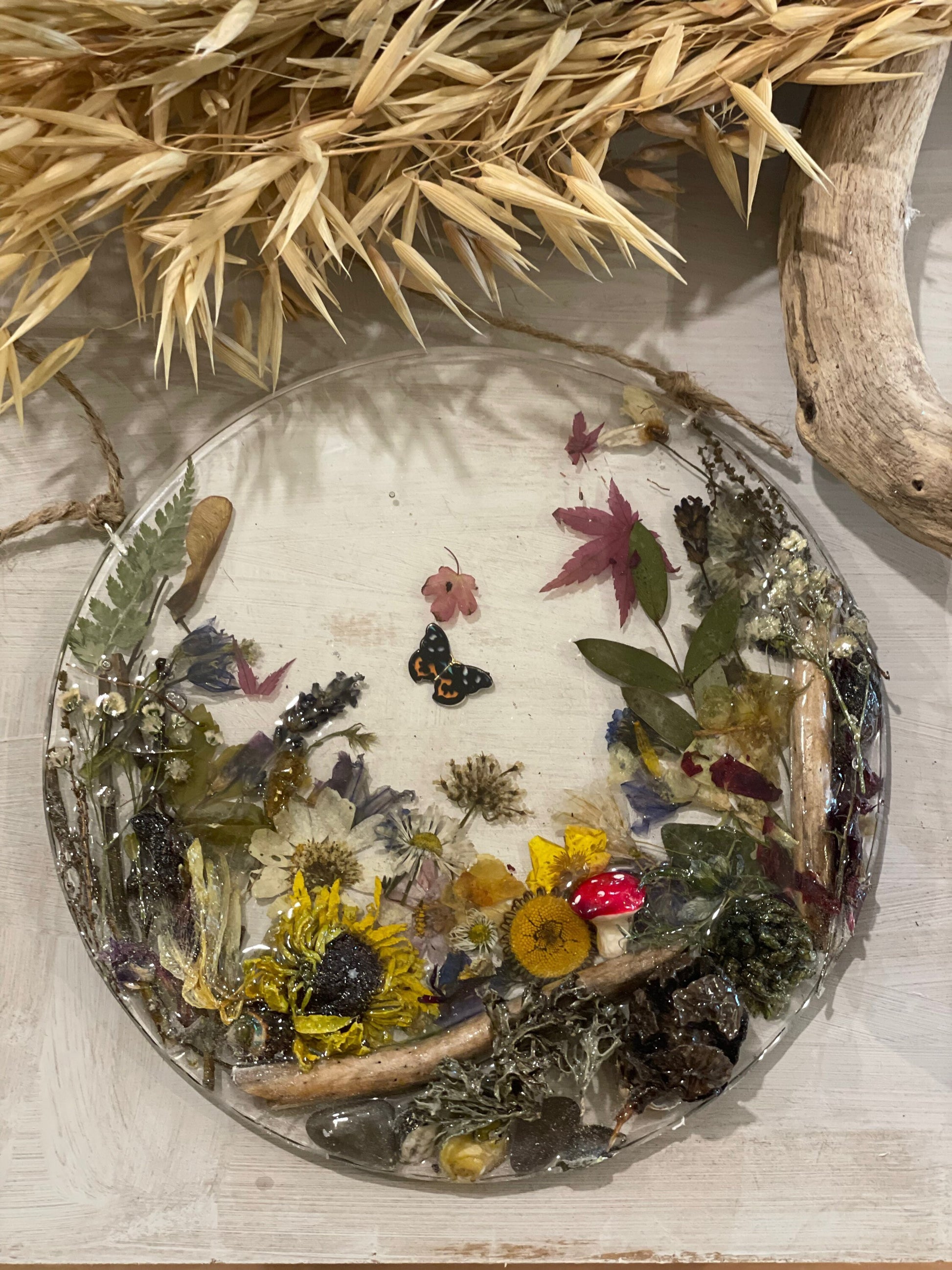 A beautiful woodland scene made from real flowers, leaves, shells and twigs, set in resin and hung on twine.
