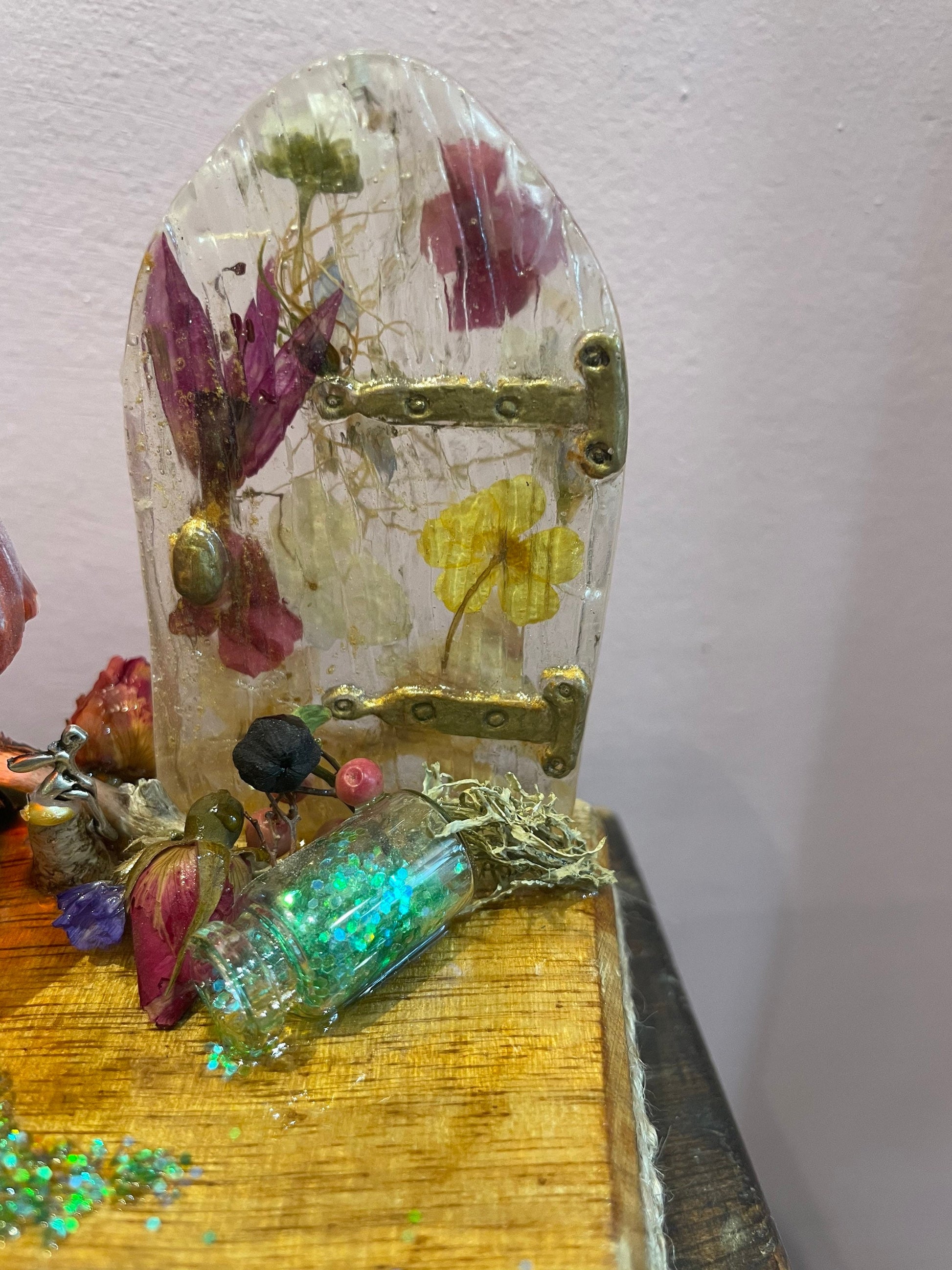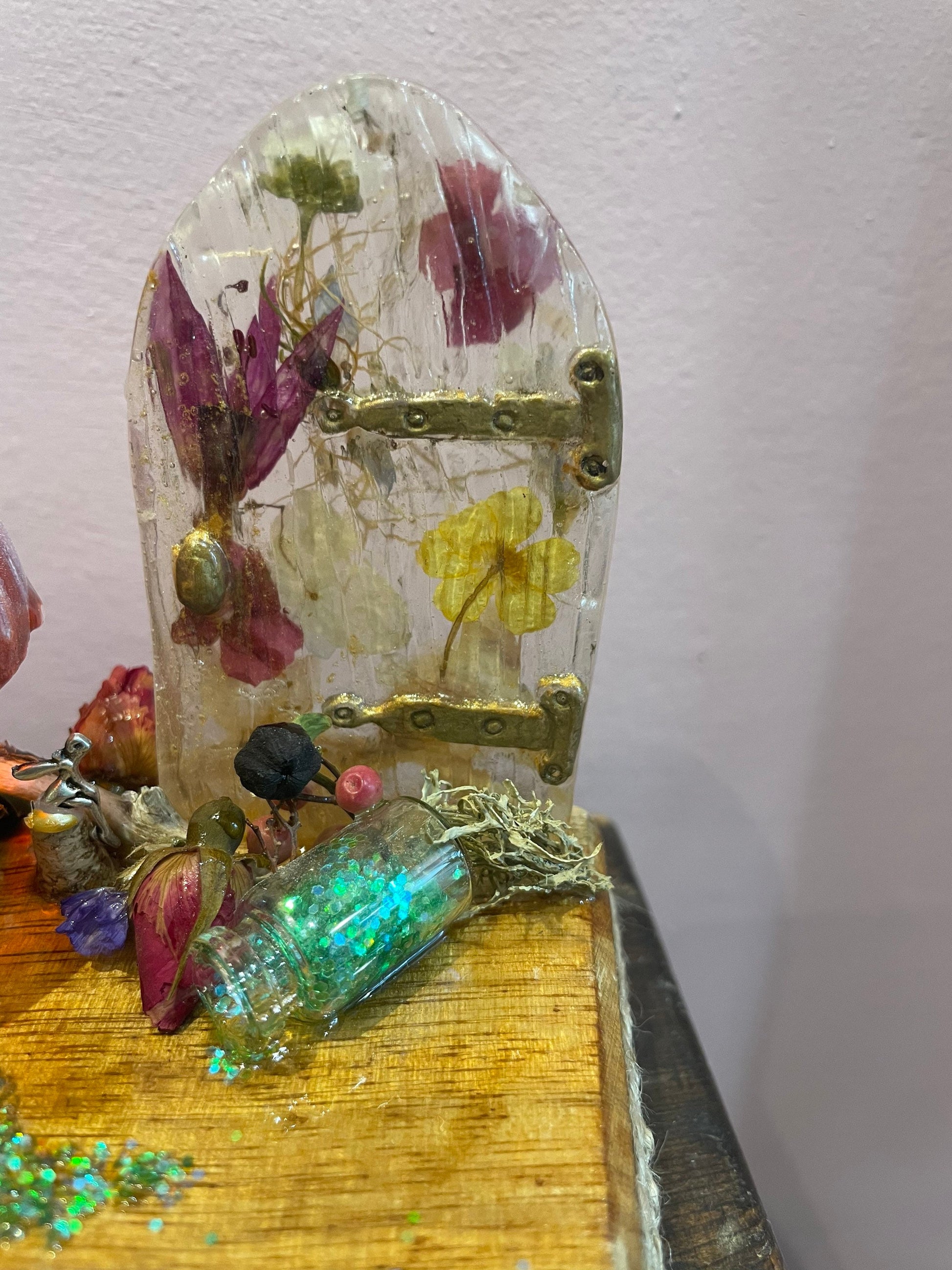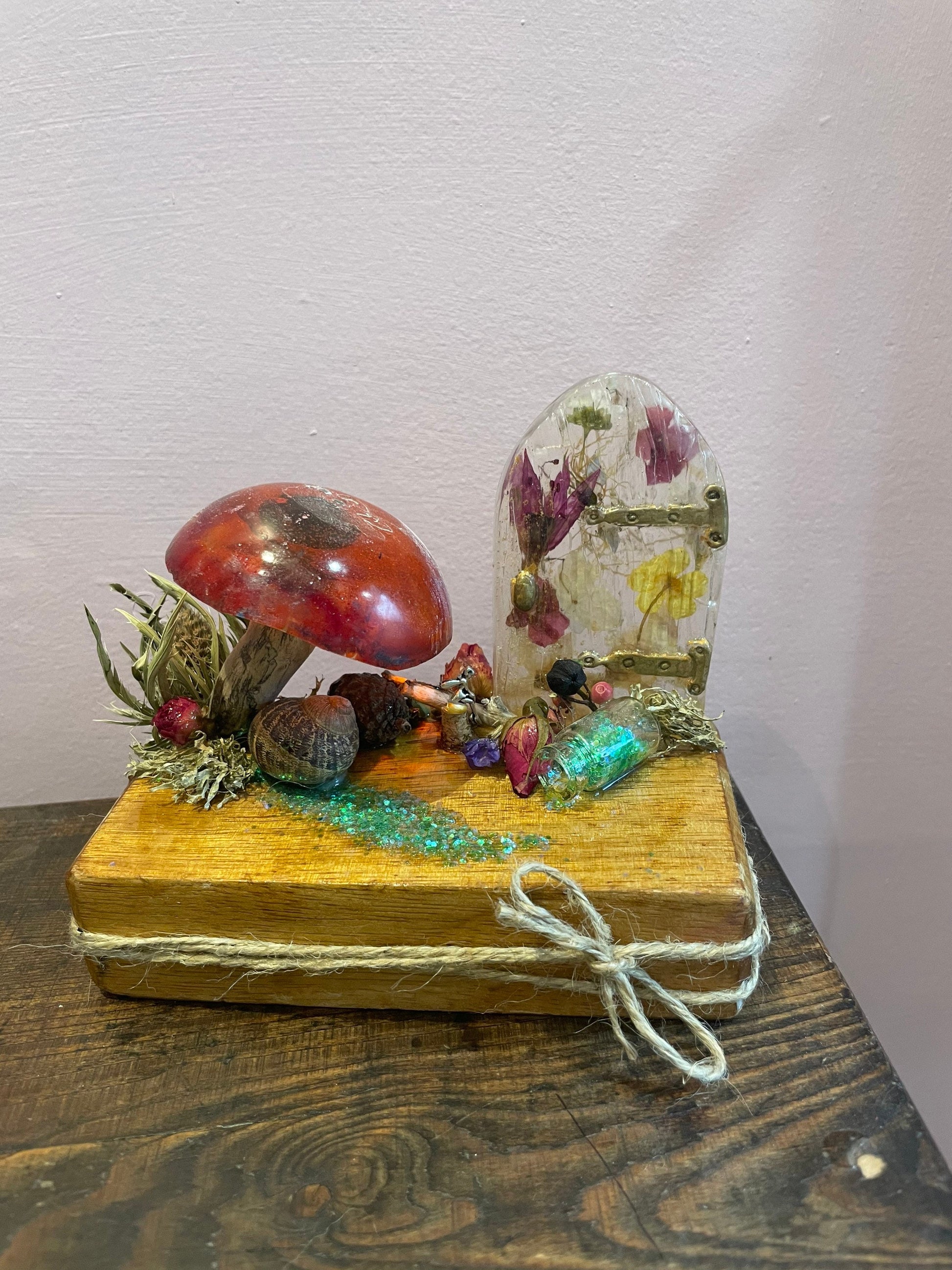 resin flower art with fairy door and resin toadstool,resin toadstool decor,fairy garden, gift for fairy lover, birthday, Mother’s Day gift,