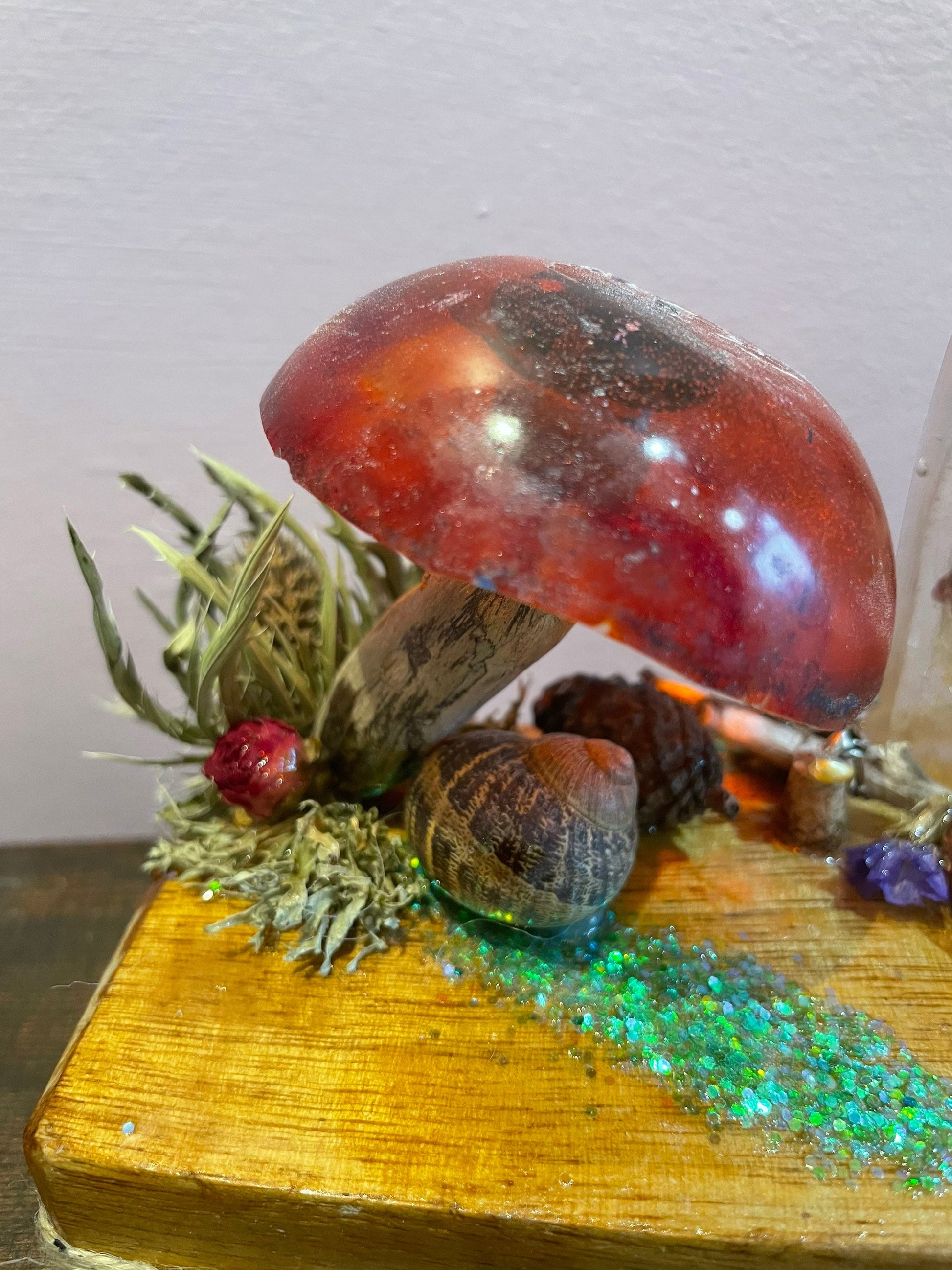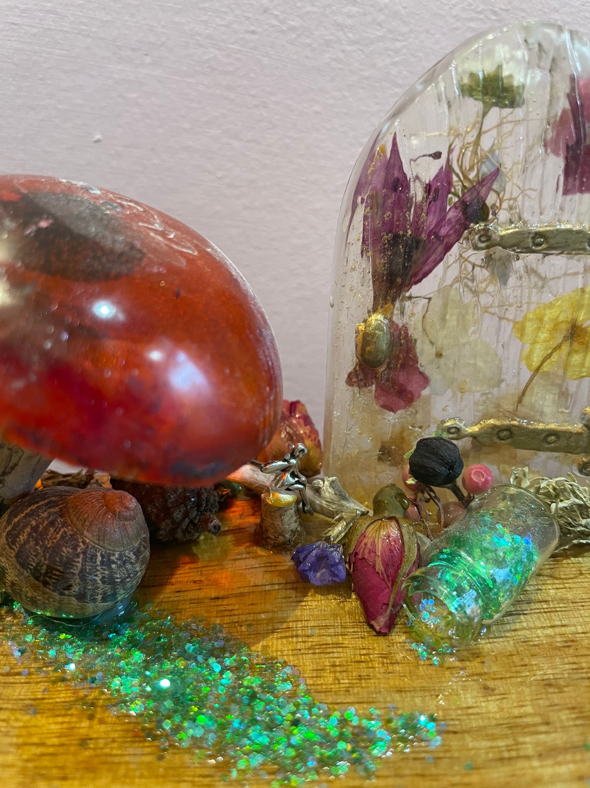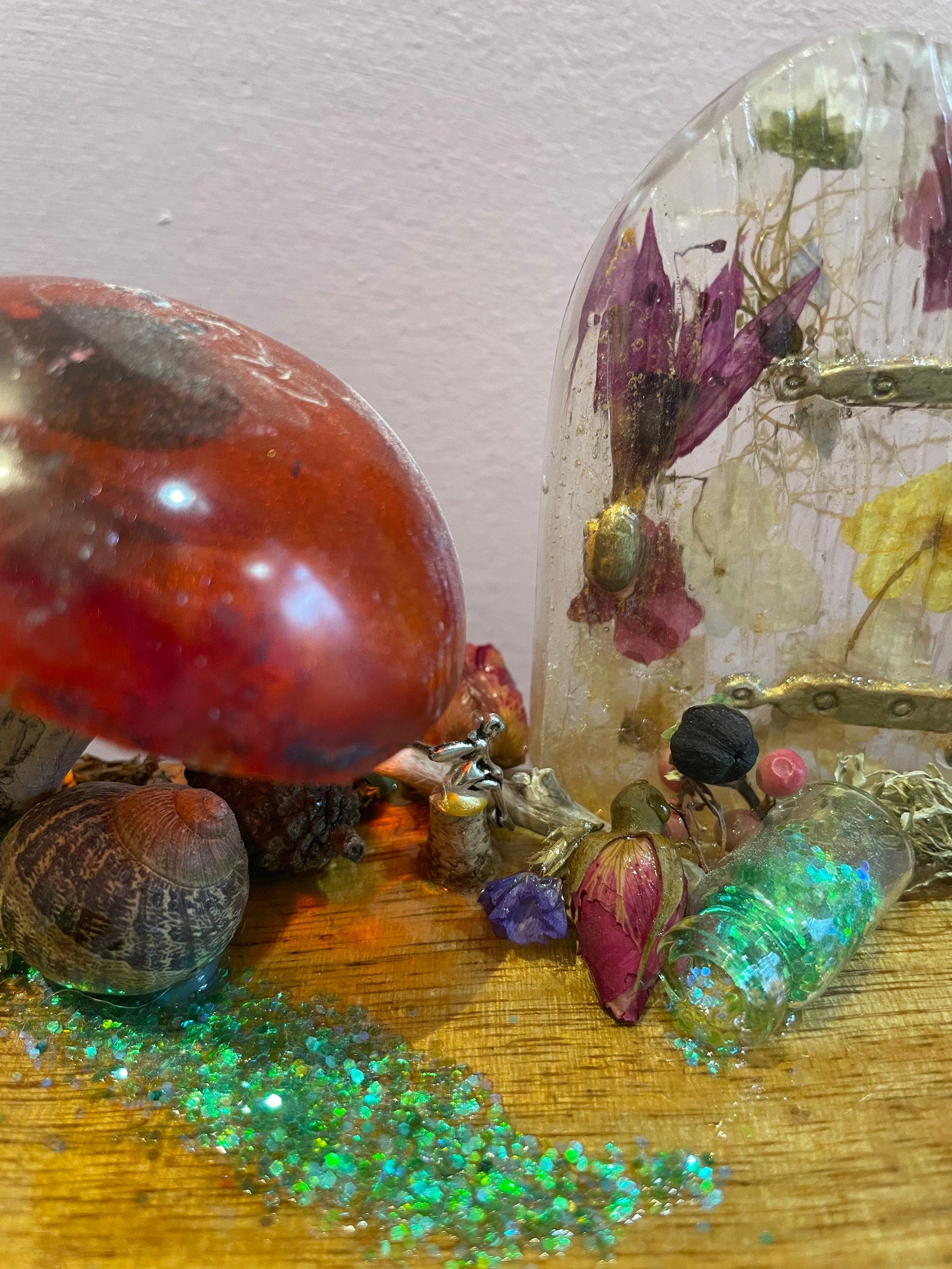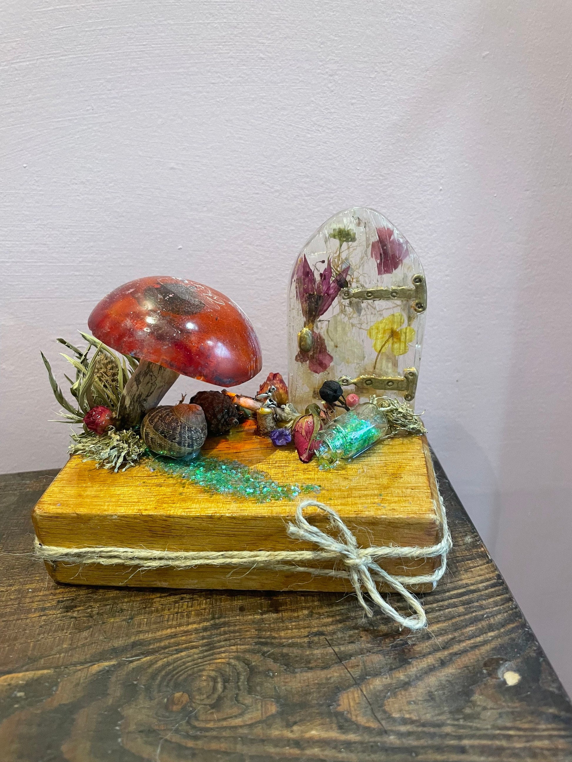 resin flower art with fairy door and resin toadstool,resin toadstool decor,fairy garden, gift for fairy lover, birthday, Mother’s Day gift,