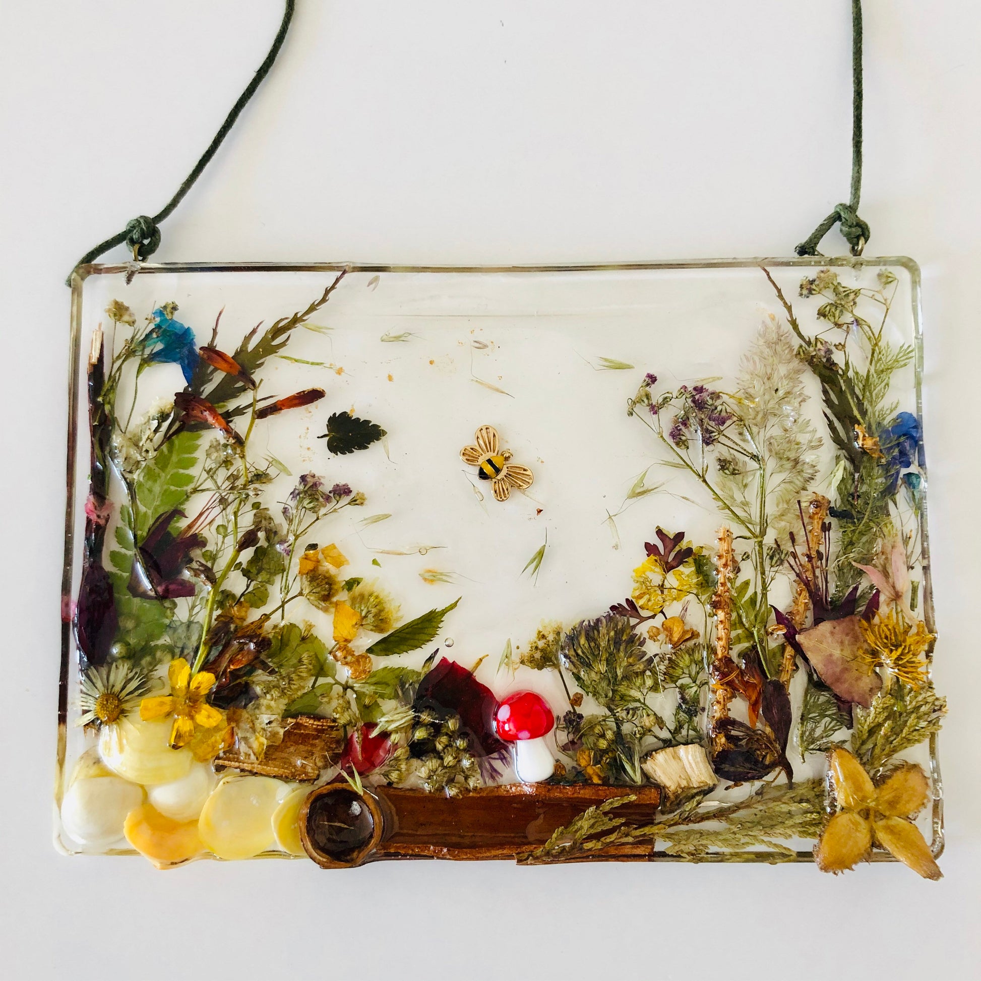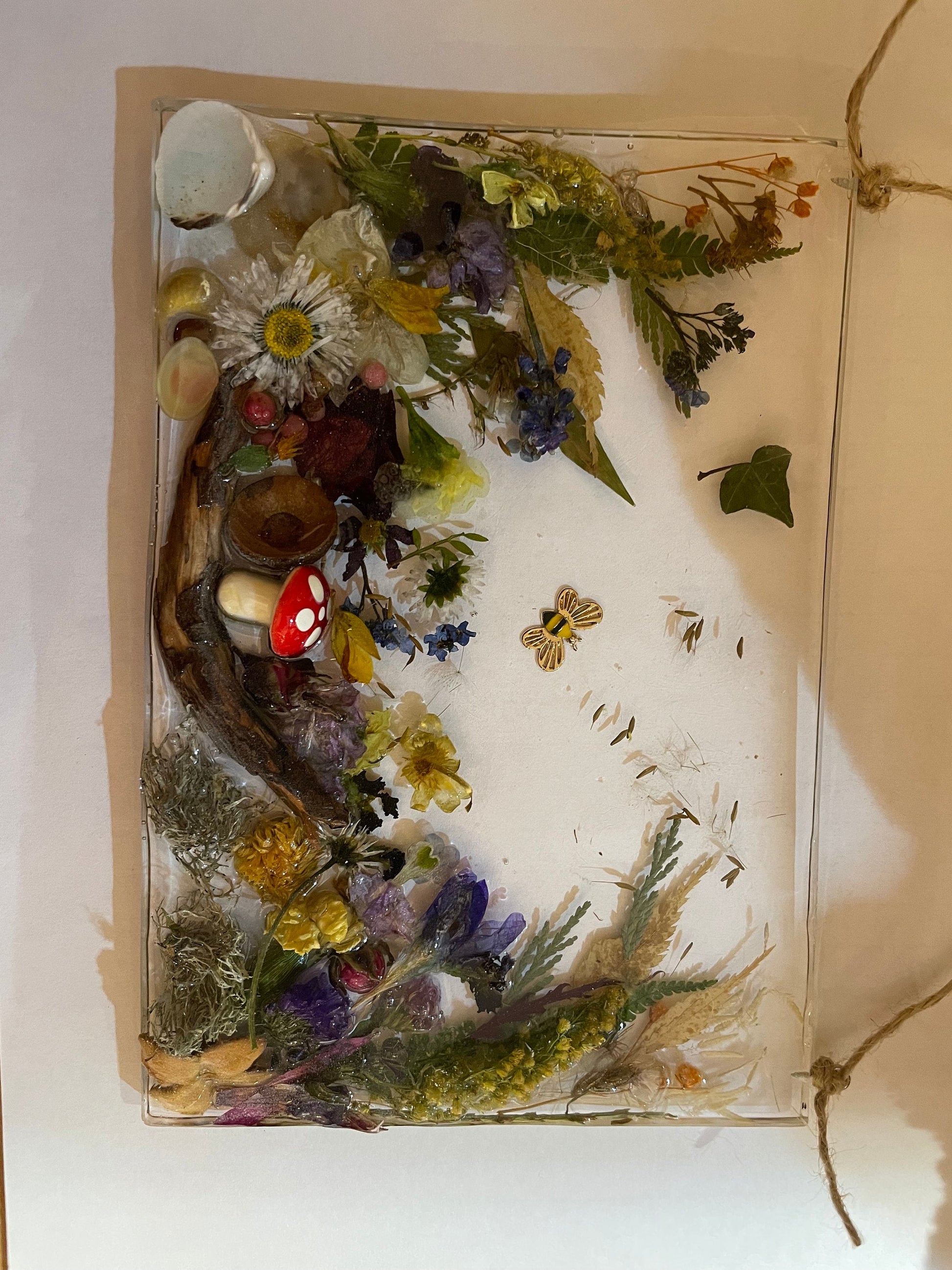 A unique and beautiful 3D woodland scene, made from real flowers, leaves, shells and twigs all set in crystal clear resin with dandelion wishes floating on the breeze. This piece is hung on twine brings a little piece of the outside into your home.