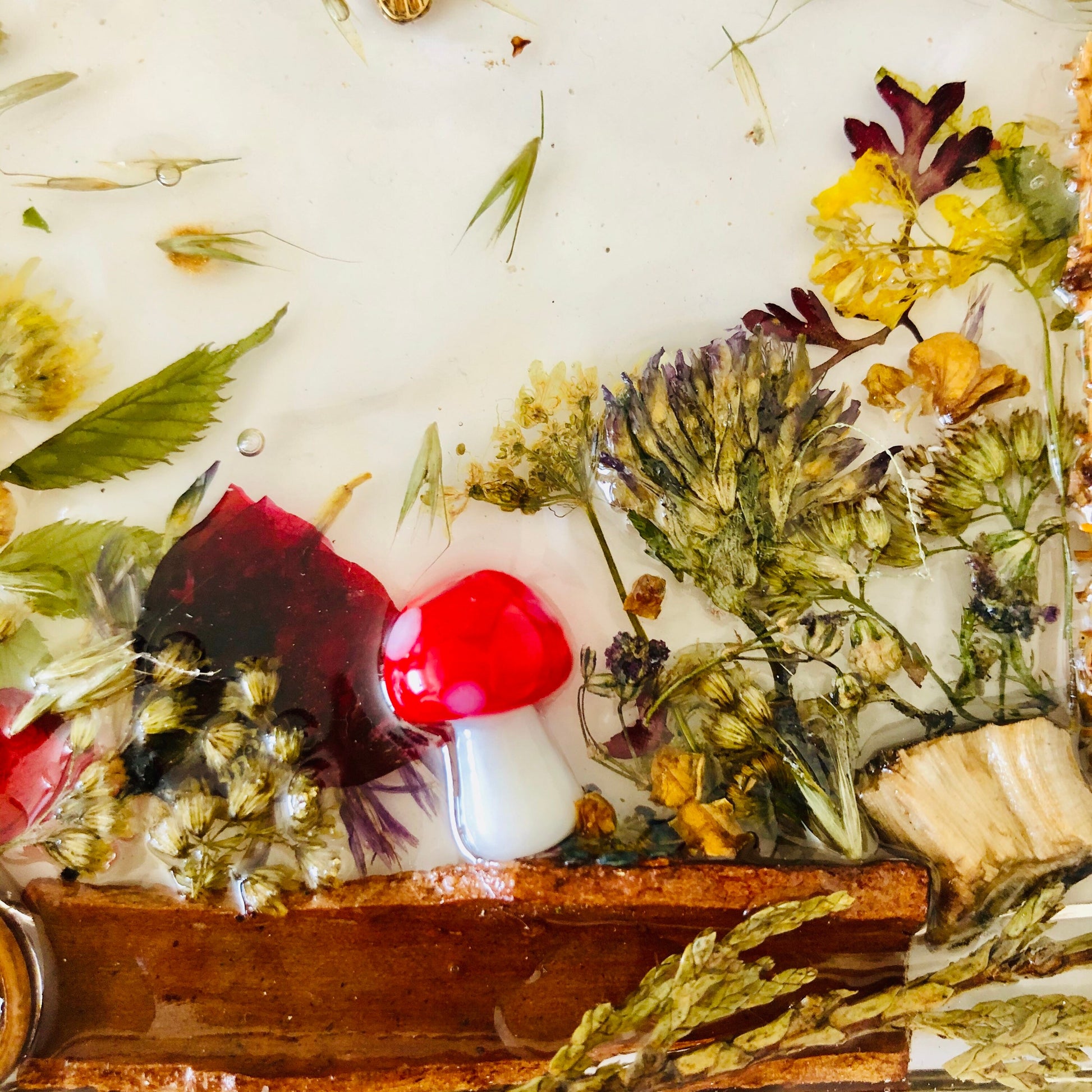 All of our items are unique and handmade with love and care using real pressed flower and foliage preserved in epoxy resin. We grow as many of our own flowers as we can, but occasionally we do have to outsource to meet demands.