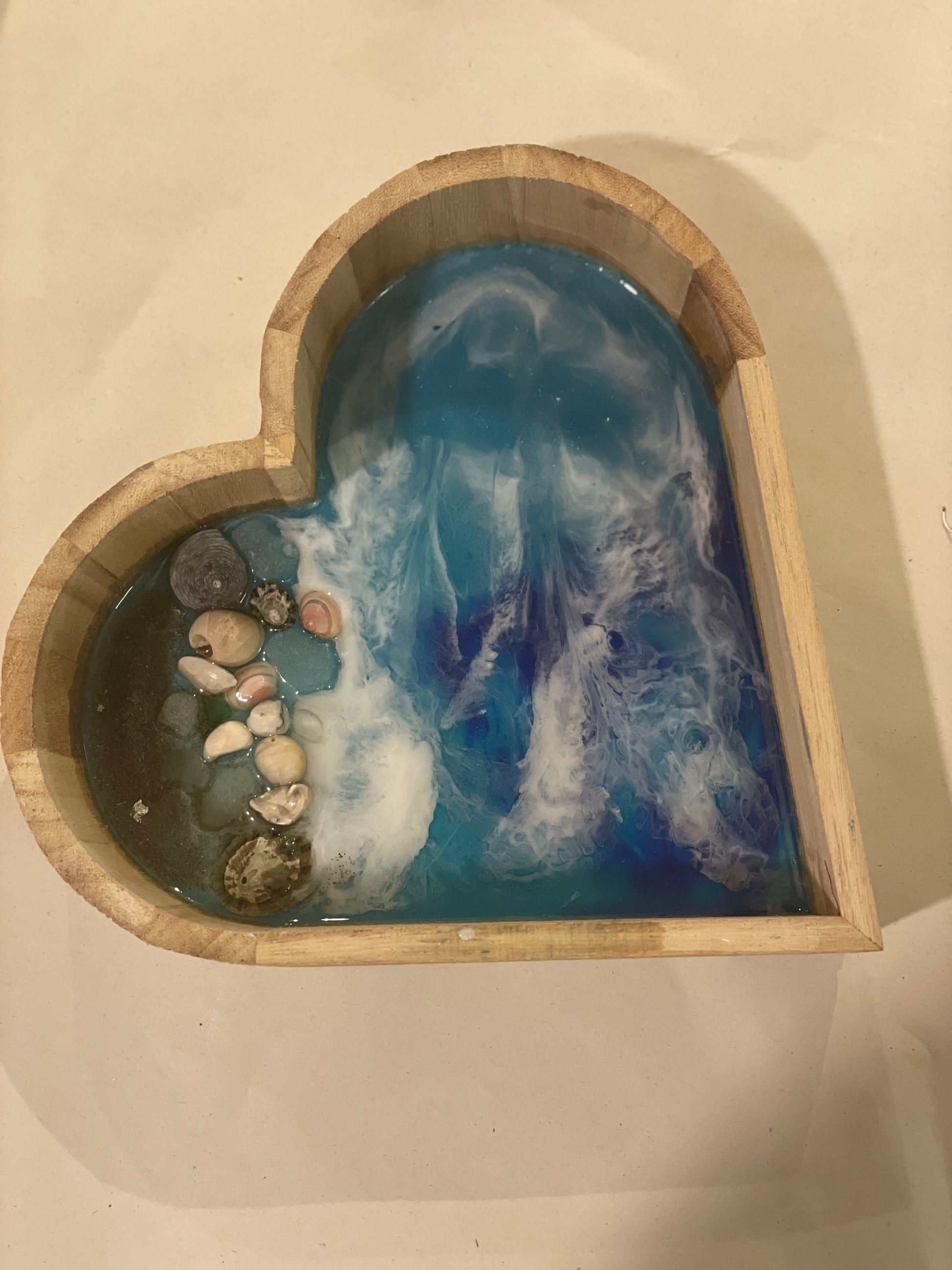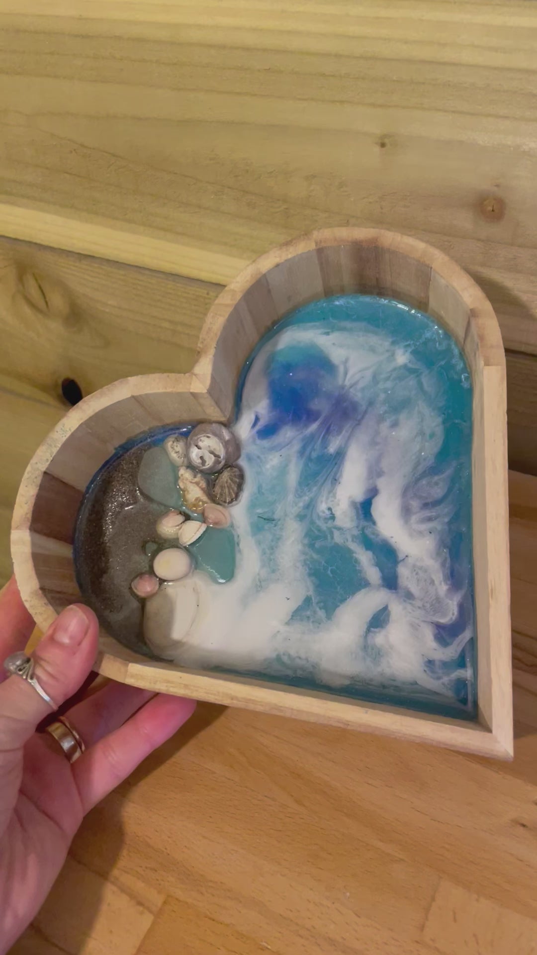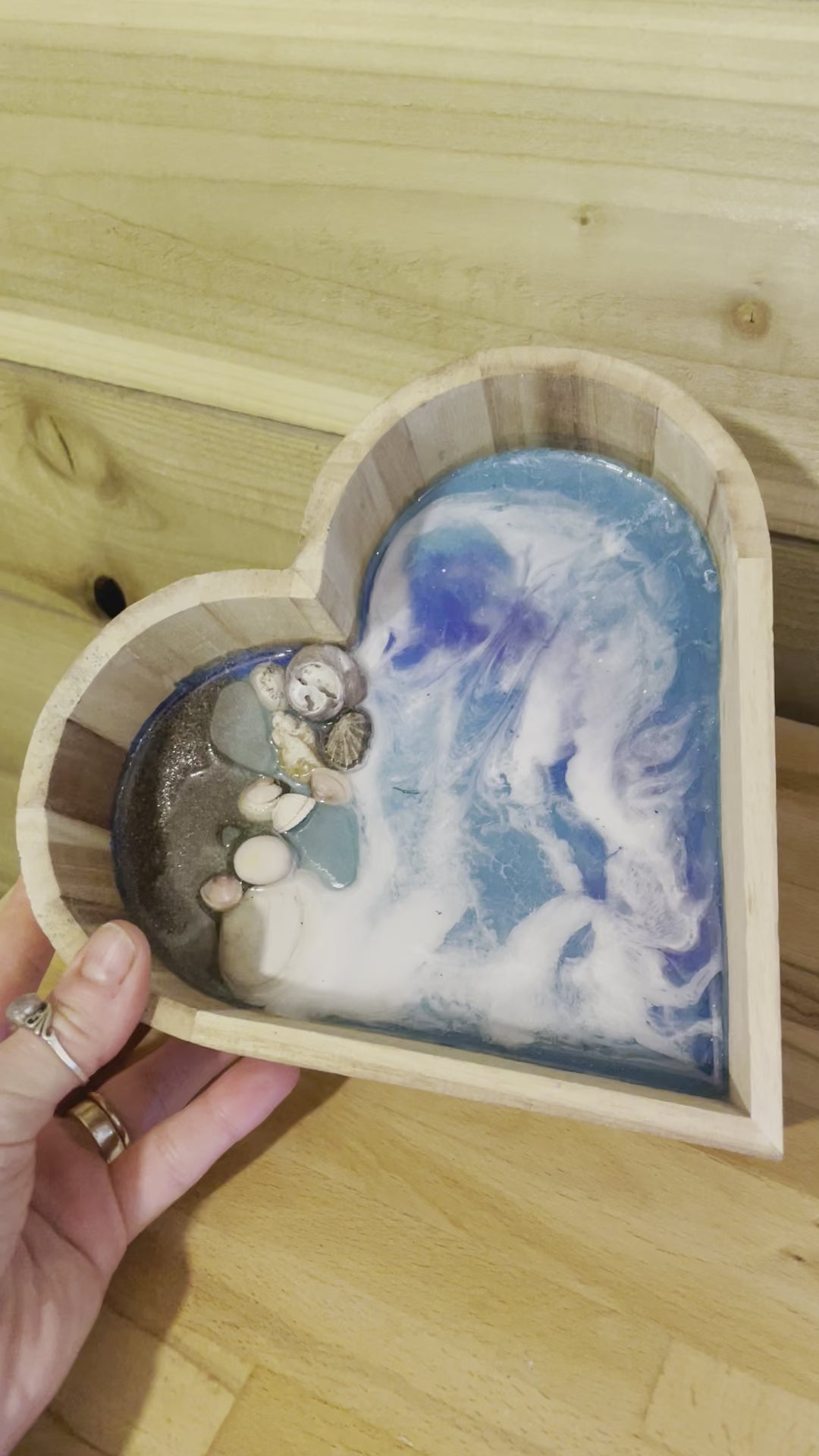 Wooden heart shaped trinket dish with resin waves and real shells, beach lovers gift for home, ocean decor, rustic seaside wooden tray,