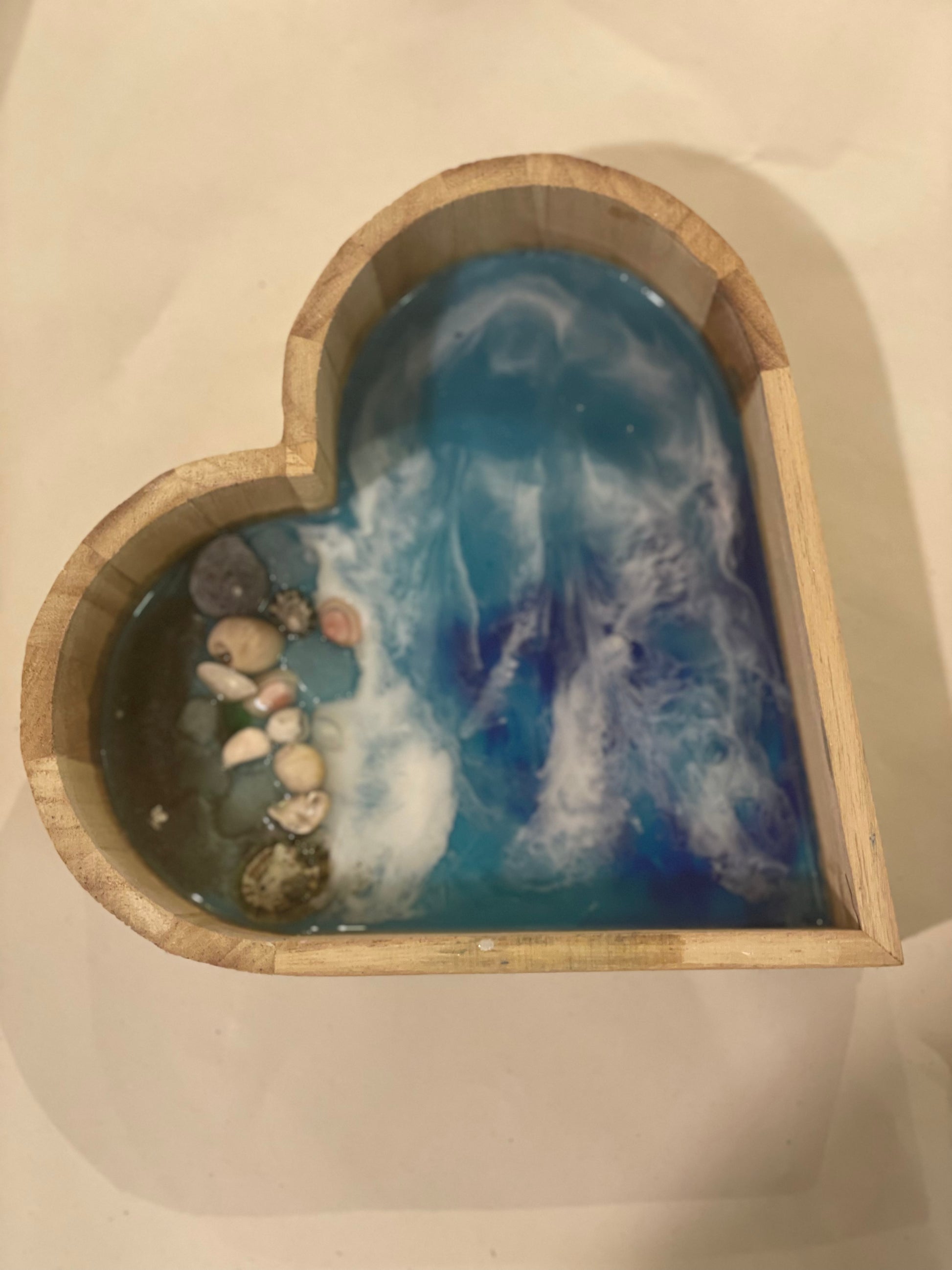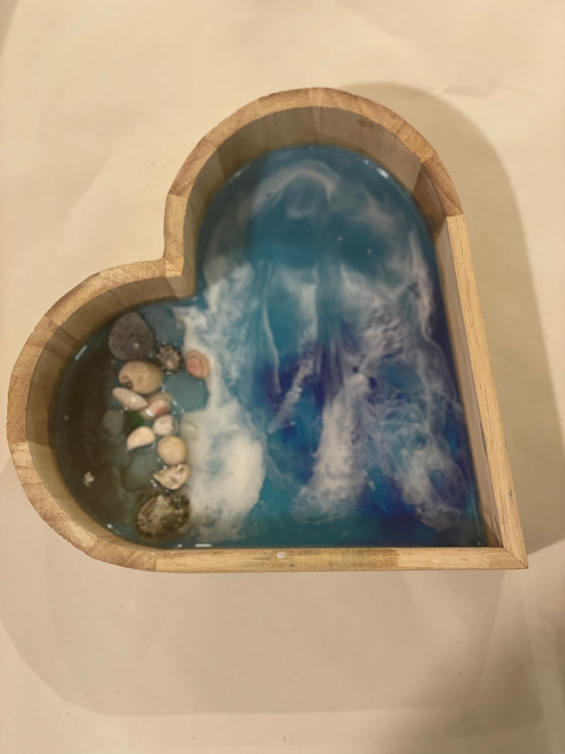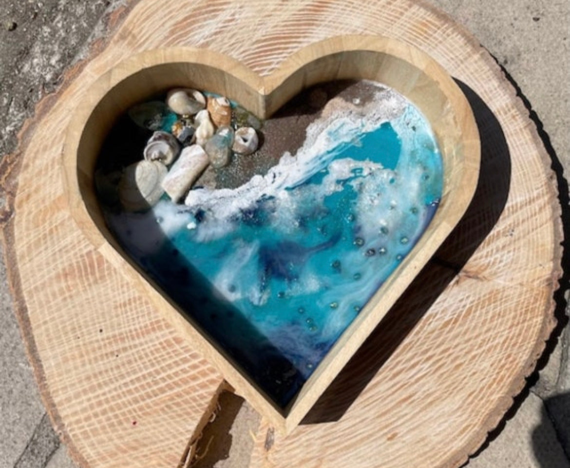 Wooden heart shaped trinket dish with resin waves and real shells, beach lovers gift for home, ocean decor, rustic seaside wooden tray,