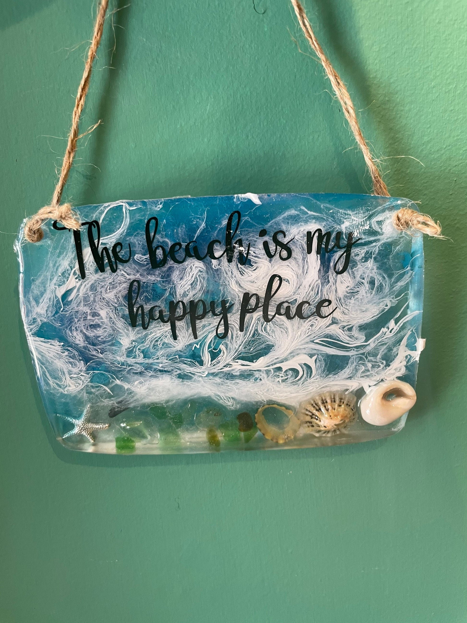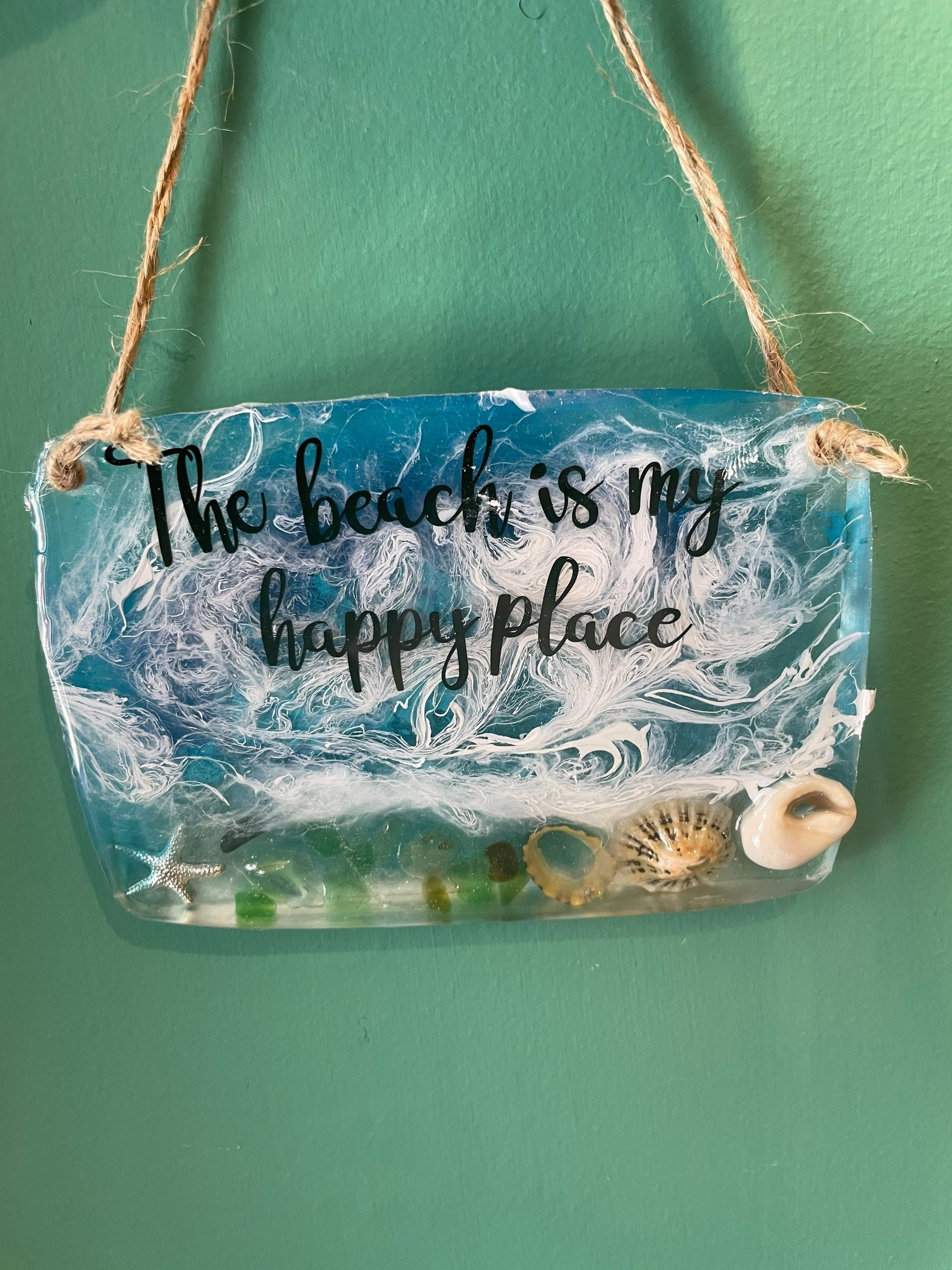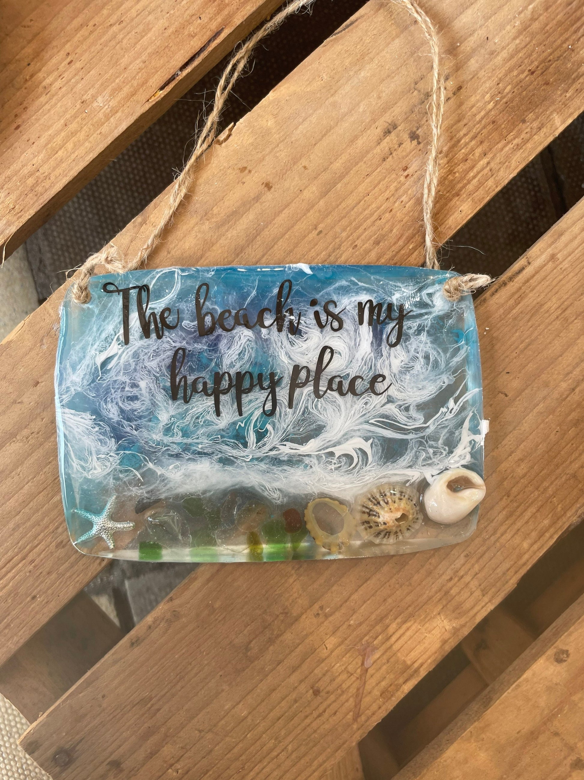 It comes ready to hang with ‘The beach is my happy place’ motto set into the resin.
