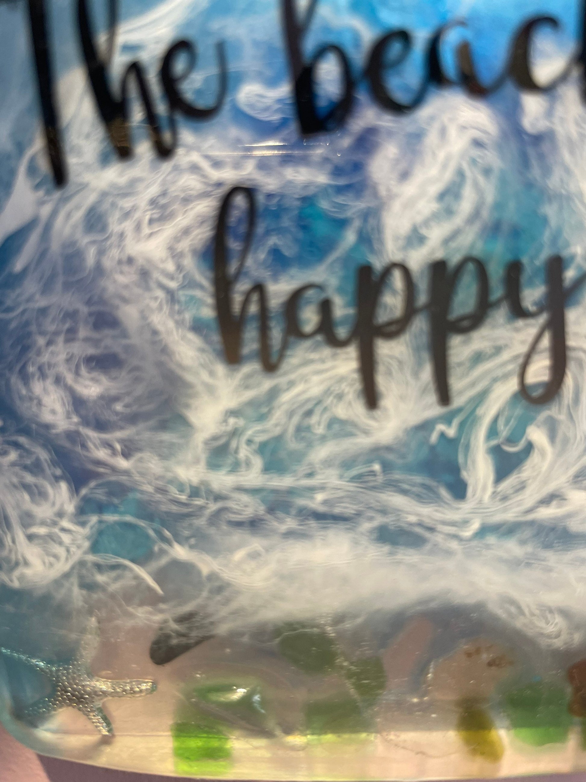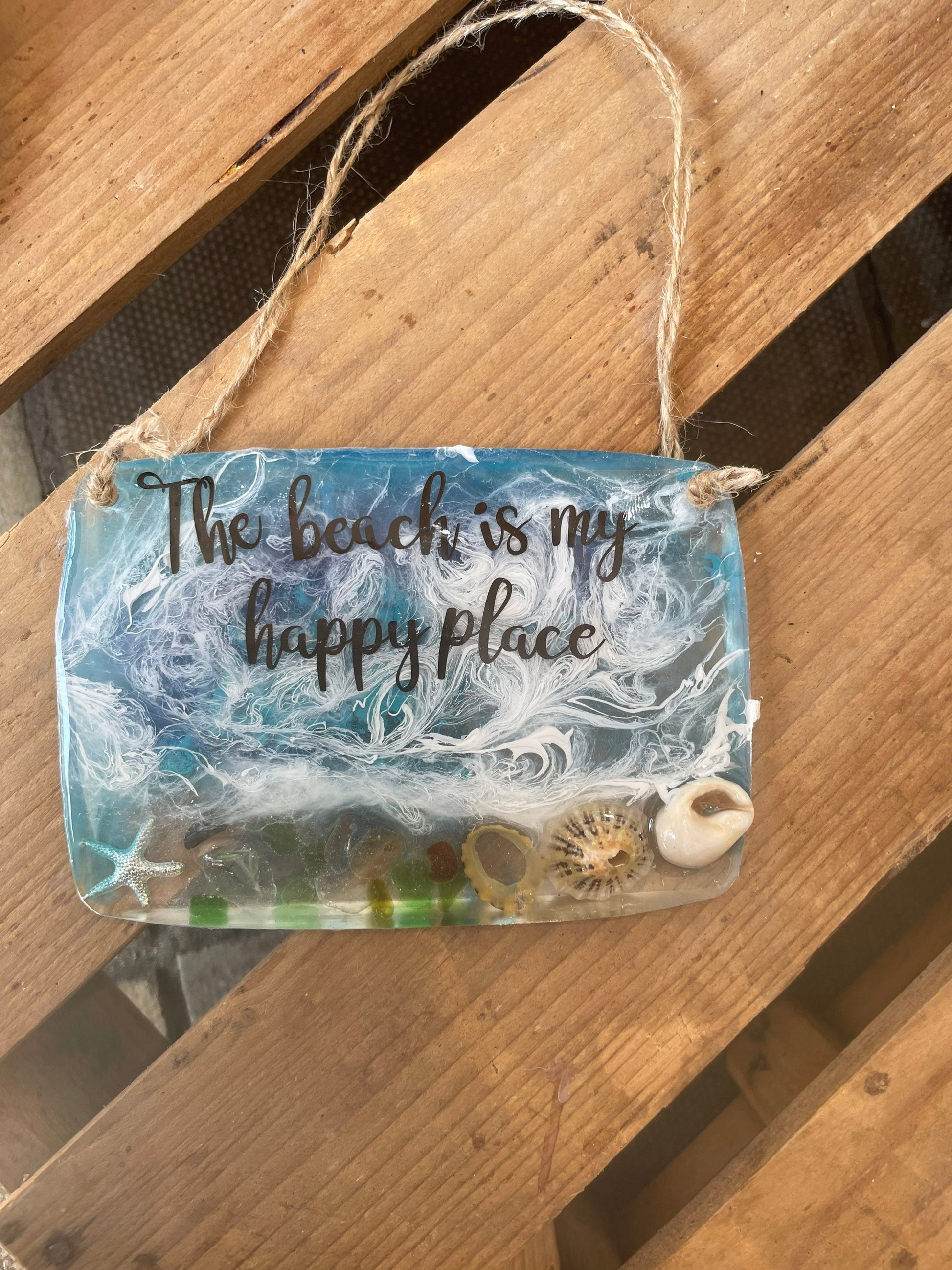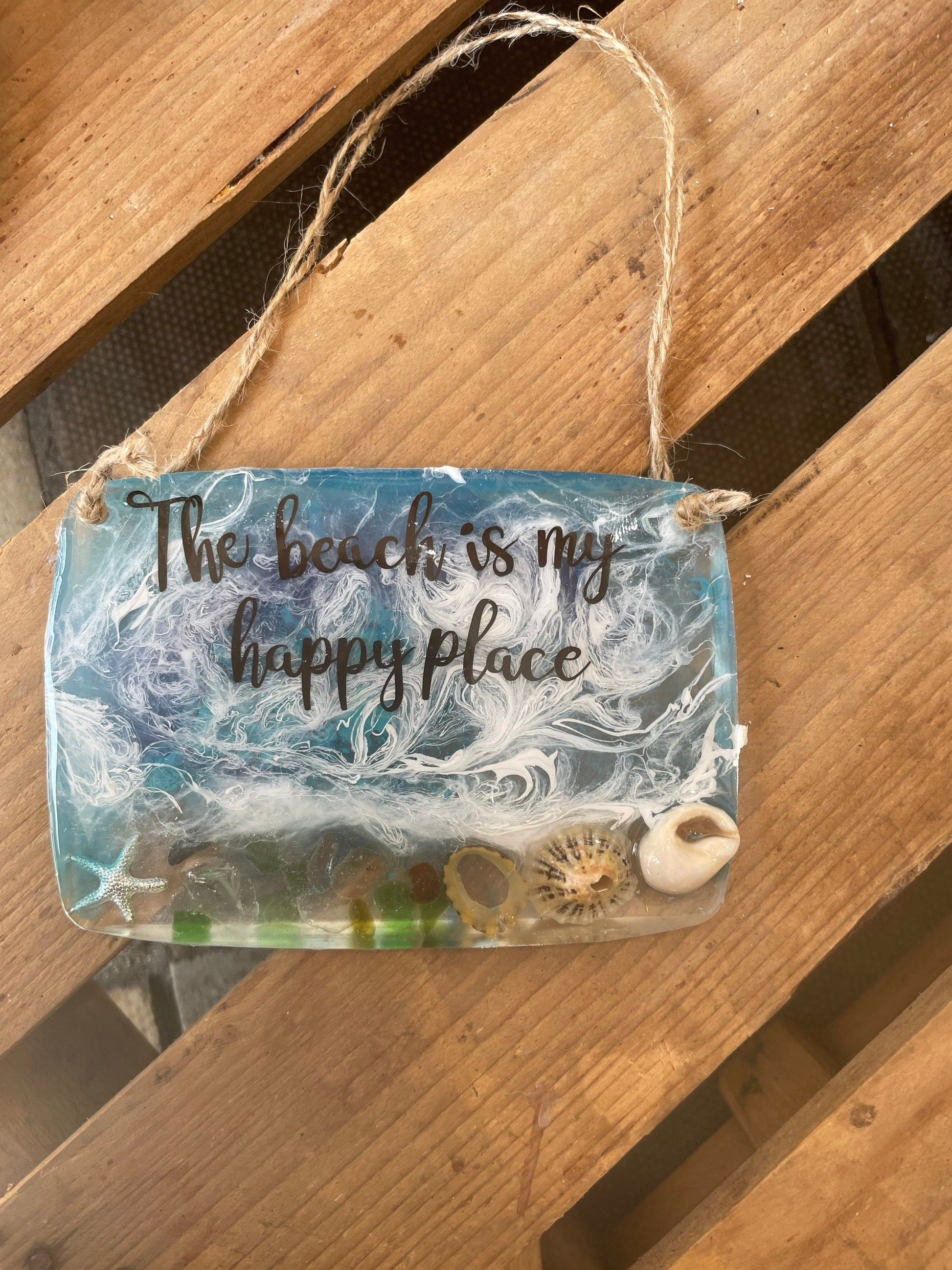 It comes ready to hang with ‘The beach is my happy place’ motto set into the resin.