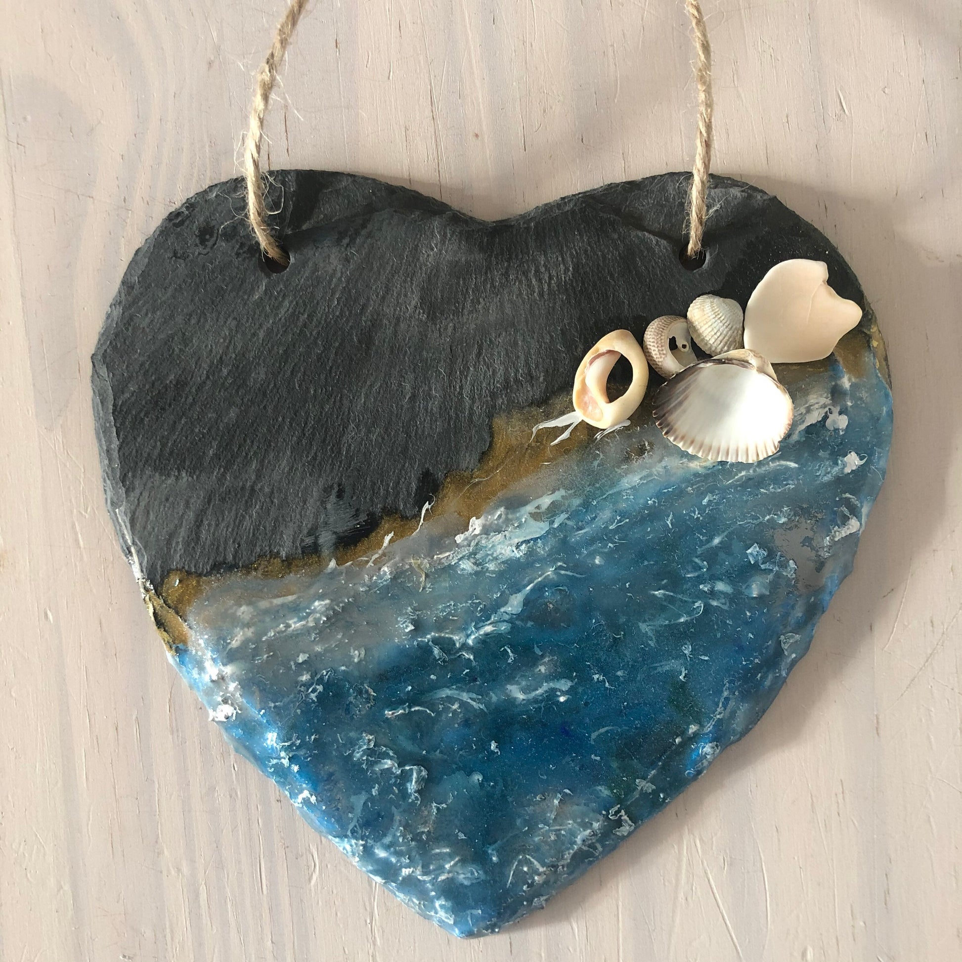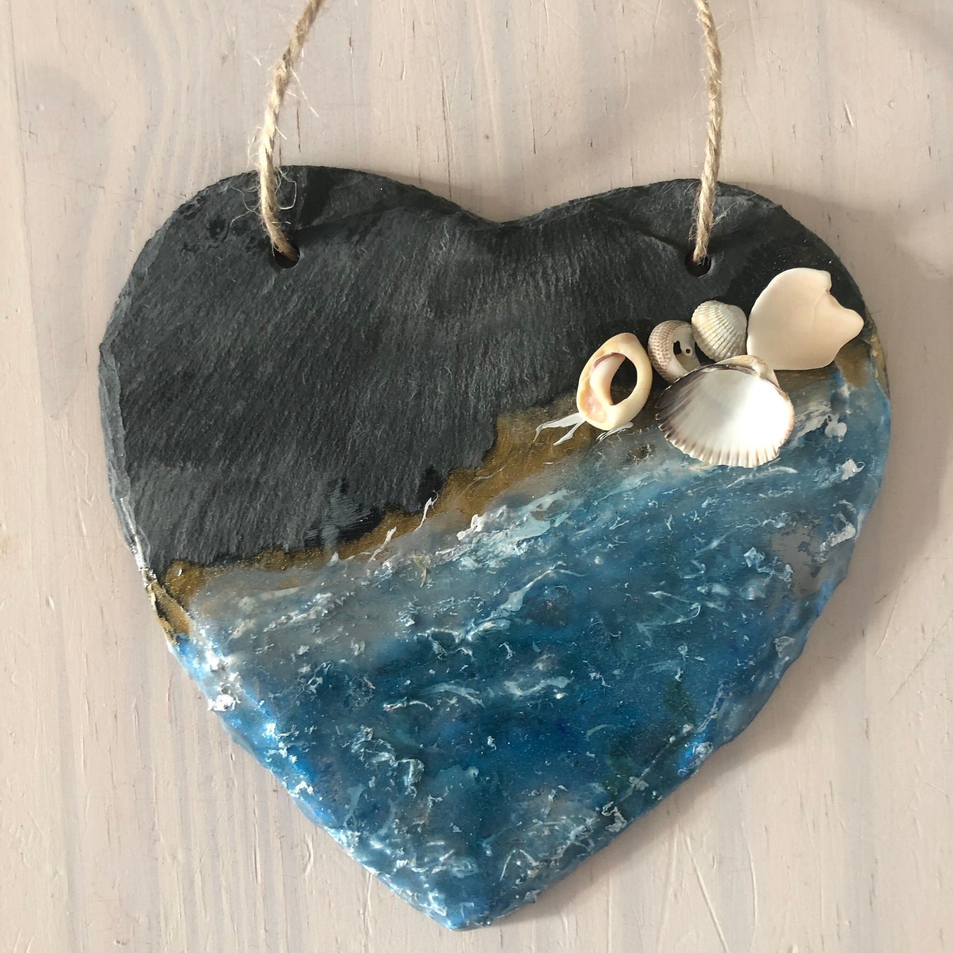 Beautiful real shells sit amongst the waves on this unique slate heart decoration