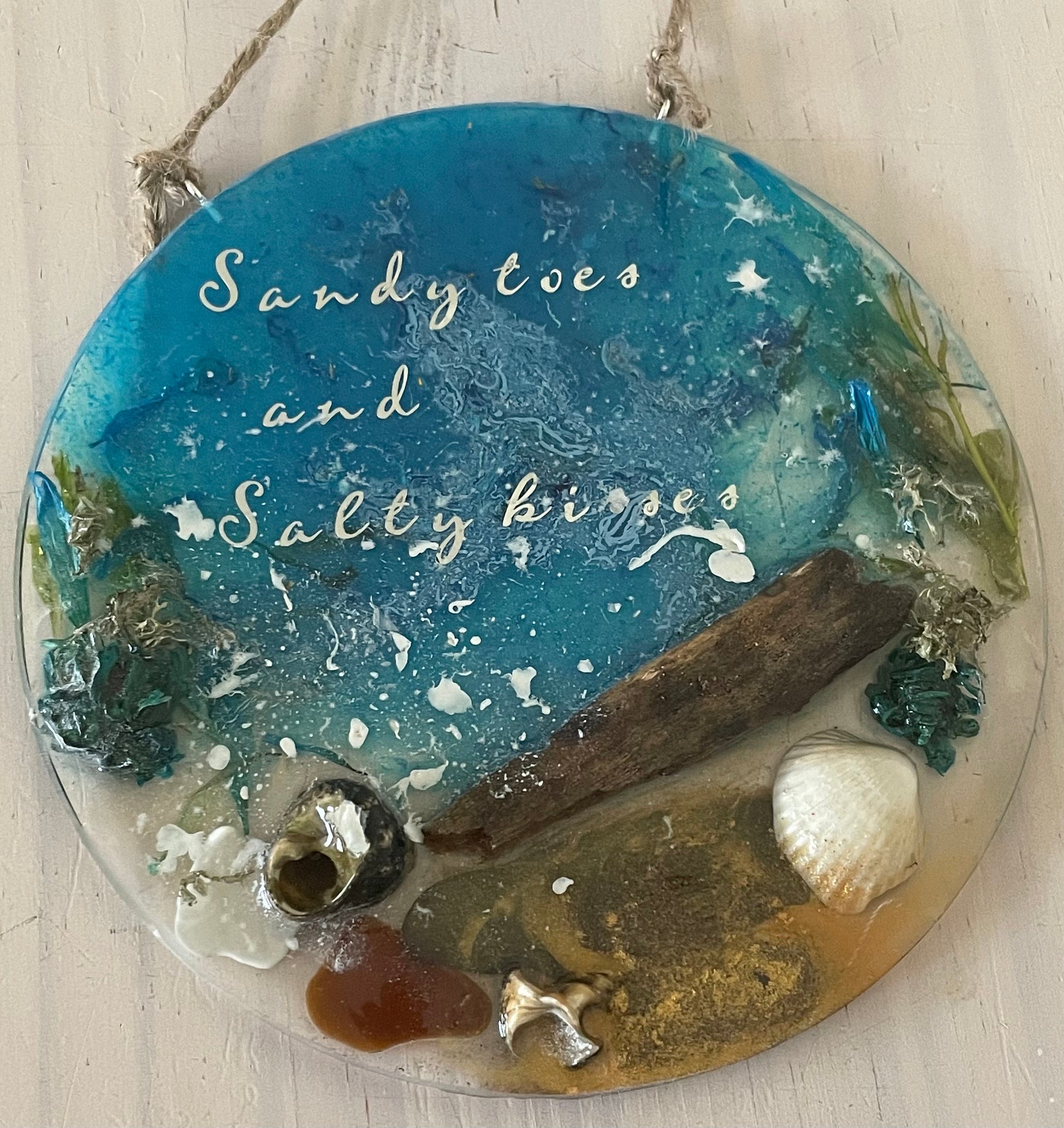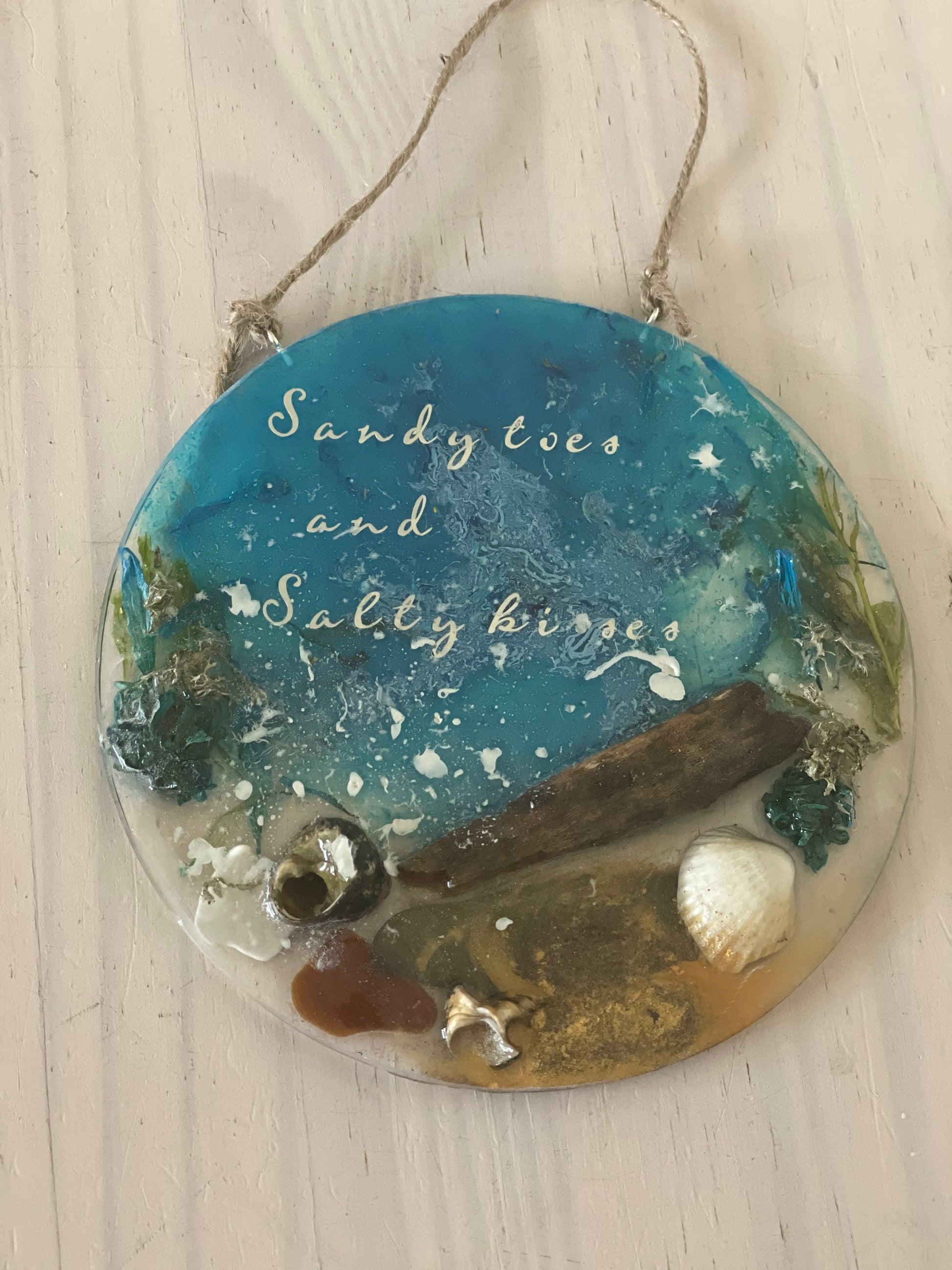 This gorgeous 15 cm resin disc is full of real shells and sand with a ‘Sandy toes and salty kisses’ quote set into it .
