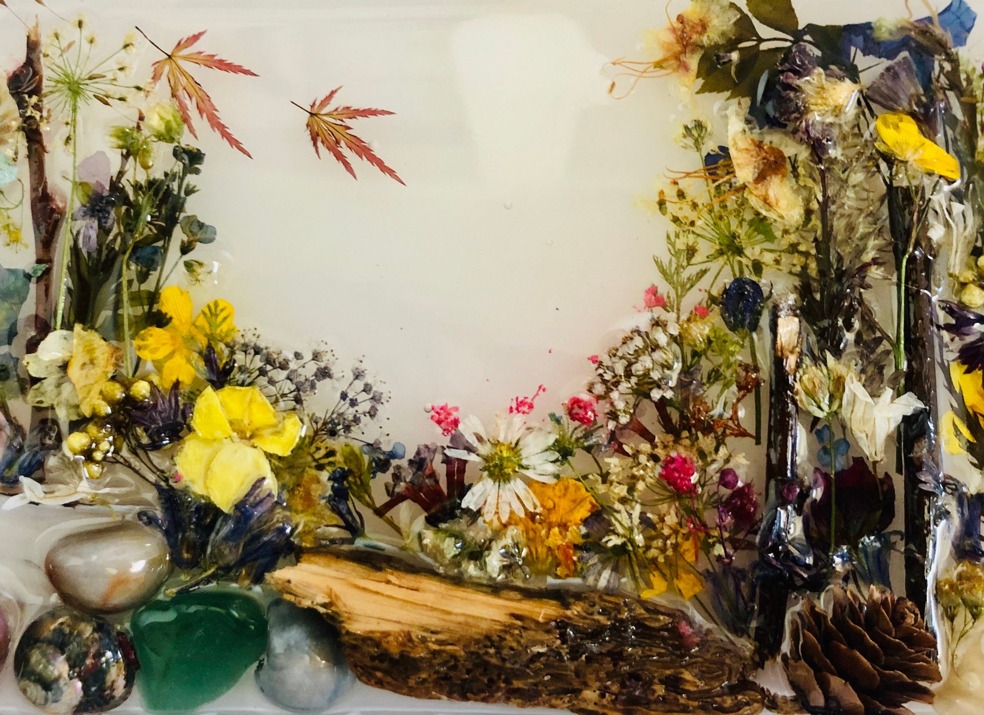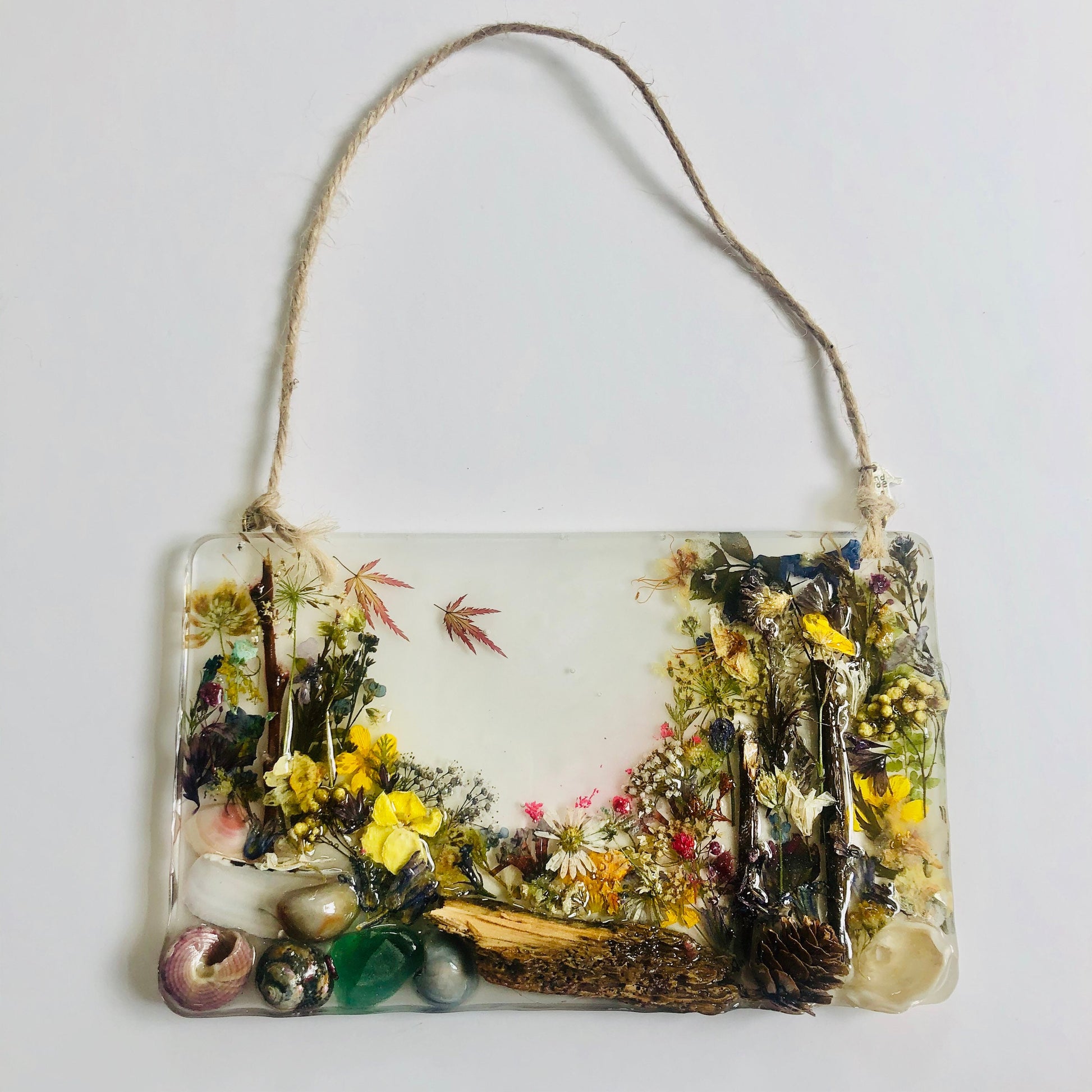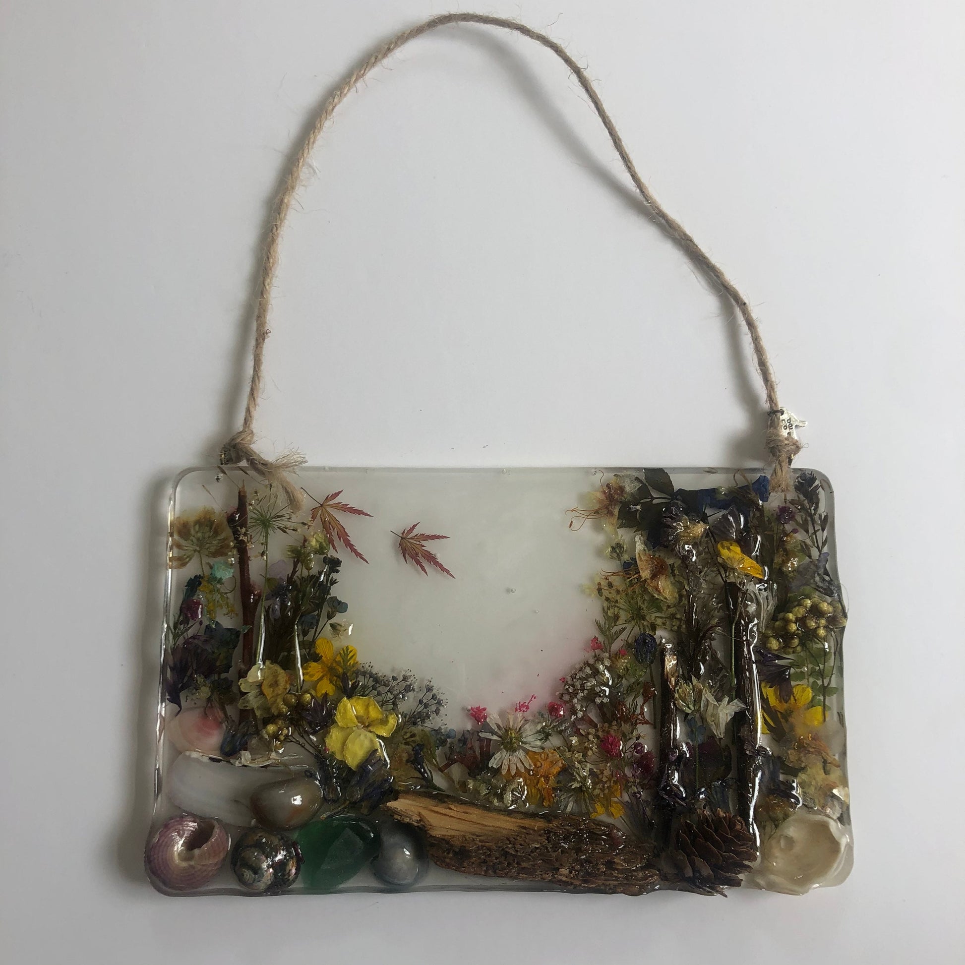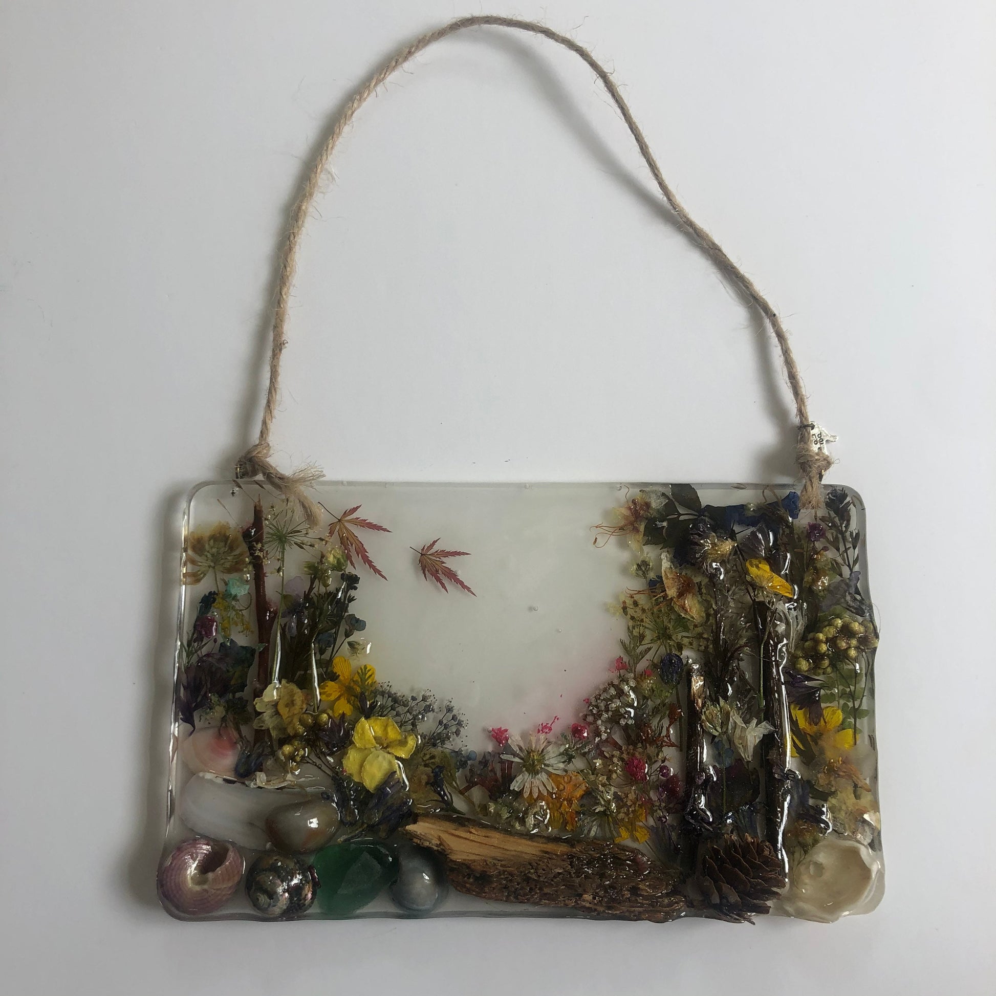 A beautiful woodland scene made from real flowers, leaves, seashells and twigs, set in resin and hung on twine.