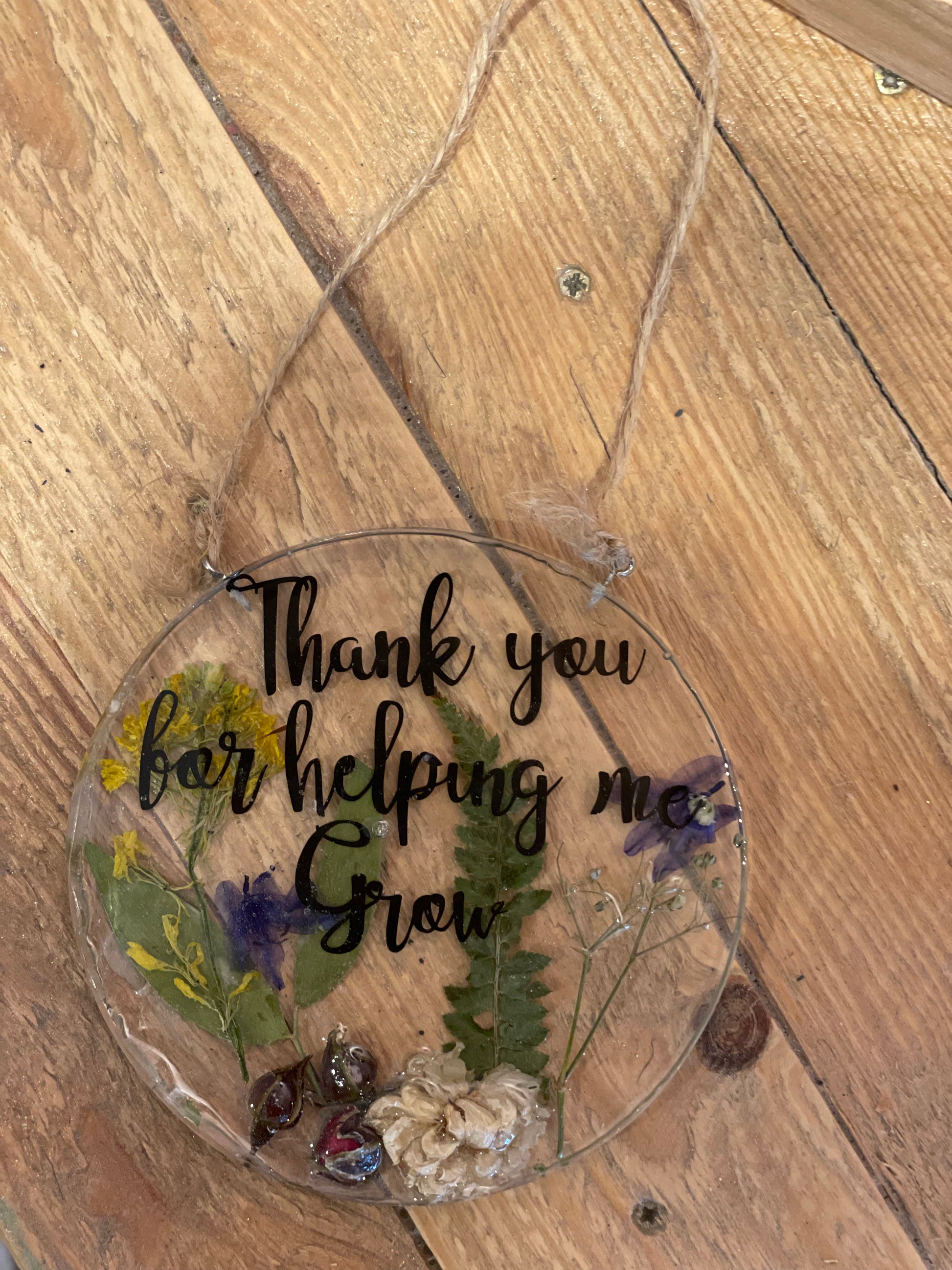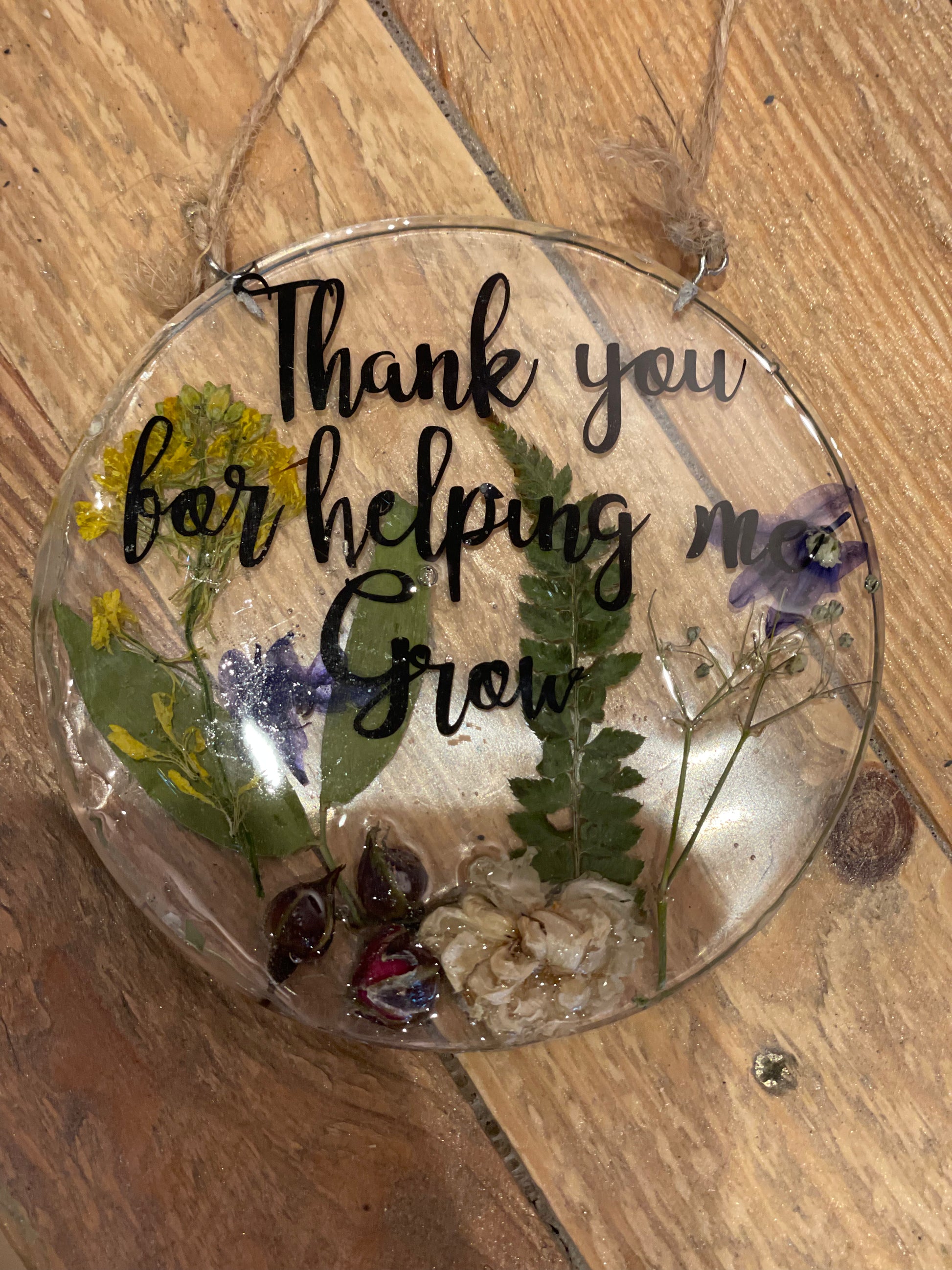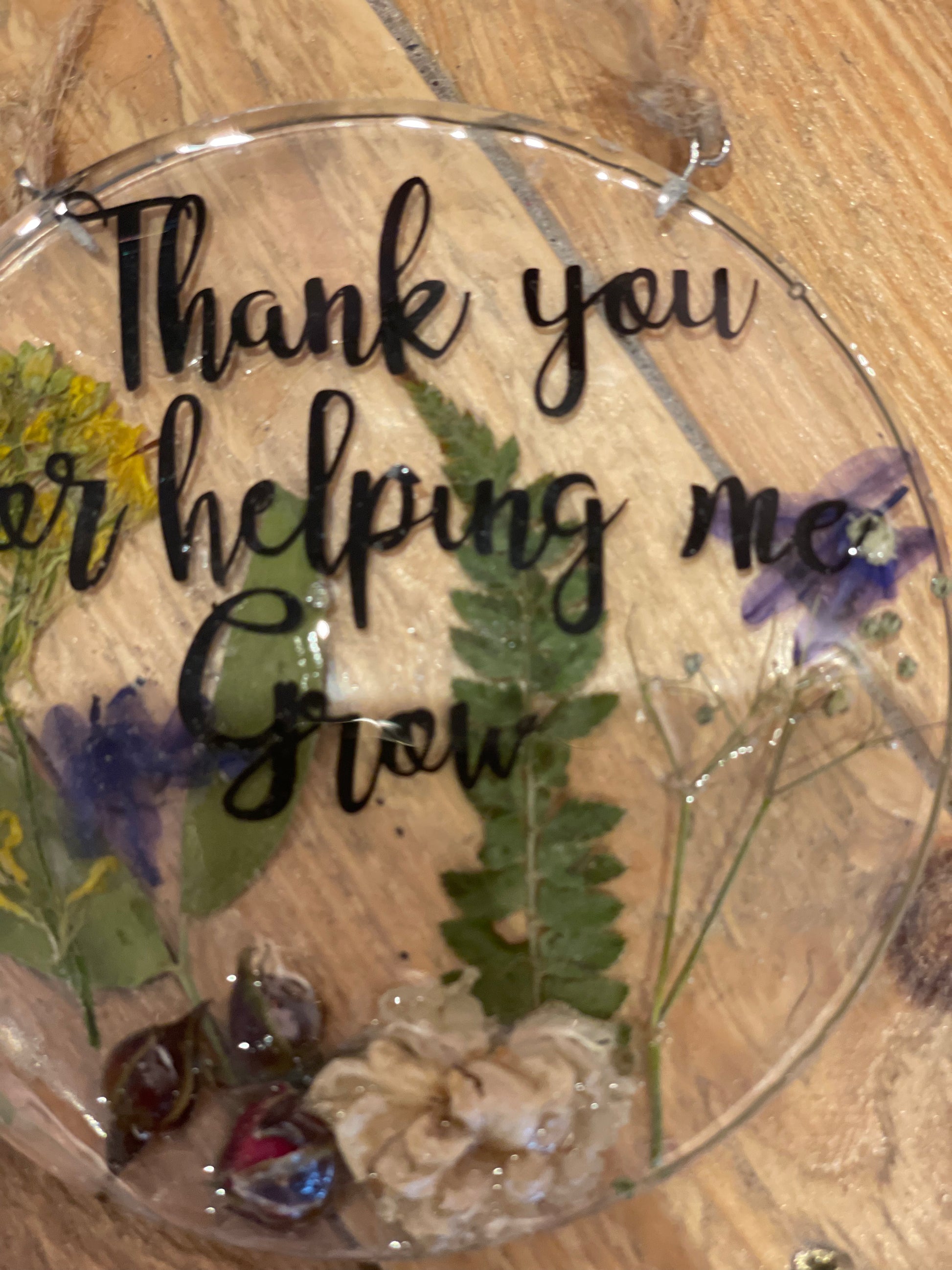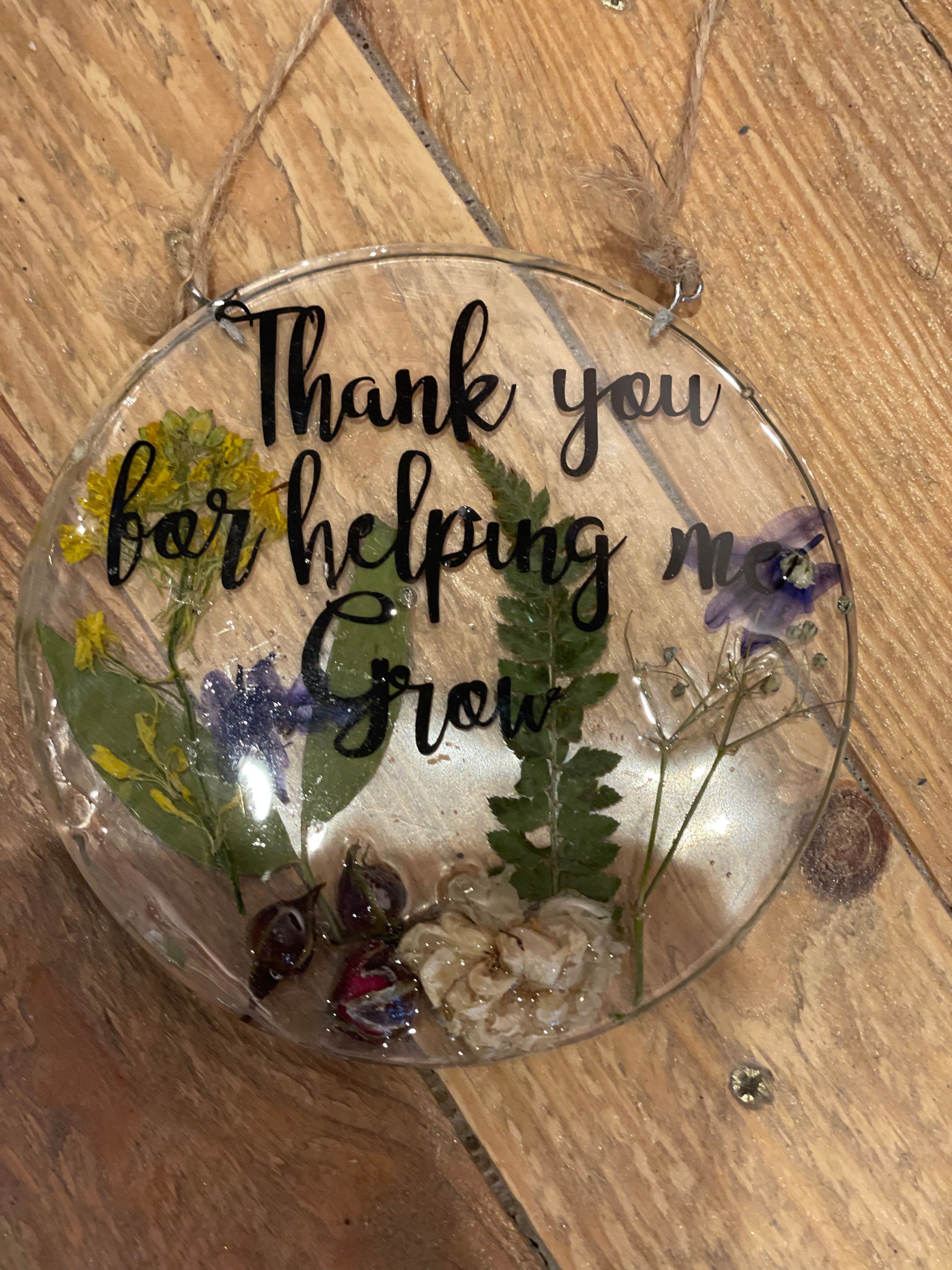 A beautiful flower scene with a ‘thank you for helping me to grow’ message set in it. Made from real flowers and leaves , set in resin and hung on twine.