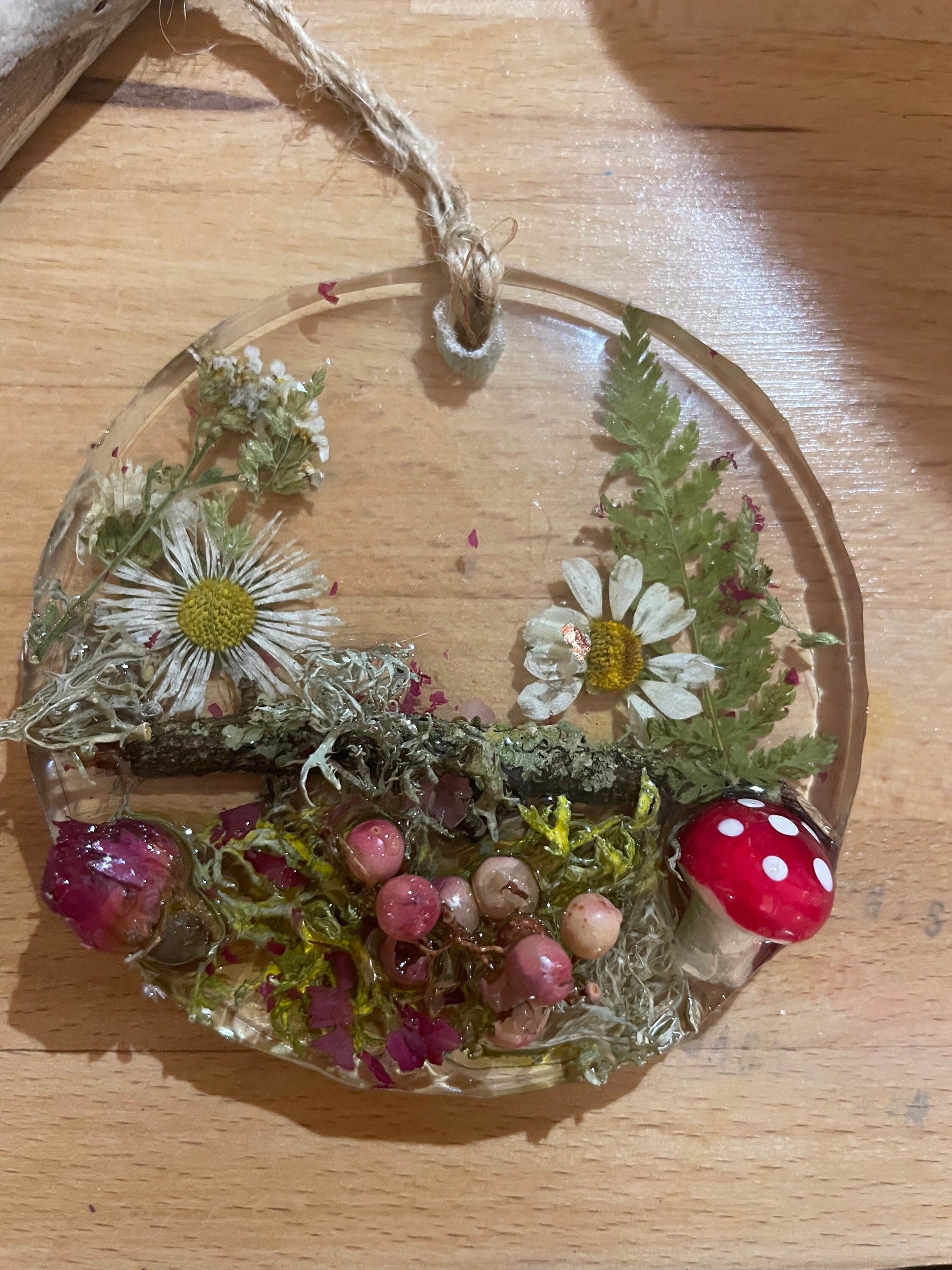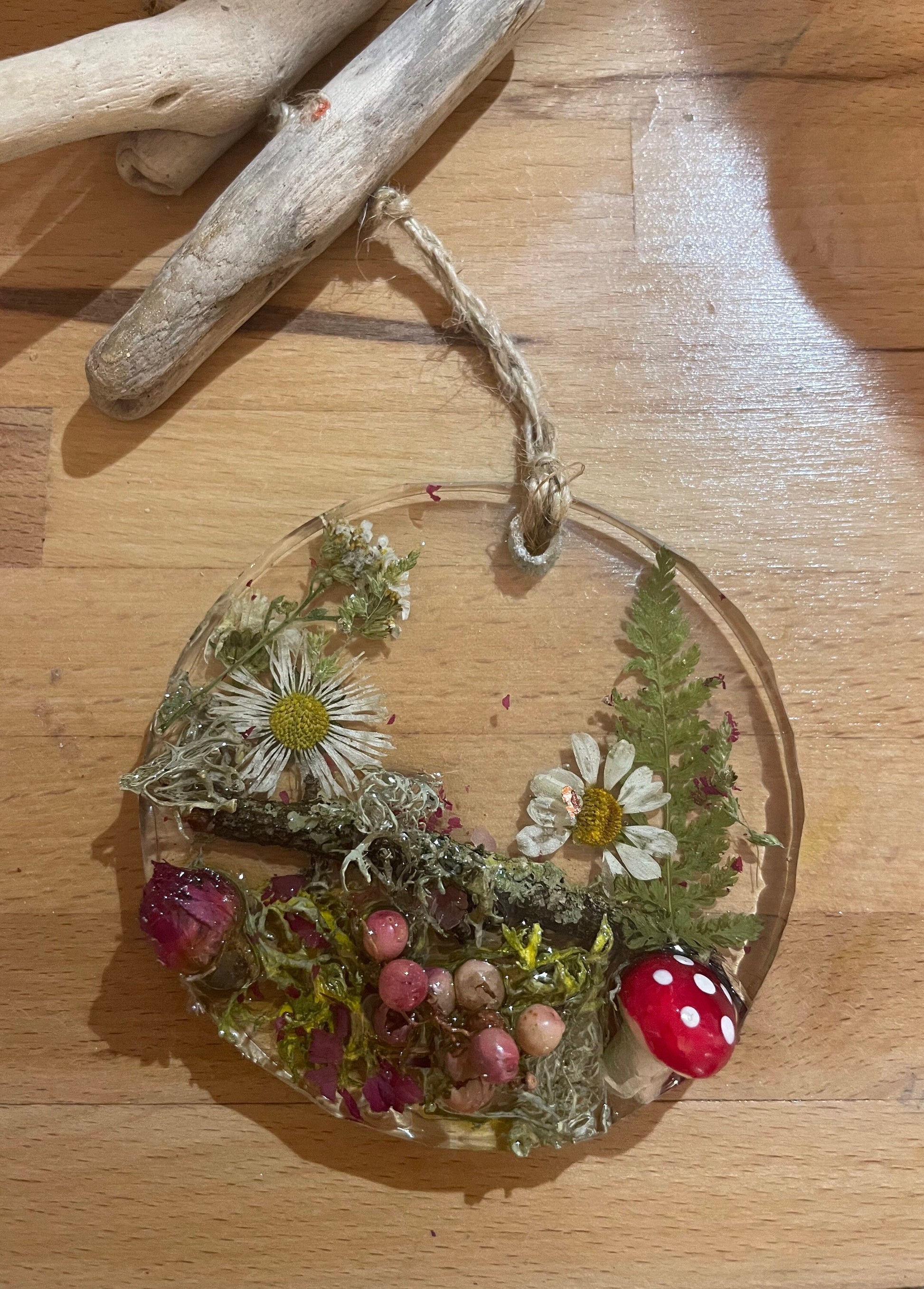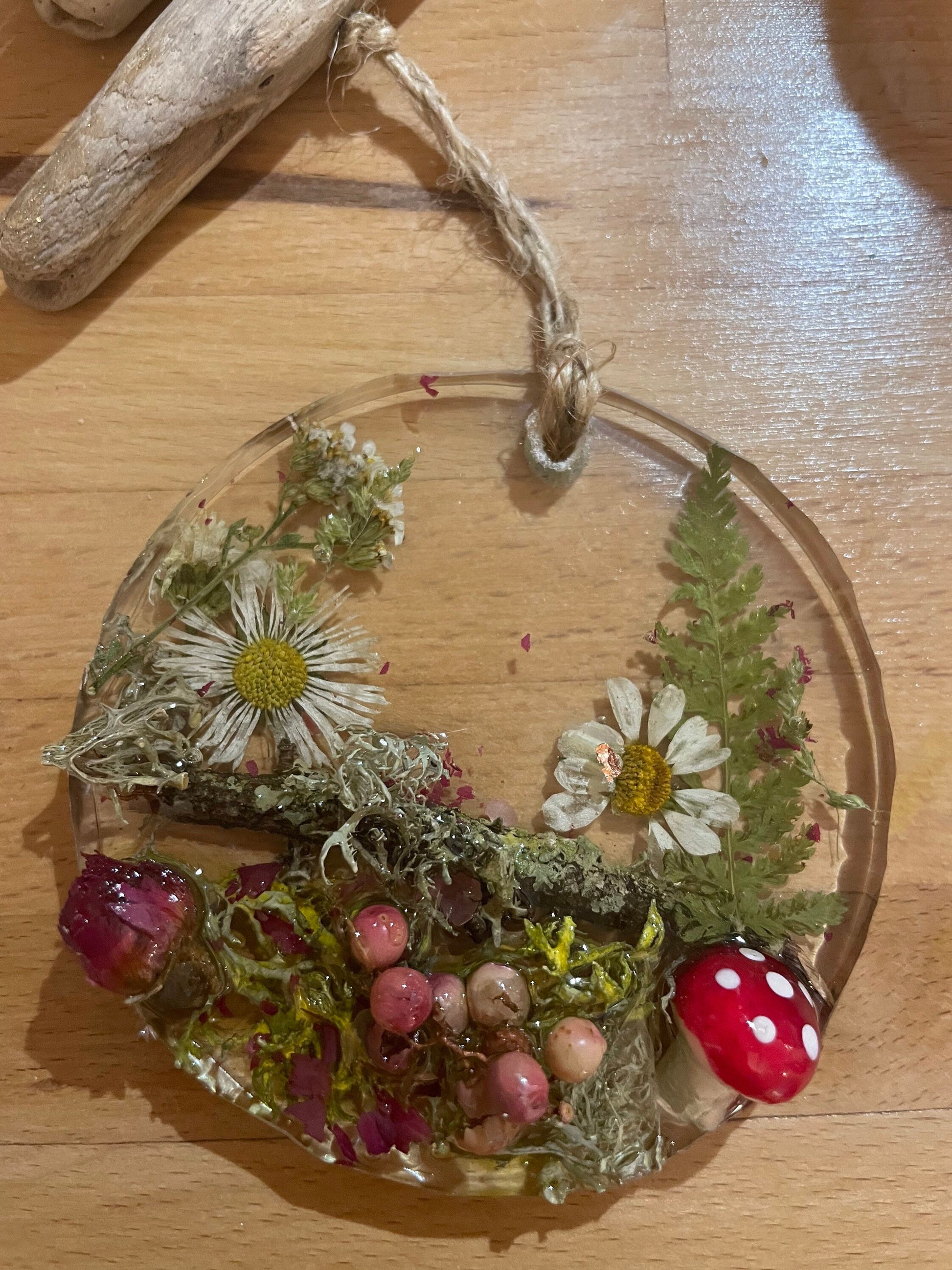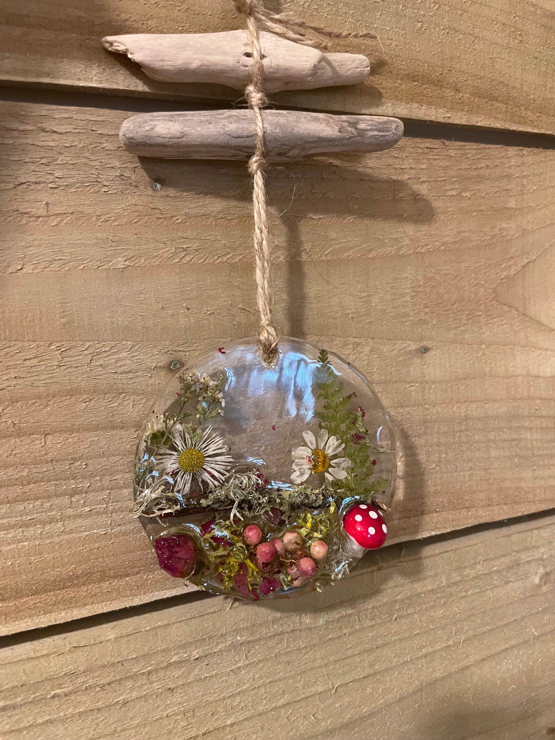 Toadstool in woodland resin hanging decor, whimsical woodland gift for nature lover, real flowers and greenery cottagecore mobile, Christmas gift for her.
