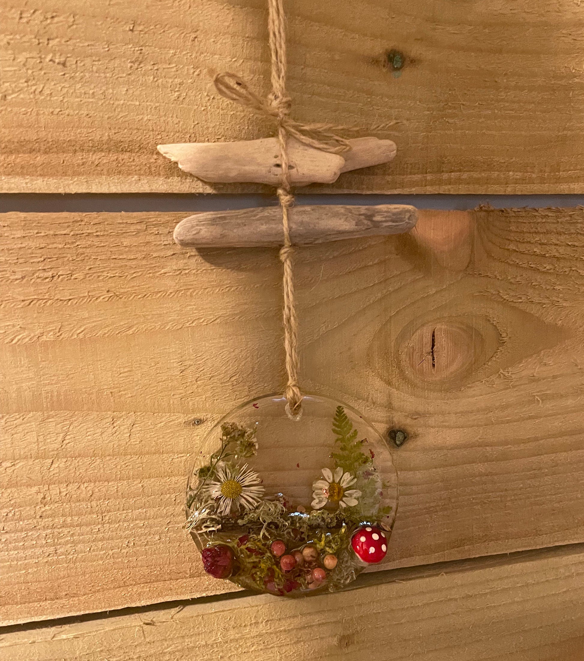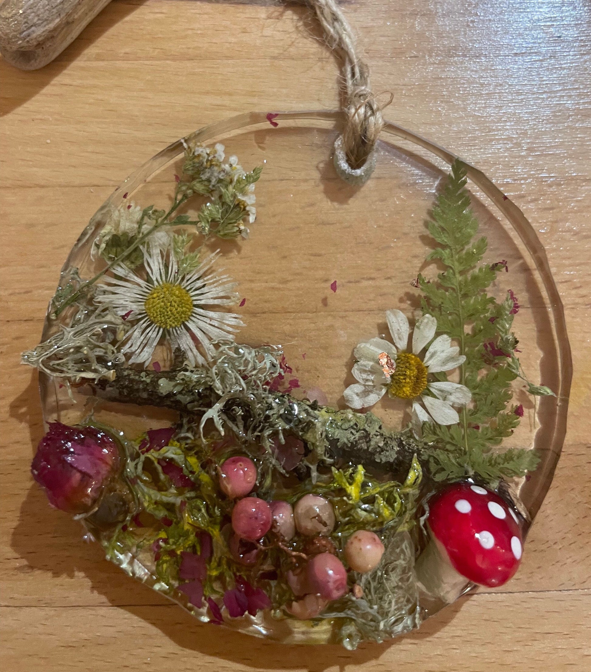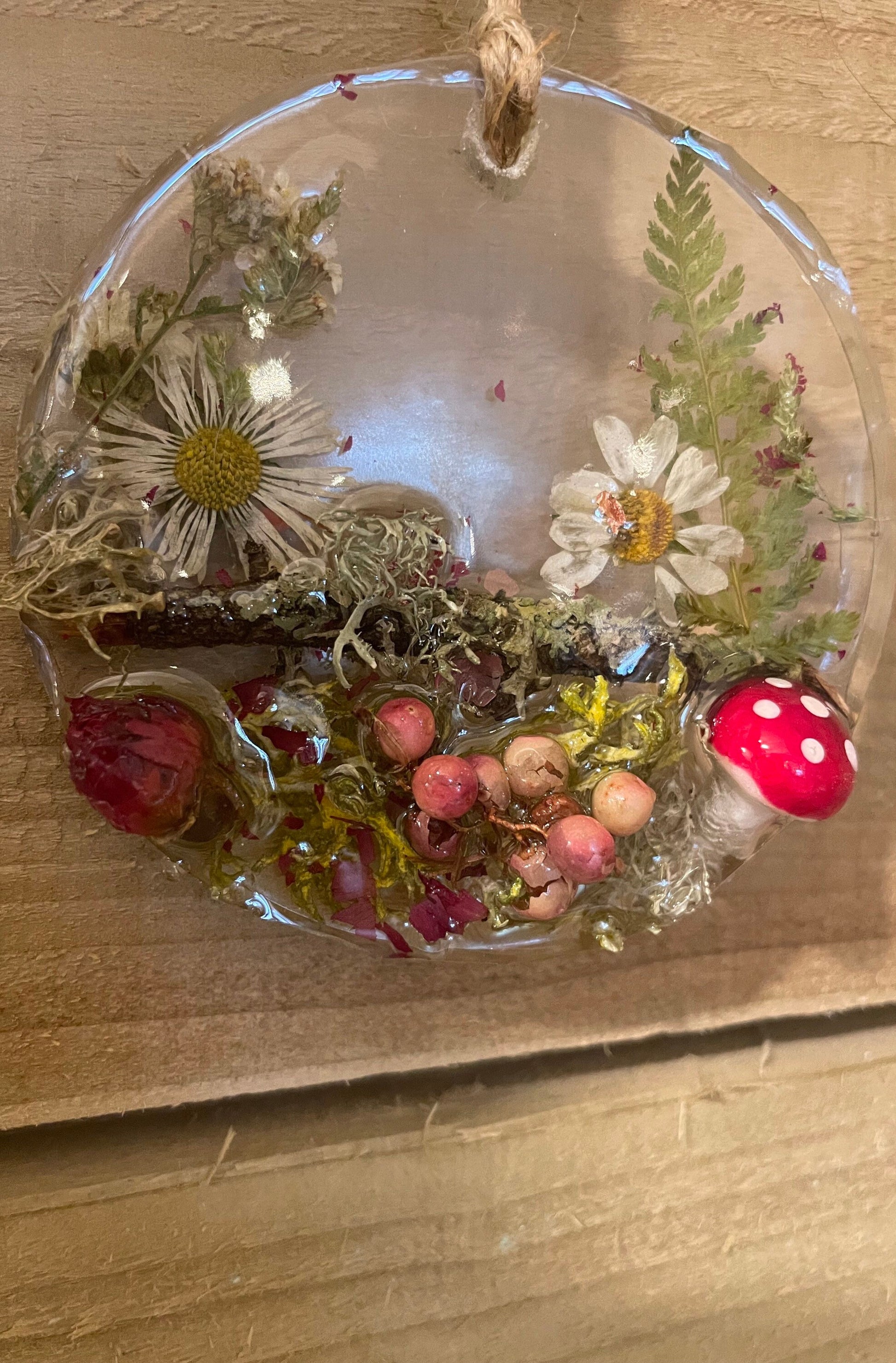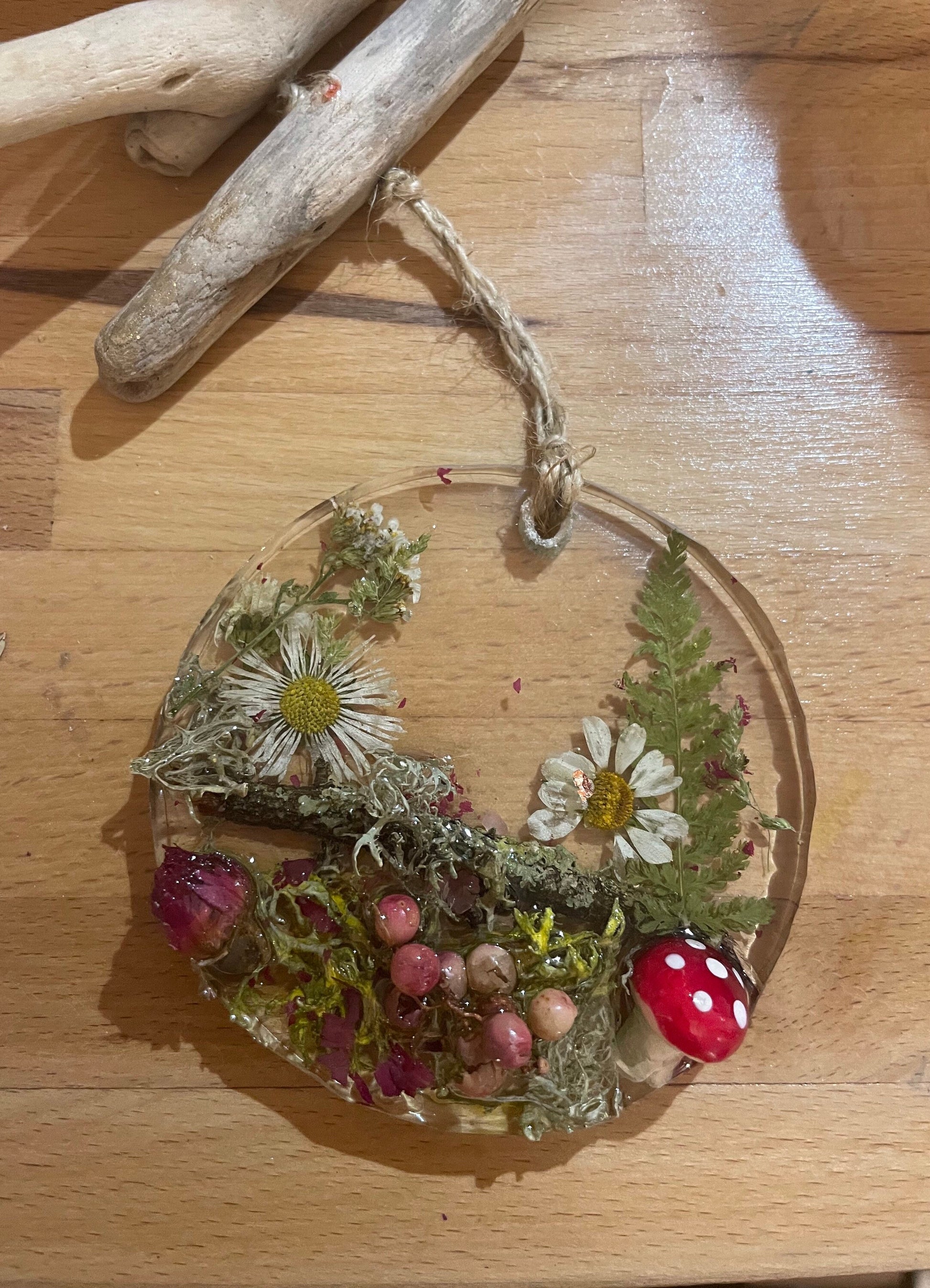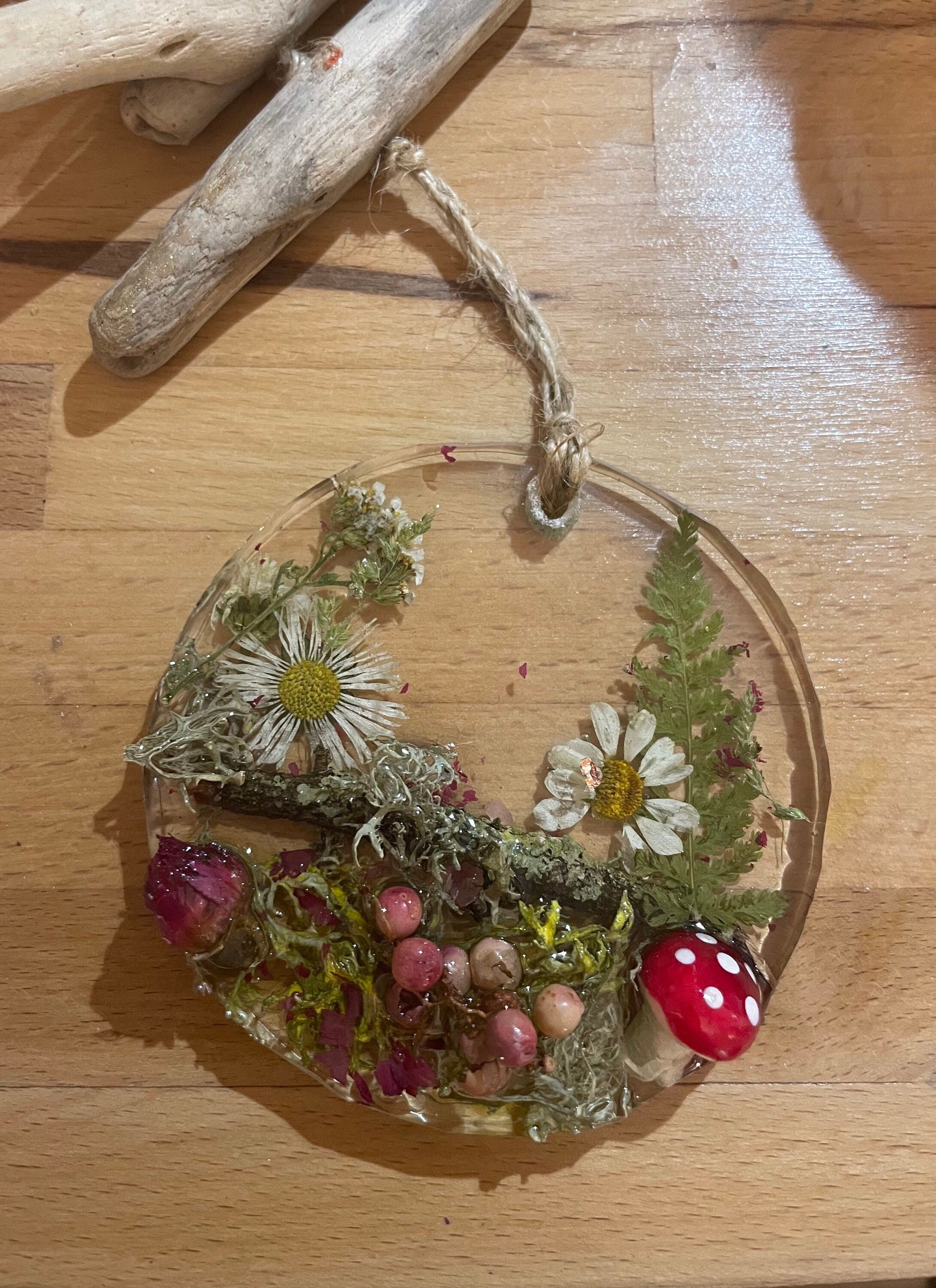 Toadstool in woodland resin hanging decor, whimsical woodland gift for nature lover, real flowers and greenery cottagecore mobile, Christmas gift for her.
