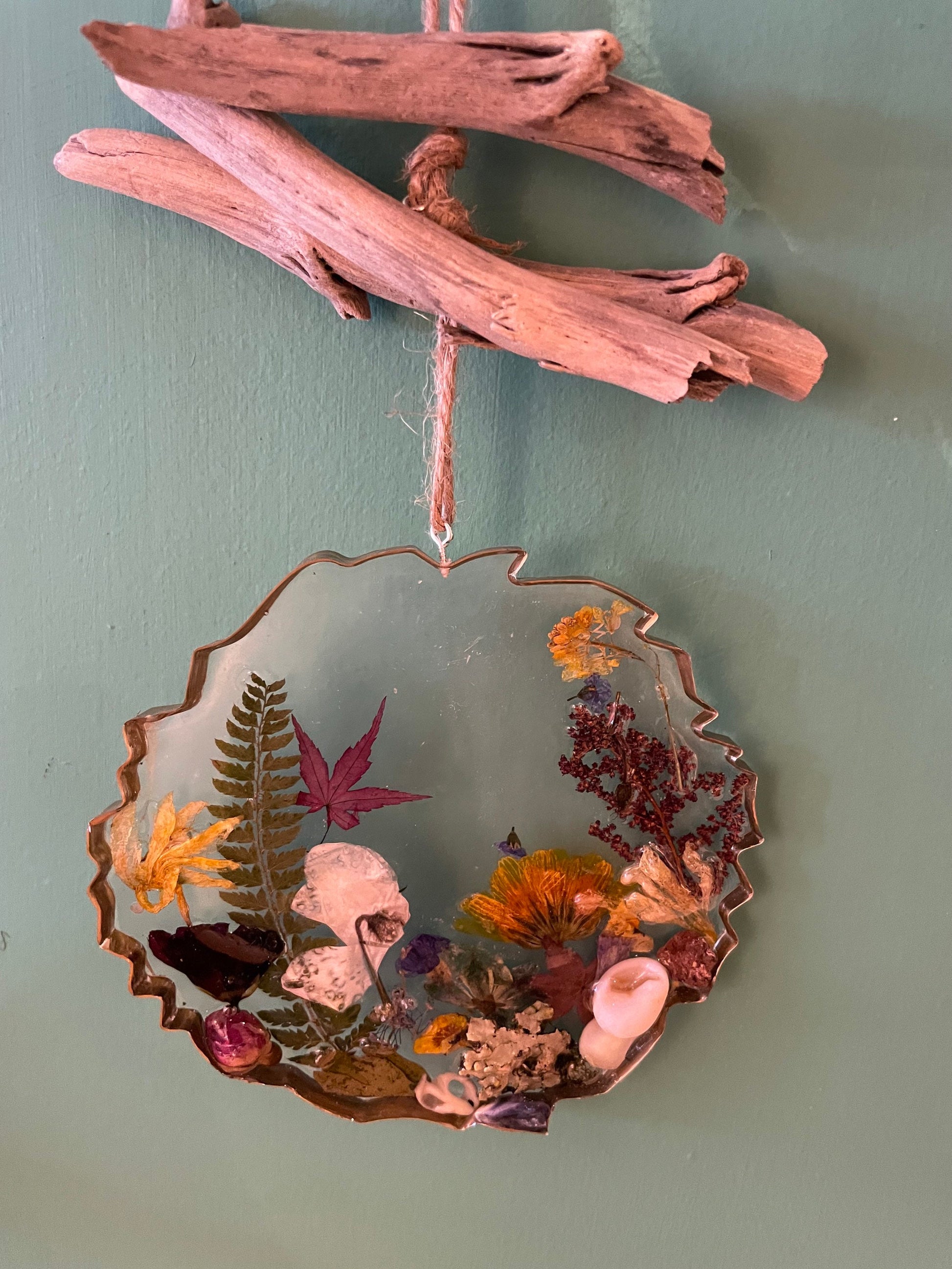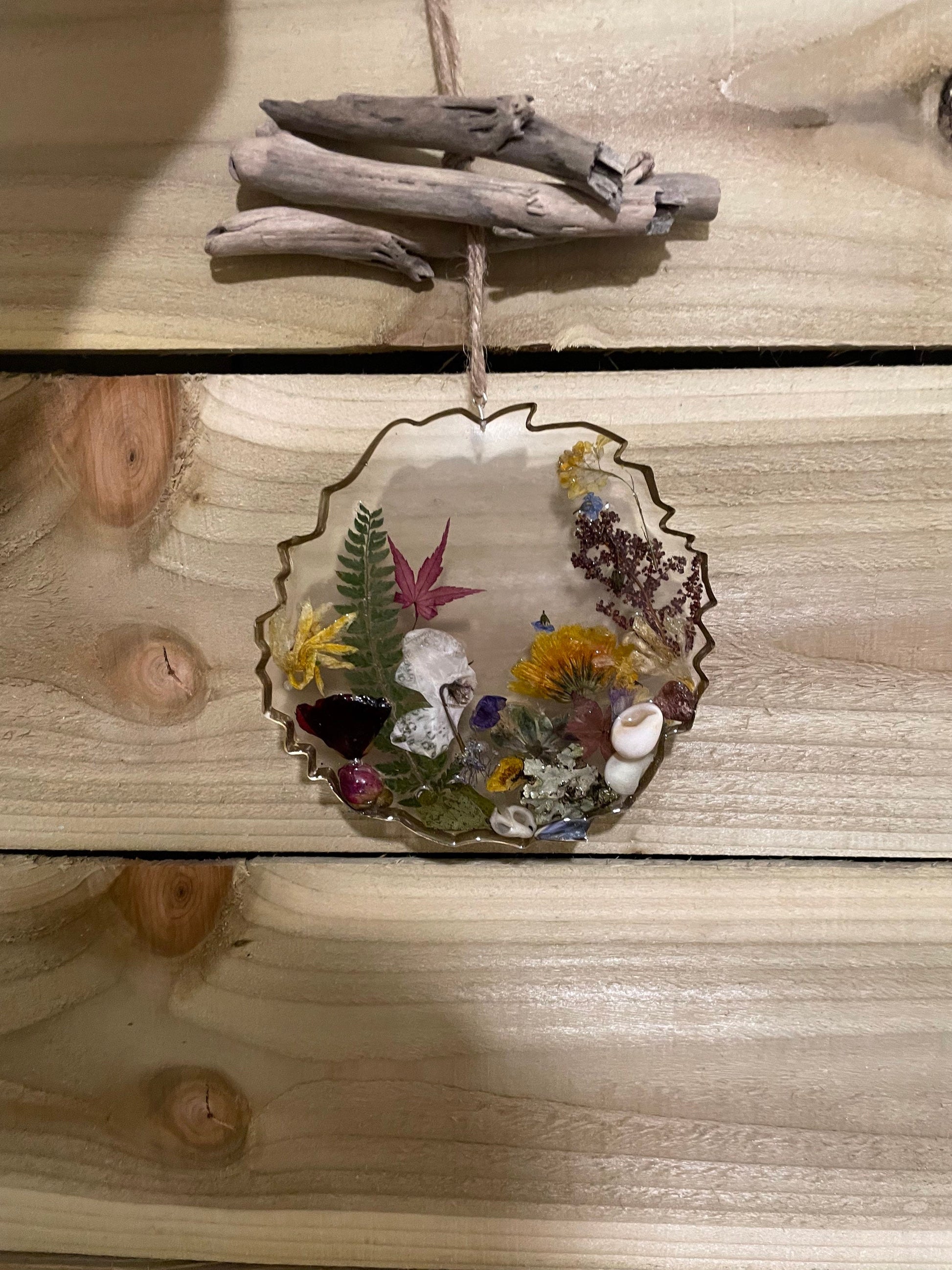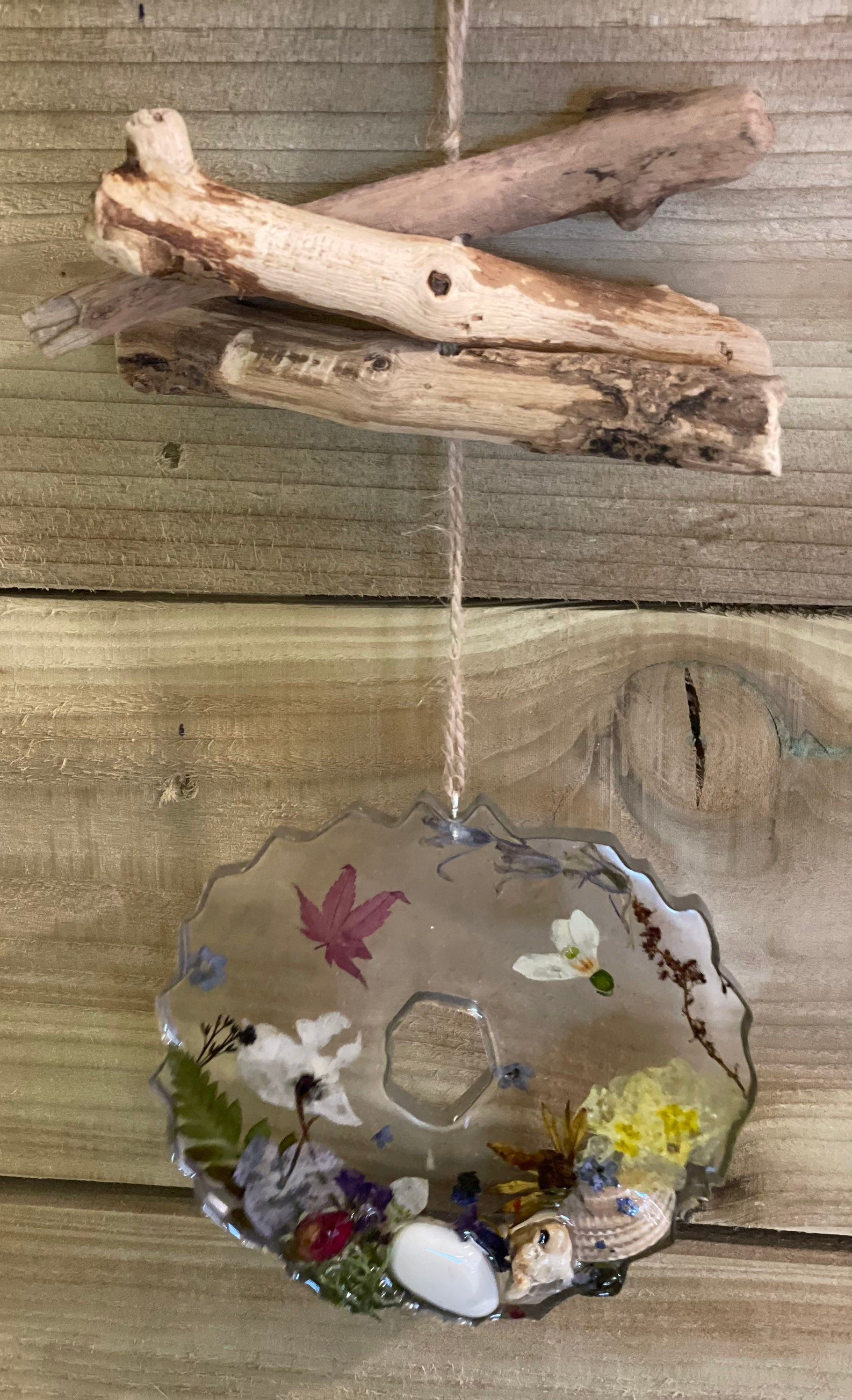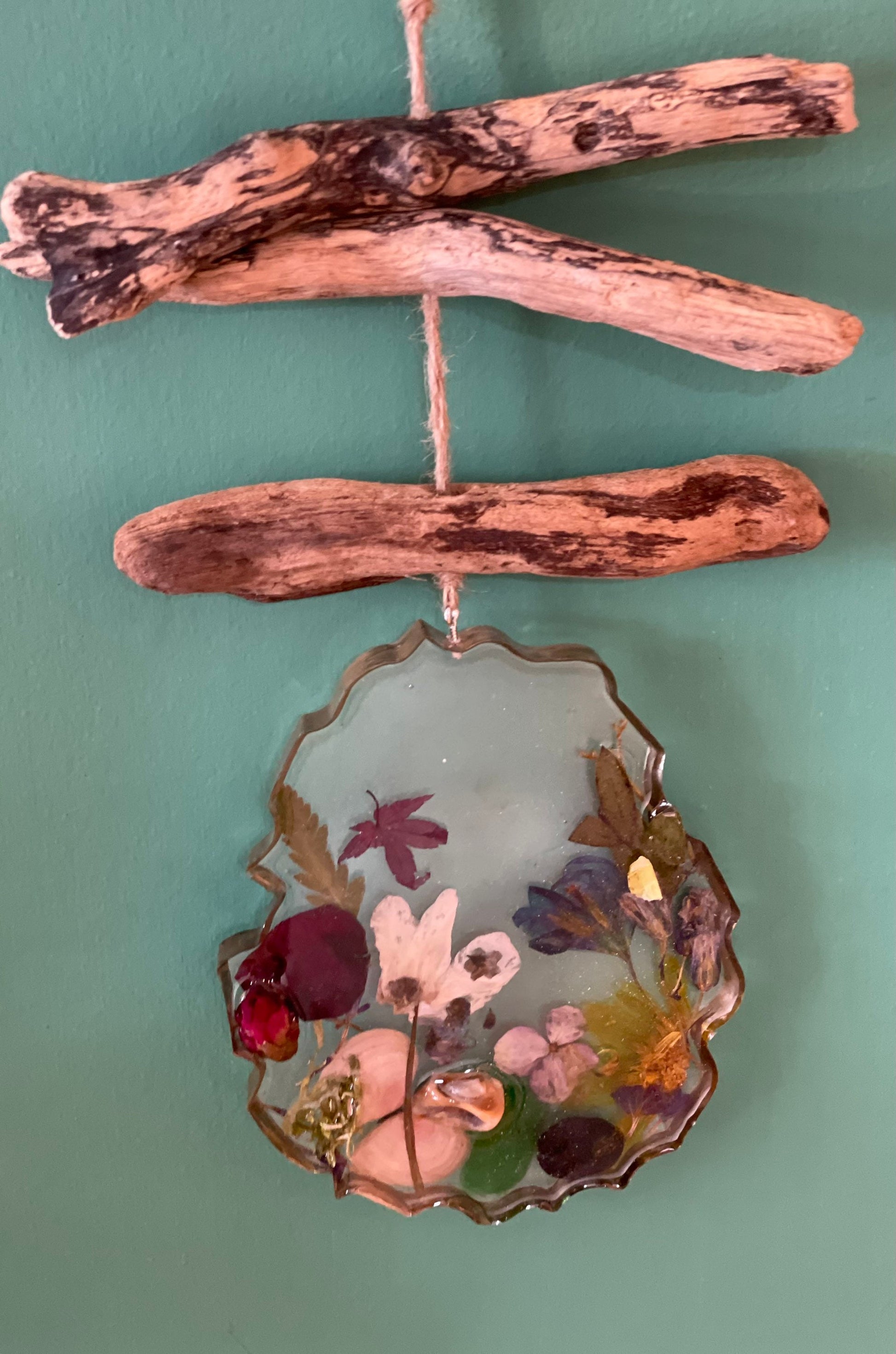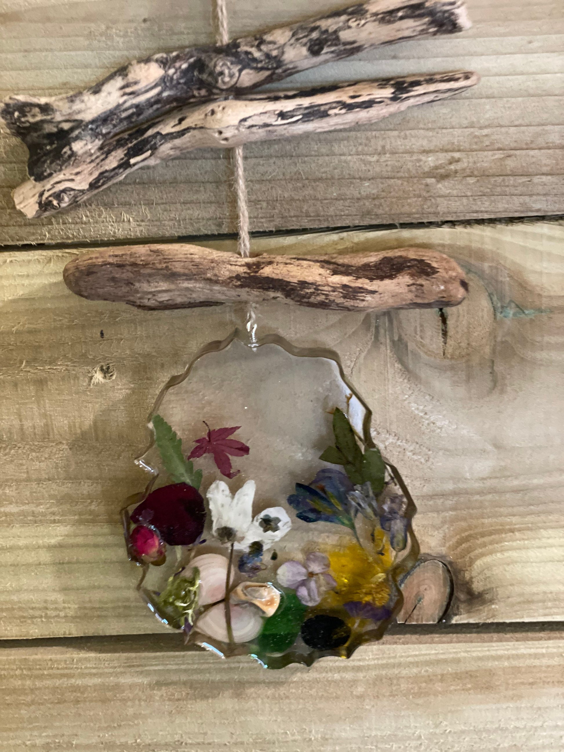 A beautiful woodland scene made from real flowers and leaves , set in resin and hung on cord with pieces of real drift wood to complete the rustic outdoors feel of this item.